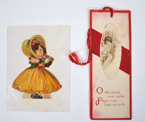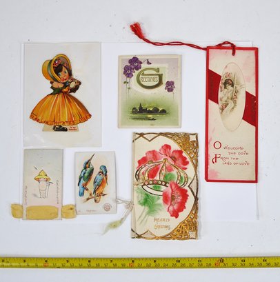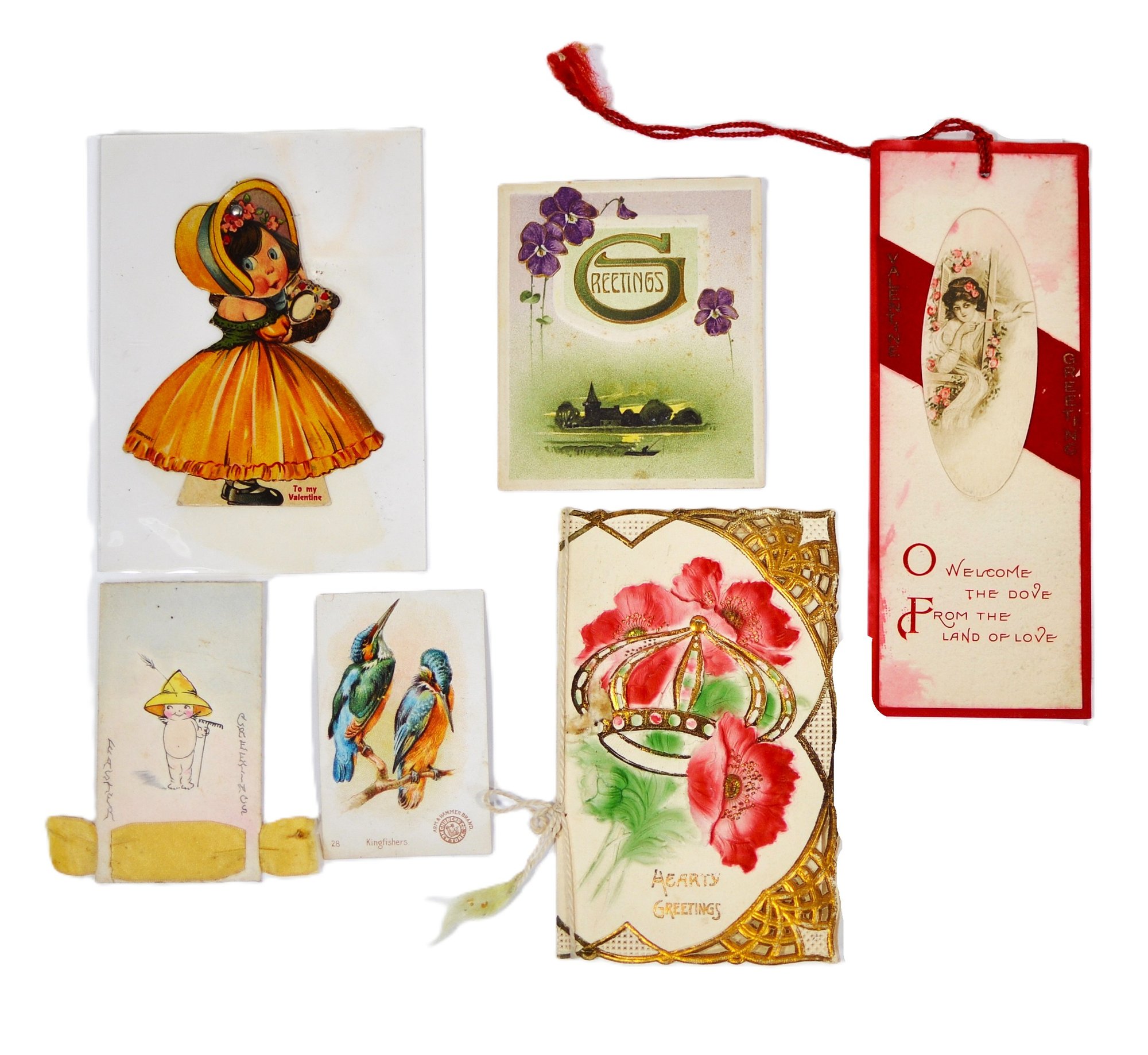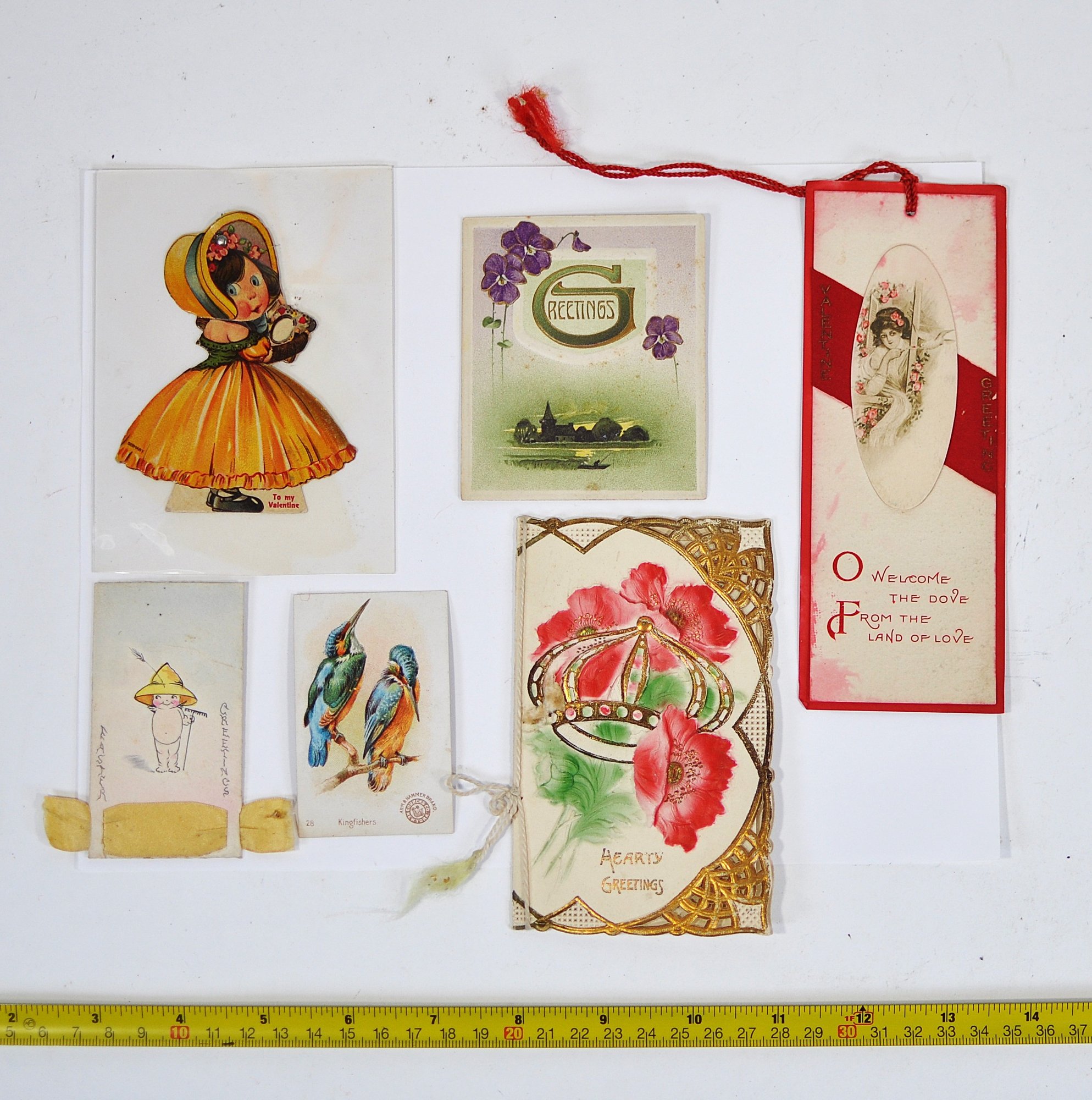 Offered is a mixed group of antique Valentine and greeting cards, dating from the late 19th to early 20th century. The lot includes illustrated and die-cut examples, embossed and gilt-decorated cards, a ribbon-tied Valentine bookmark-style card, and pictorial designs featuring children, florals, birds, and romantic verse. Several retain original strings, ribbons, or interior inscriptions.