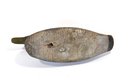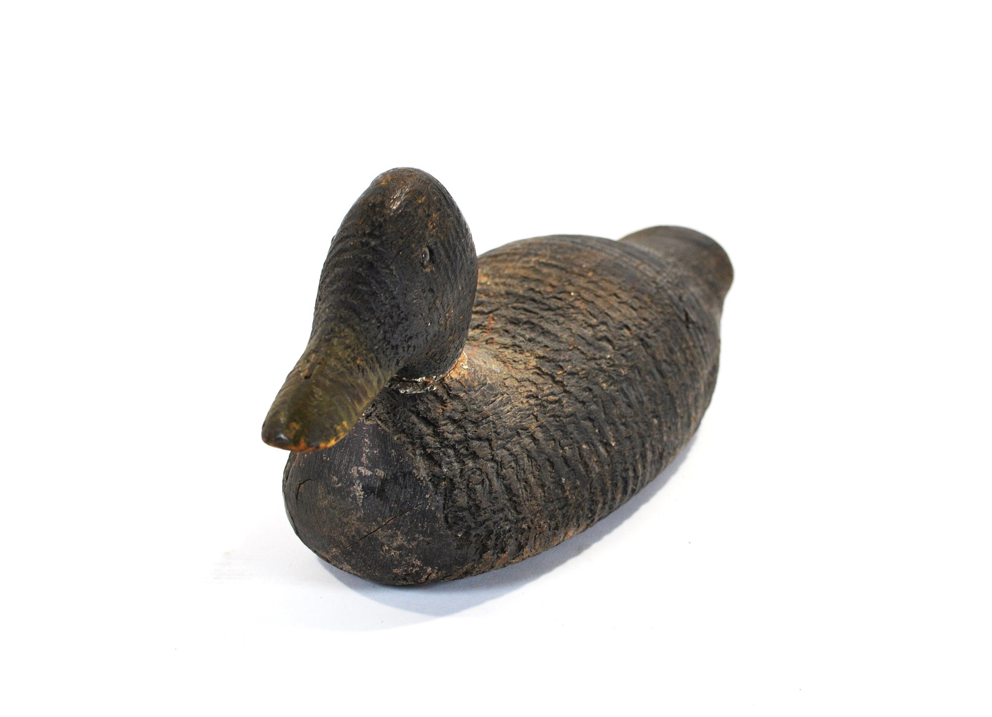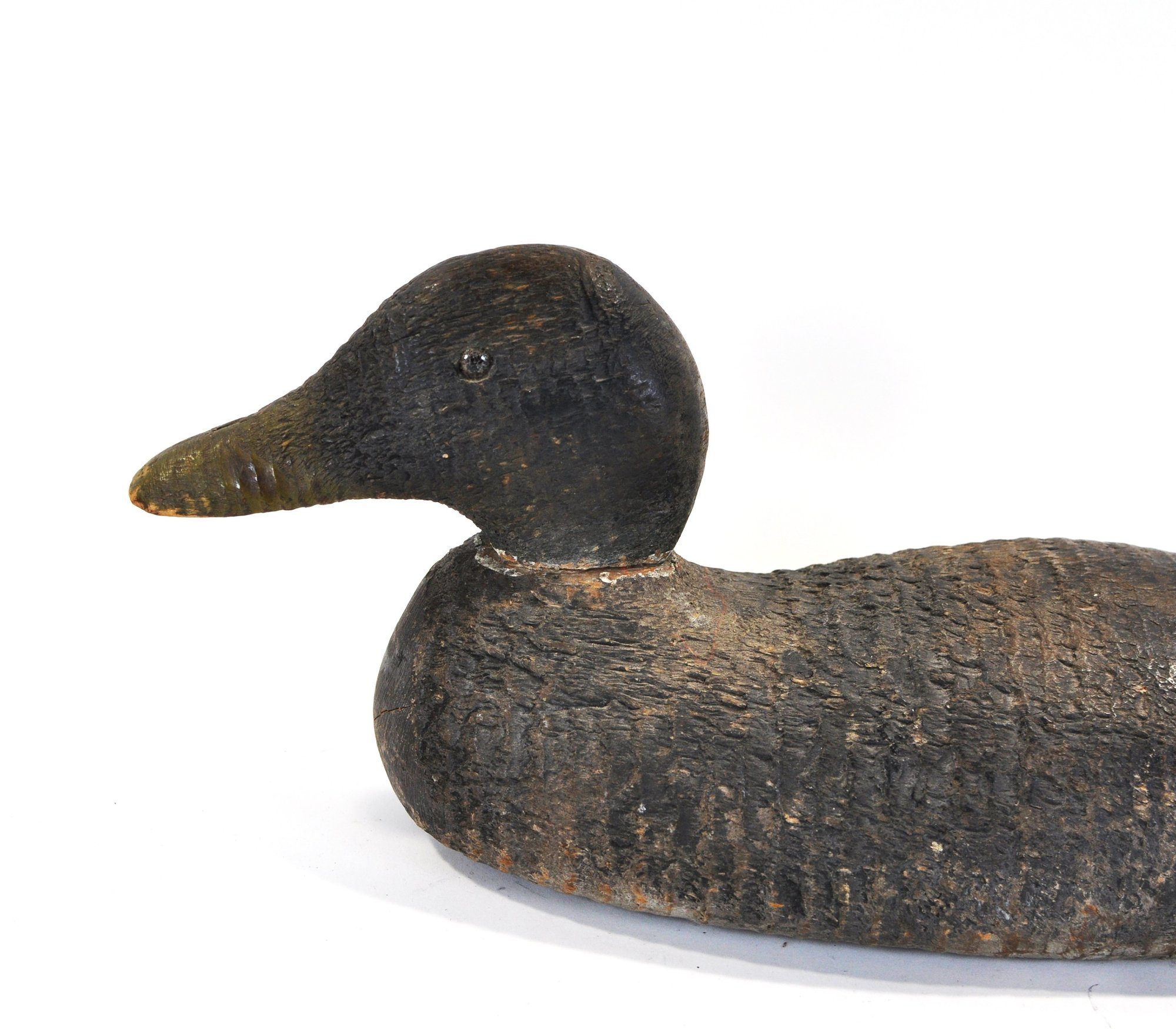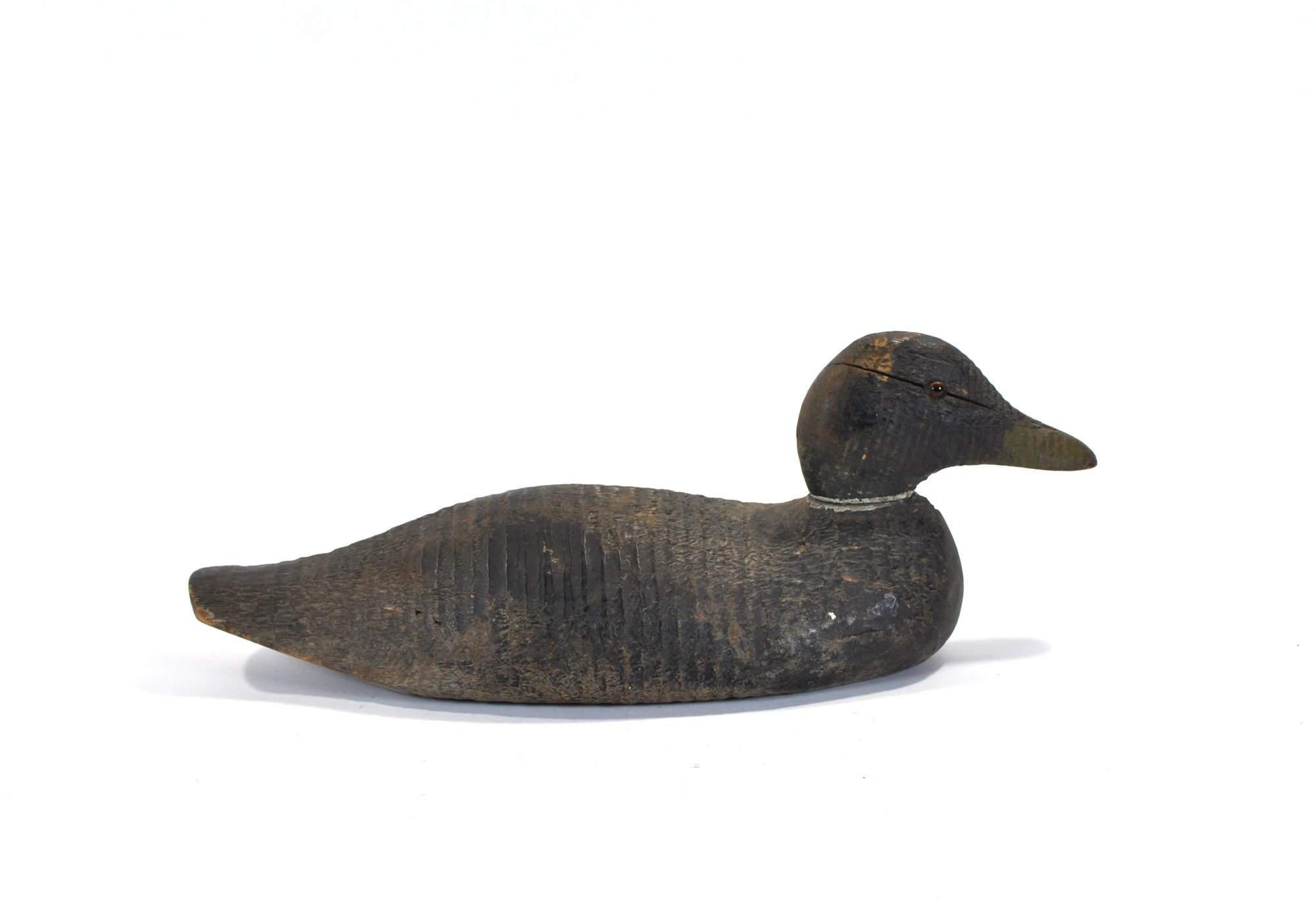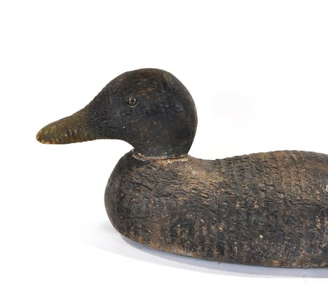 Early hand-carved wooden duck hunting decoy featuring a rounded head, carved feather texture, and original painted surface in dark brown with white breast. The decoy retains glass inset eyes.
