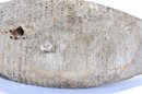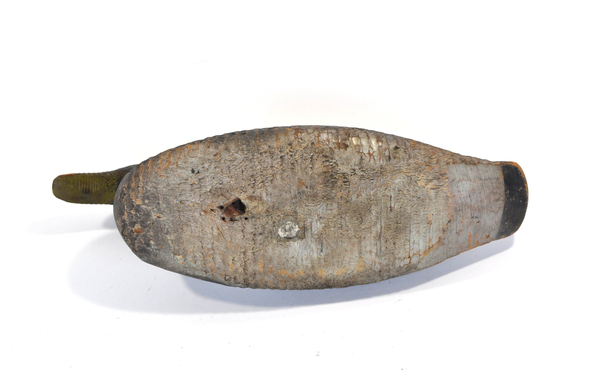 The body shows strong hand-carving marks and aged working paint, giving the piece authentic folk art and working-decoy character typical of early American hunting decoys. Signed "Victor".