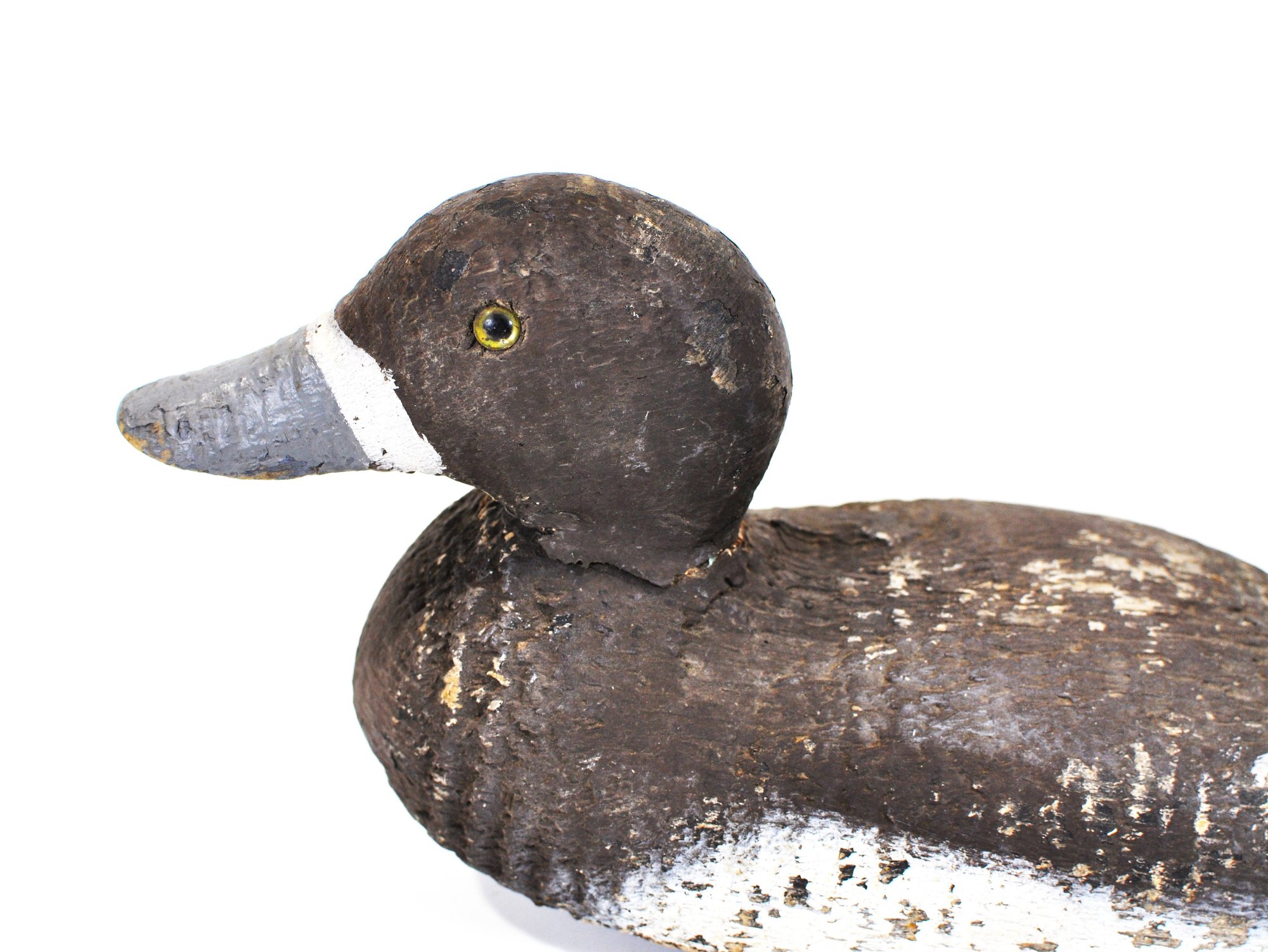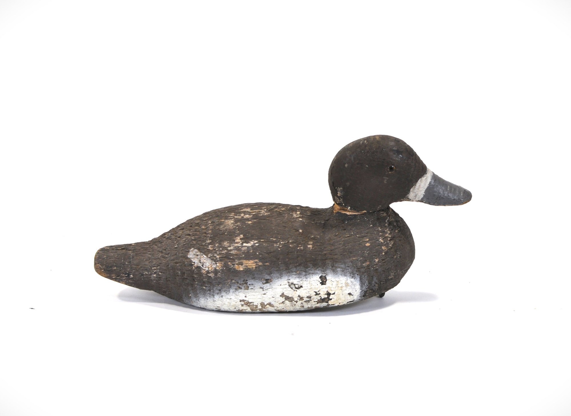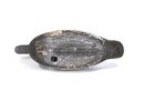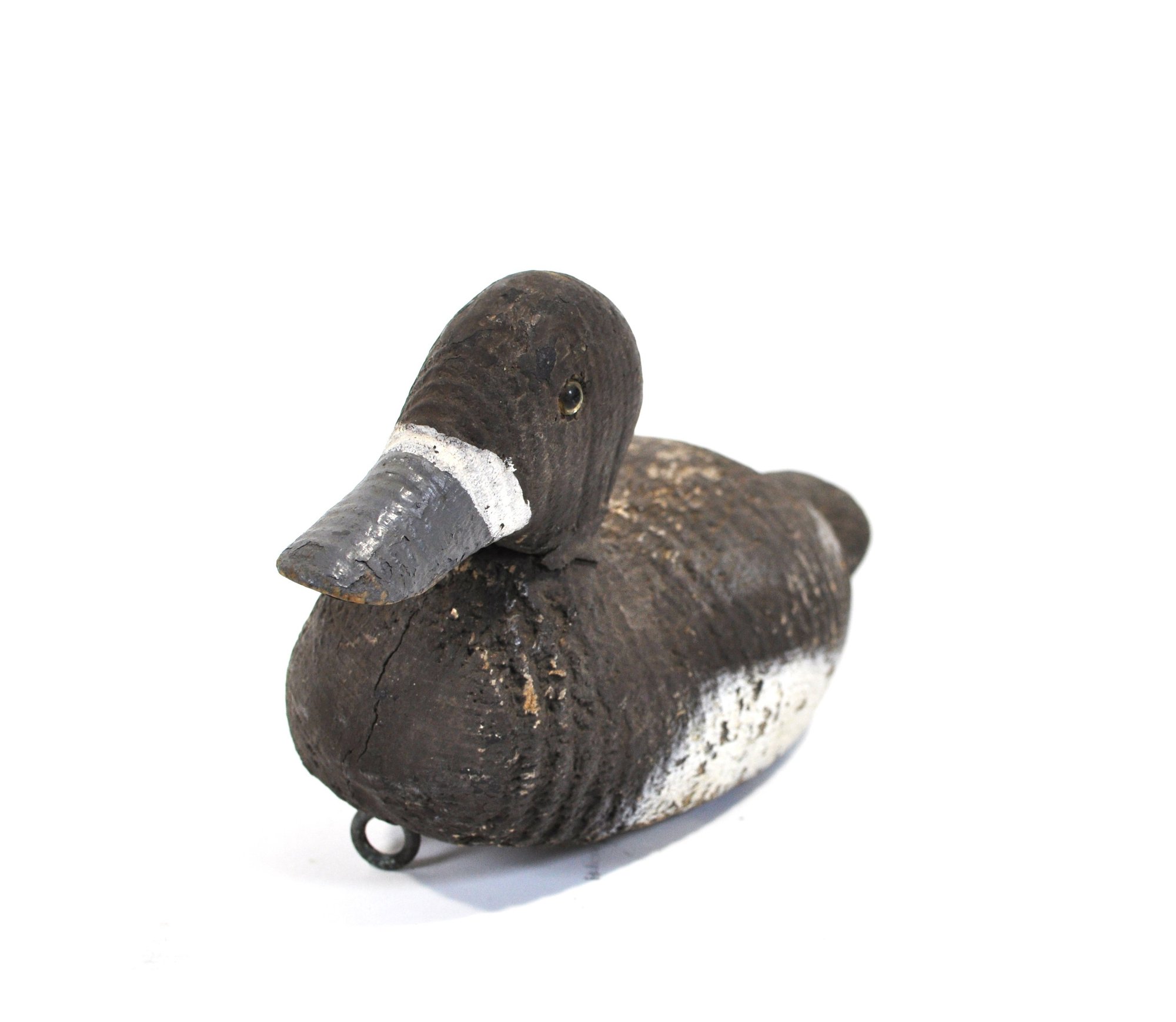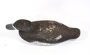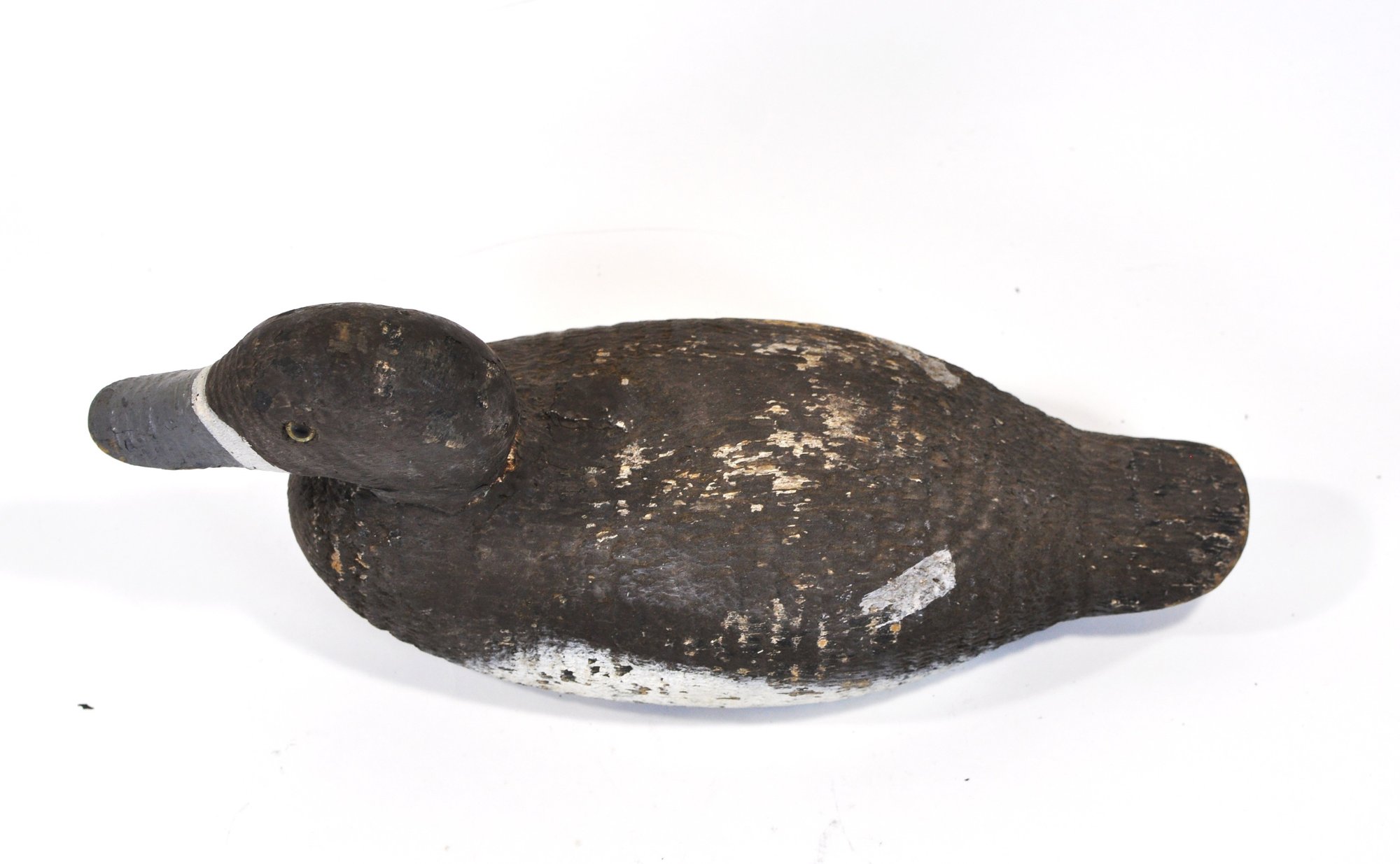 Early hand-carved wooden duck hunting decoy featuring a rounded head, carved feather texture, and original painted surface in dark brown with white breast. The decoy retains glass inset eyes and a metal keel weight on the underside.
