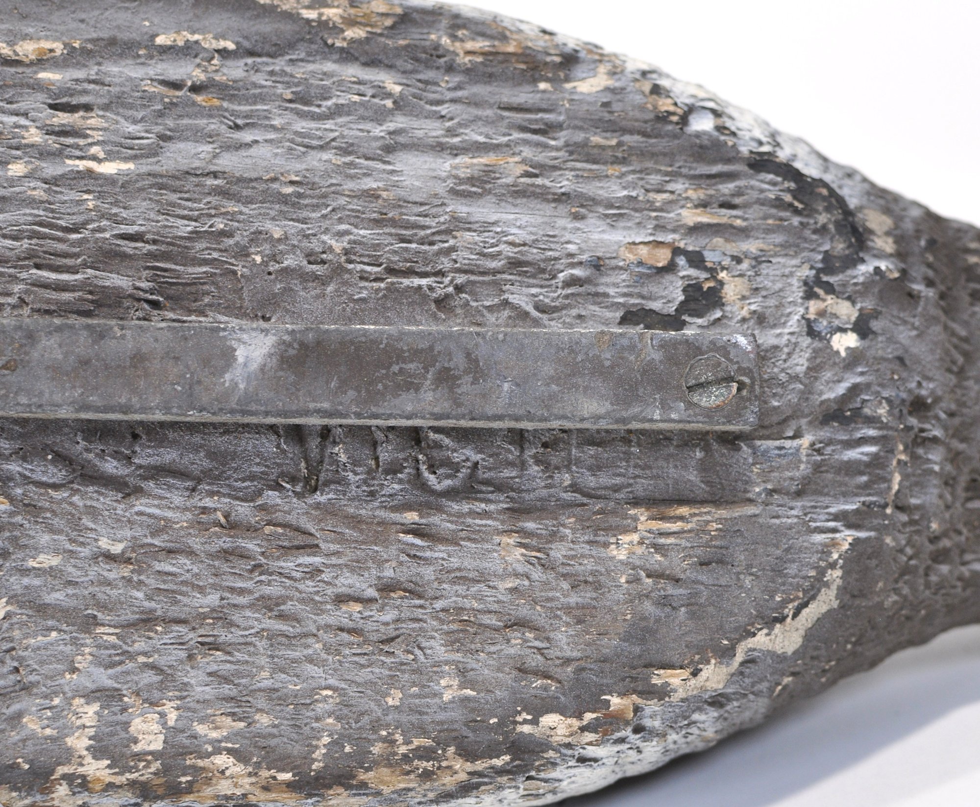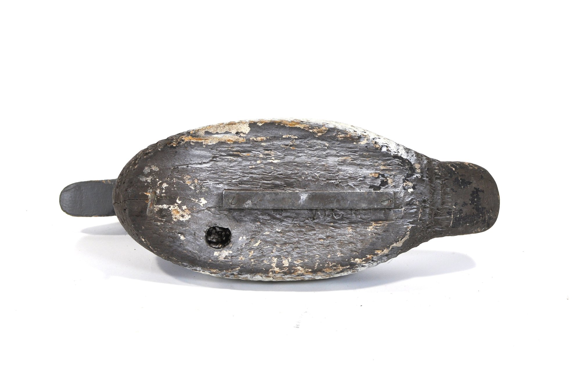 Condition: noticeable wear from age and field use including paint loss, surface wear, and patina. Keel weight present on underside. Displays well with strong rustic character.
