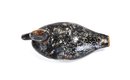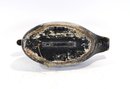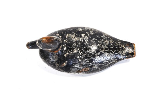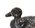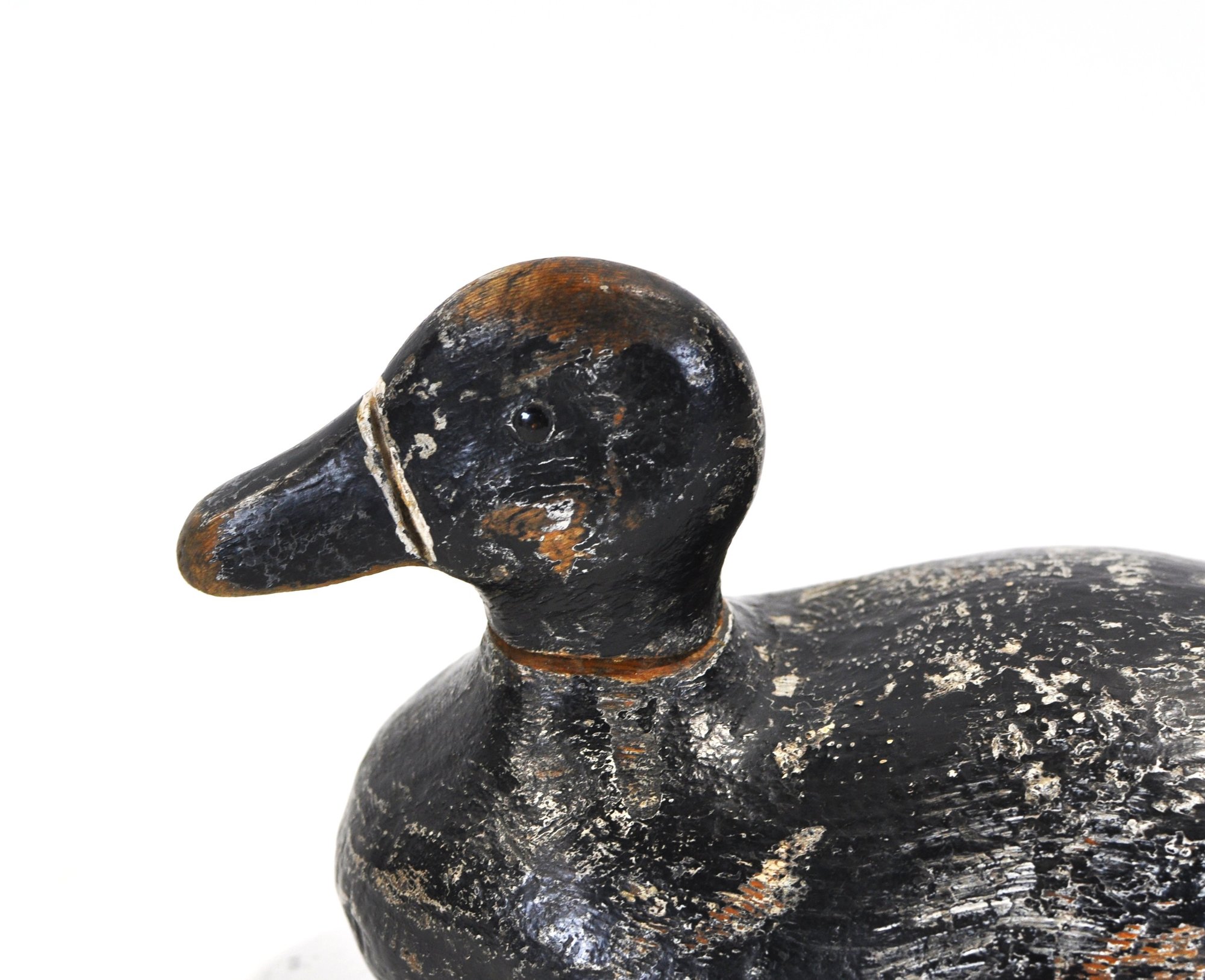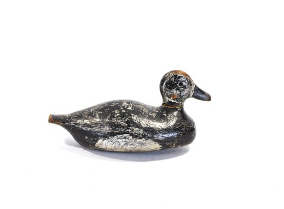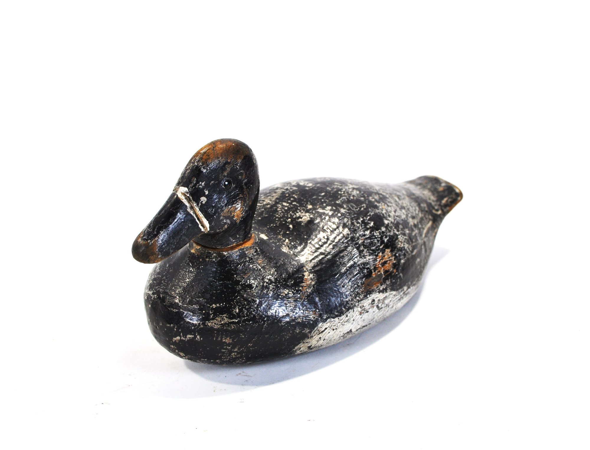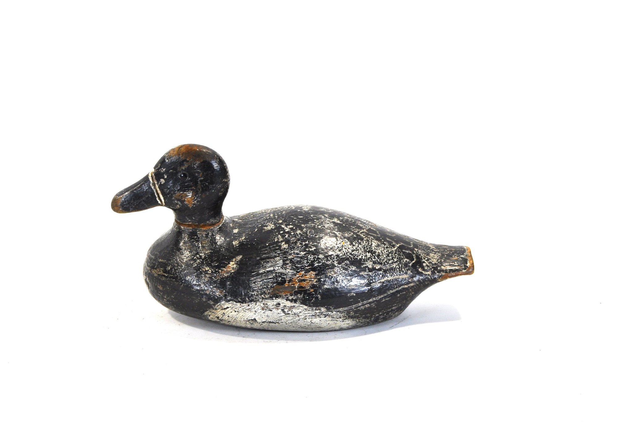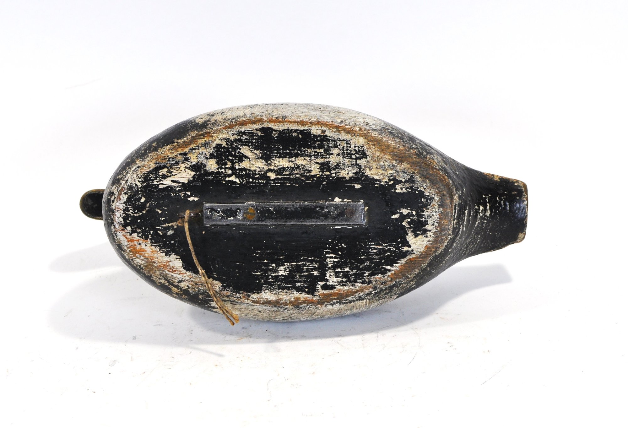 Early hand-carved wooden duck decoy featuring a classic low-profile working form and remnants of original black and white painted surface. The heavily worn finish reveals layers of age and use, with attractive surface texture and natural patina consistent with prolonged exposure to the elements.