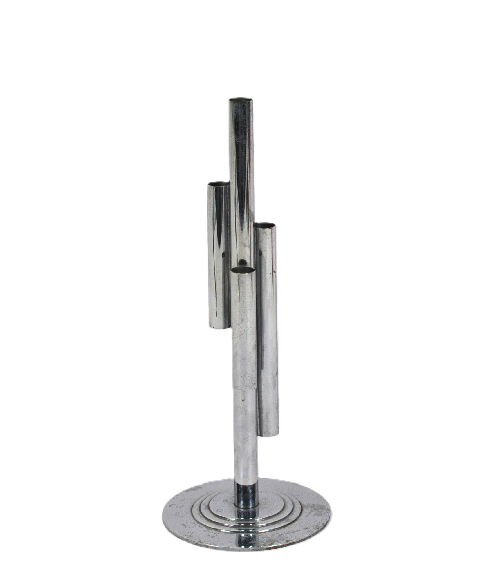 Lovely Art Deco chrome bud vase designed by Ruth and William Gerth and manufactured in the 1930's by Chase. Classic Art Deco design with tubes of various heights and a stepped base.