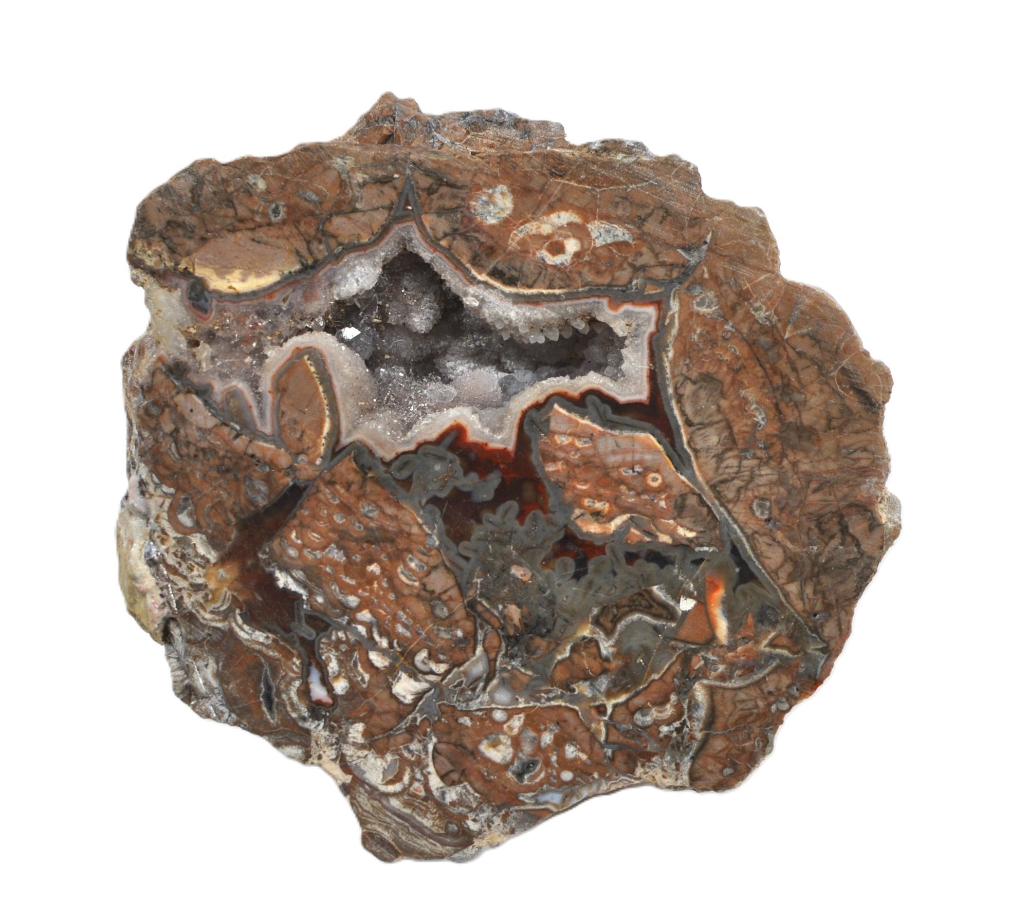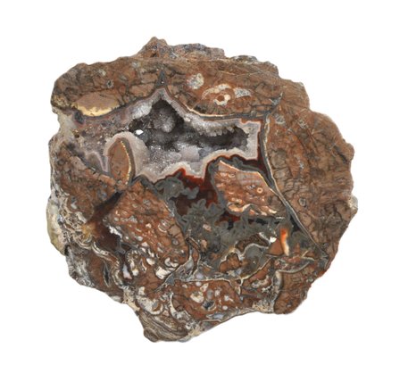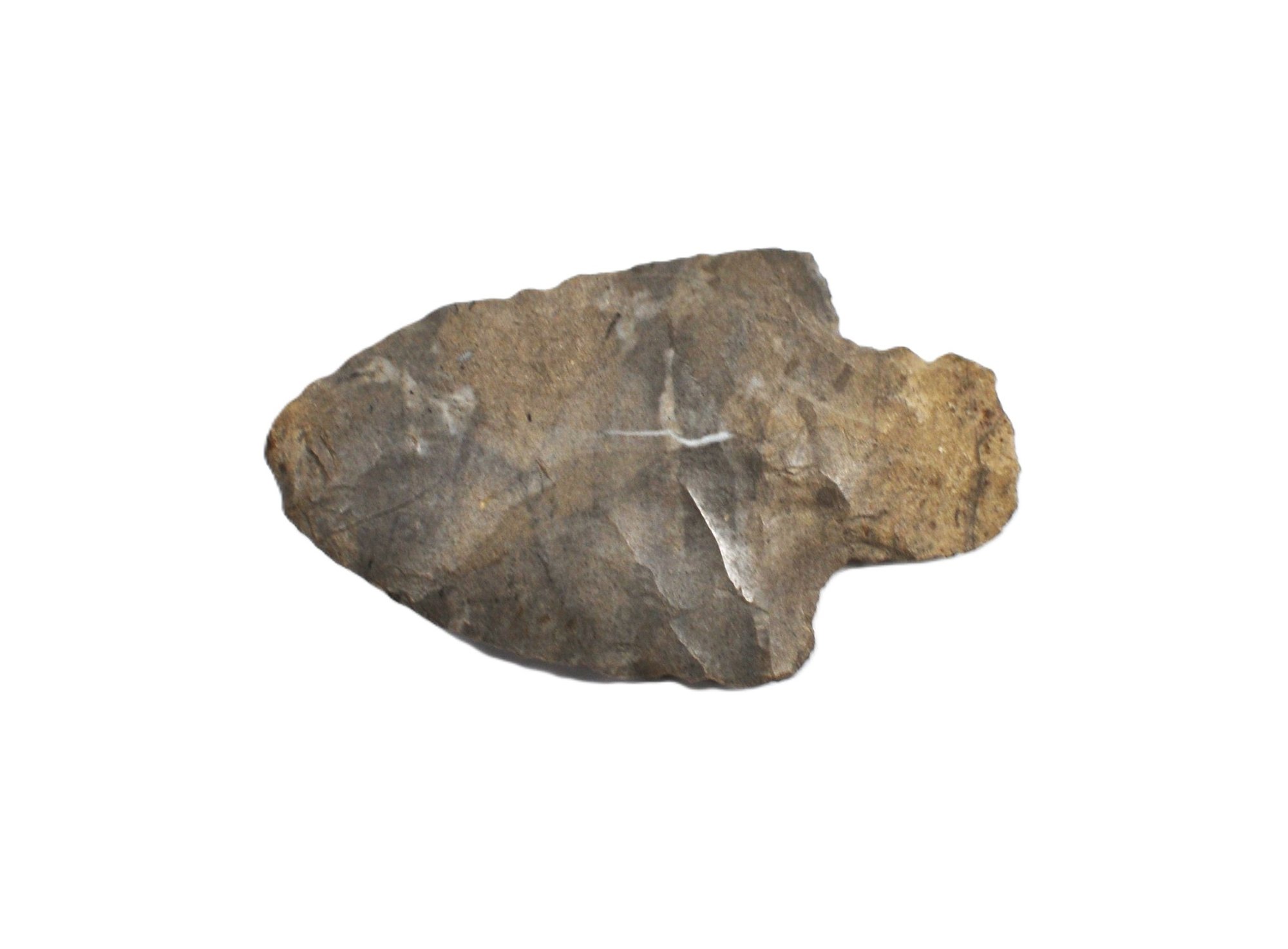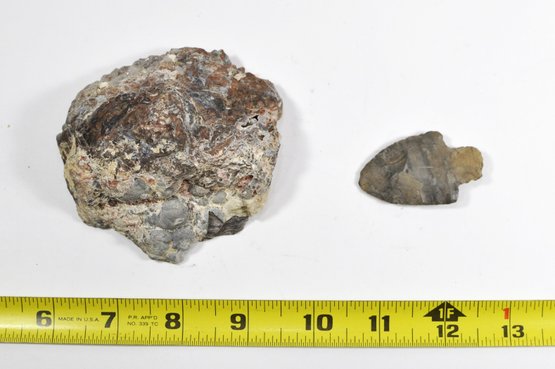 Two-piece lot featuring a natural agate geode with a crystal-lined cavity and banded patterns, accompanied by a small stone arrowhead / projectile point. Both pieces are unpolished and in as-found condition. Nice natural textures and display appeal.