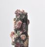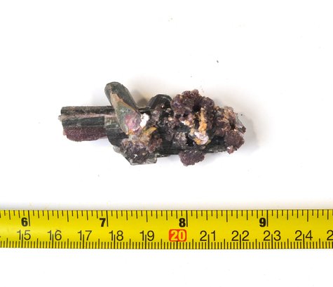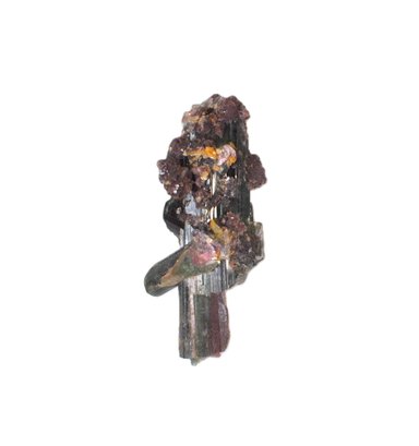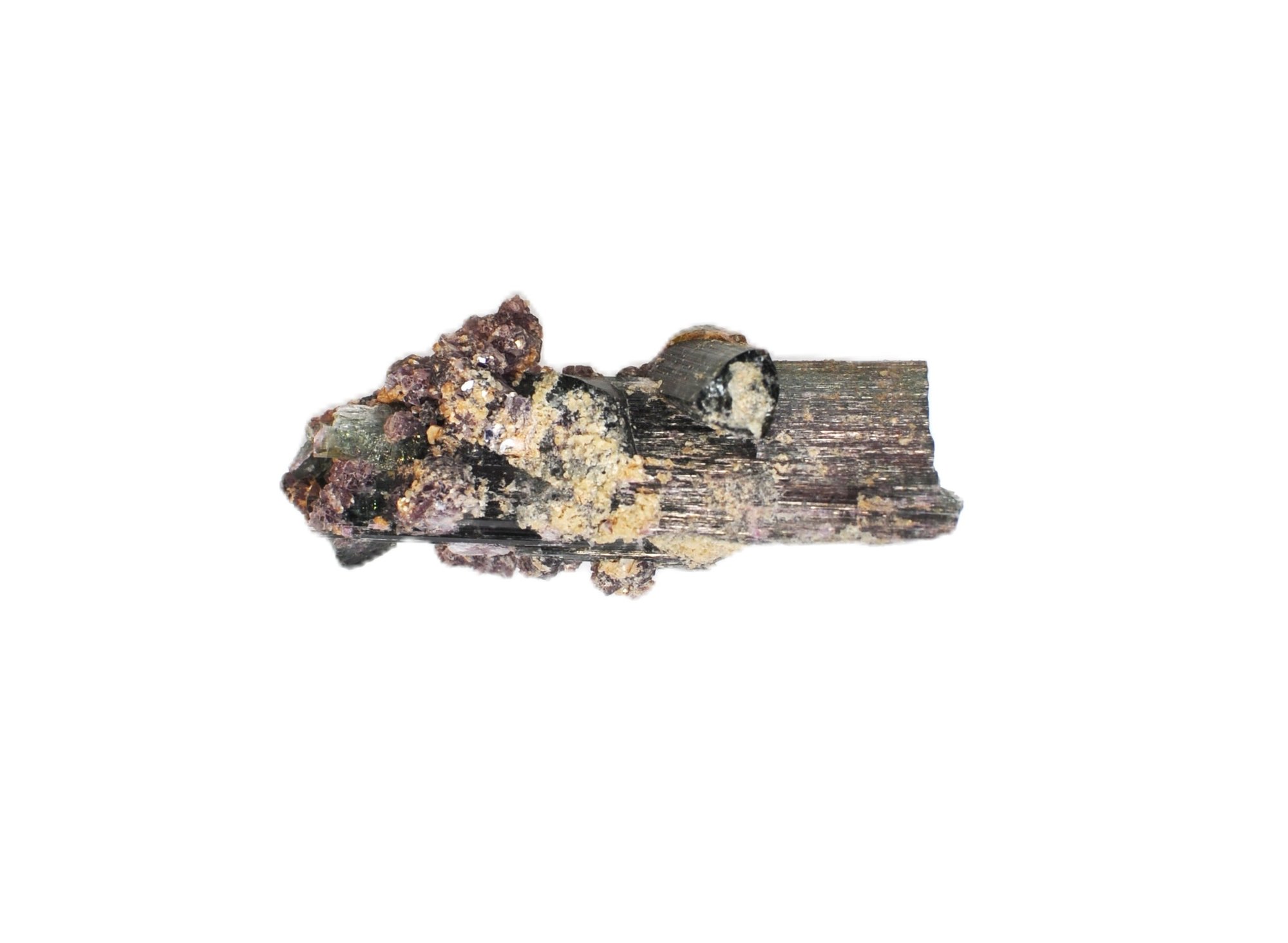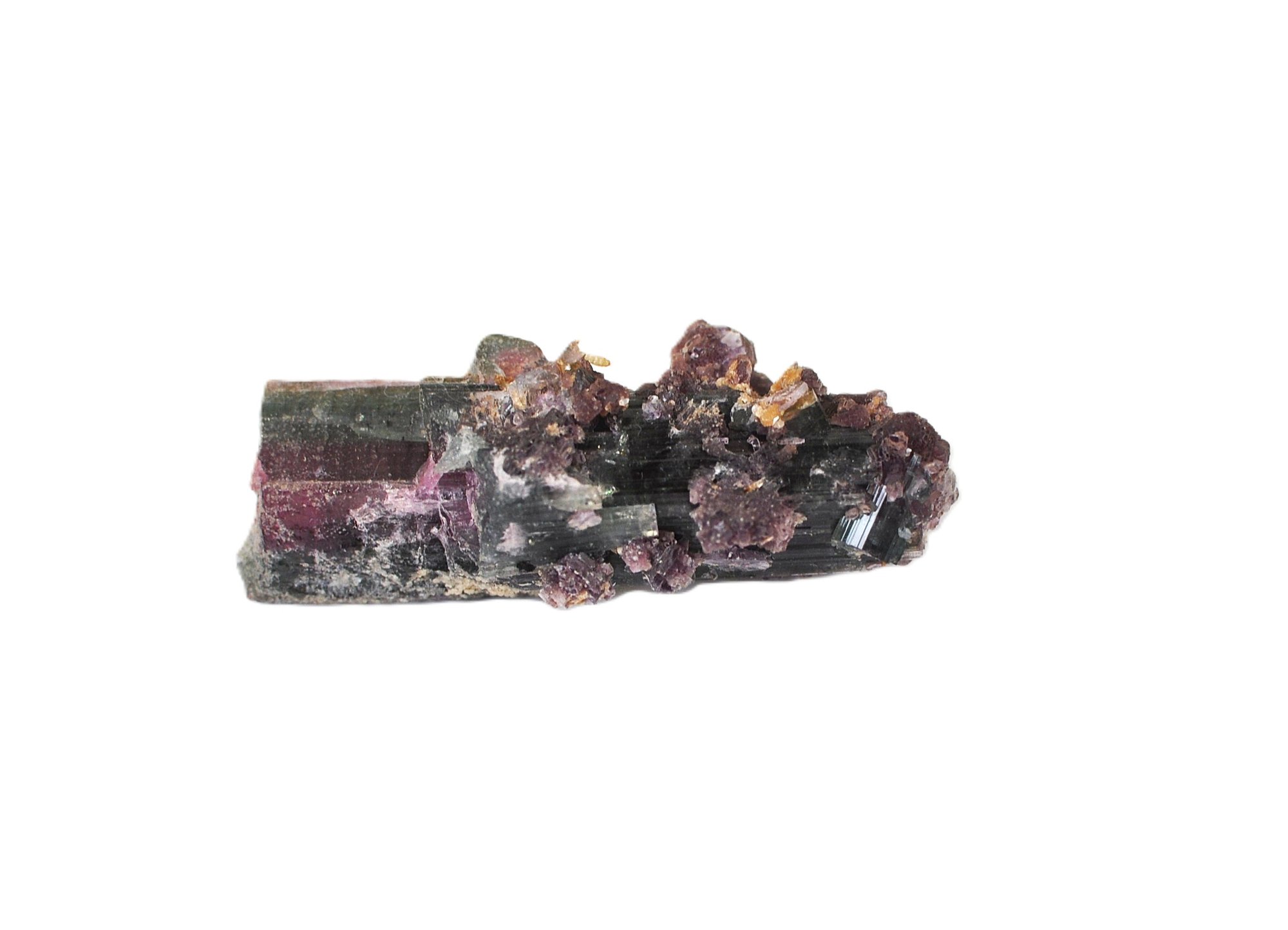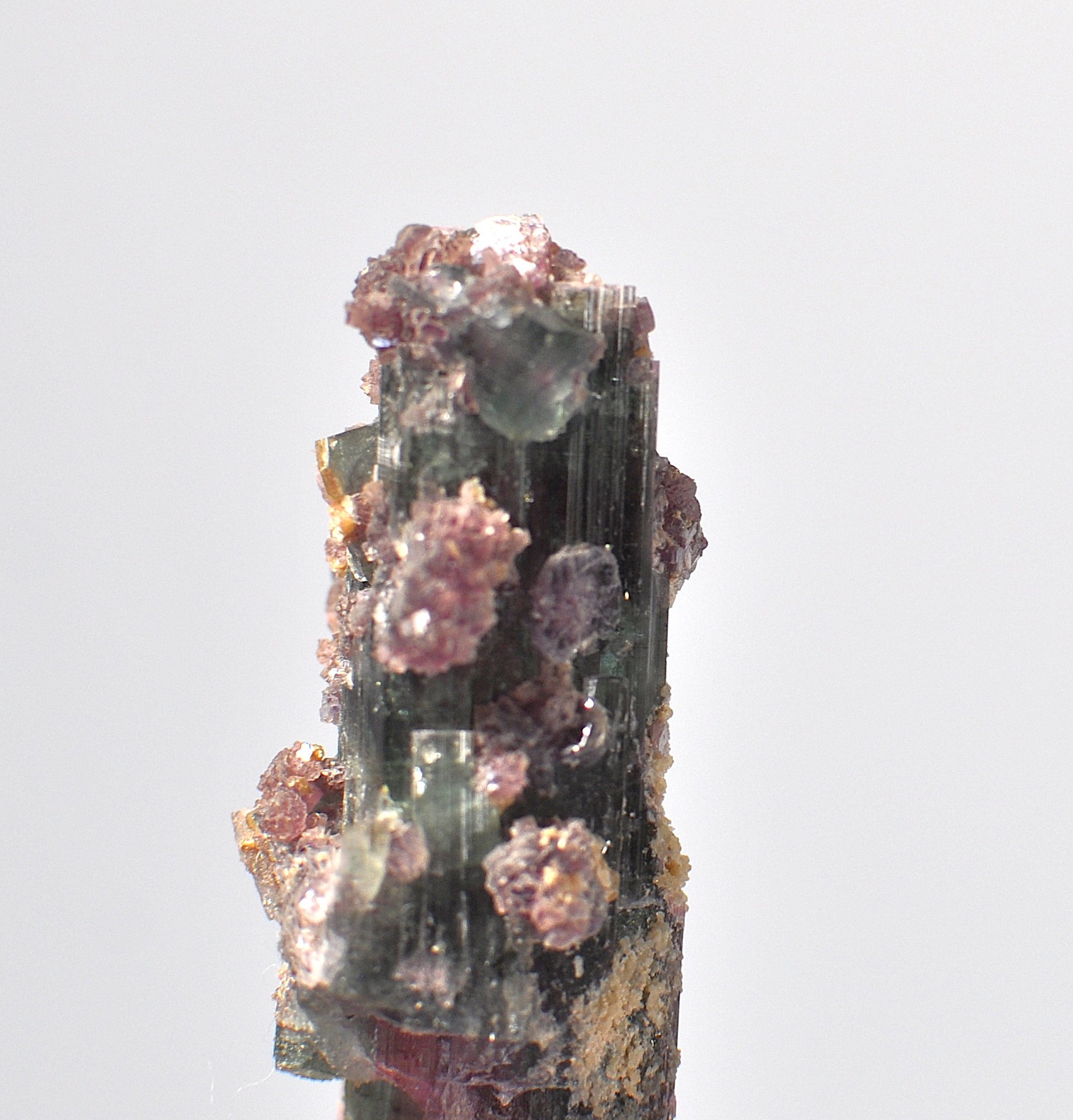 Offered is a natural mineral specimen featuring elongated prismatic tourmaline crystals exhibiting dark green to black tones, with areas of pinkish to purplish coloration, likely rubellite zoning. The crystals are partially encrusted with lilac-purple lepidolite and minor quartz on matrix. Attractive natural growth with visible striations and crystal terminations.