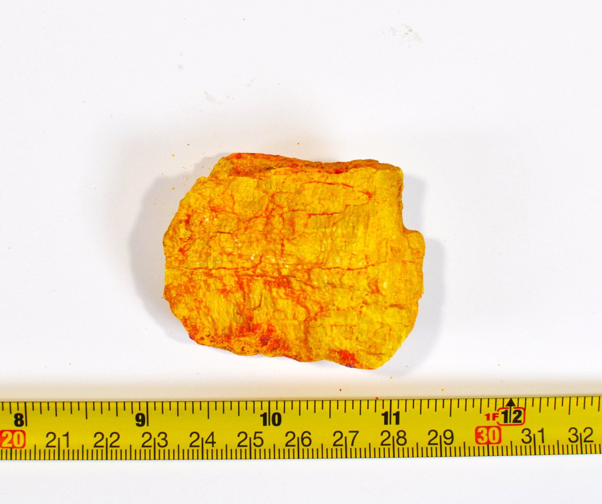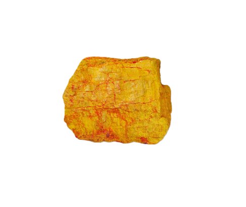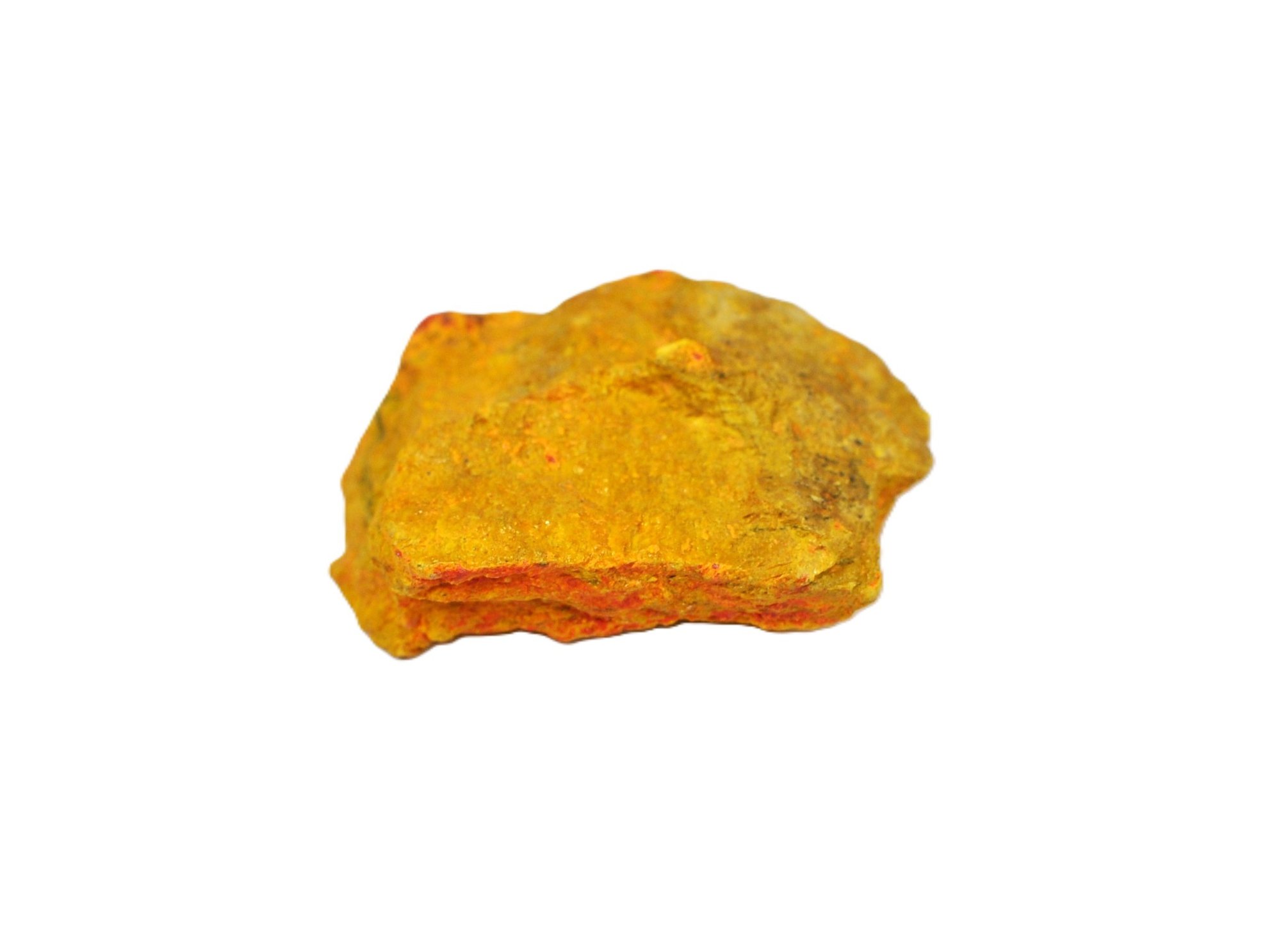 Offered is a striking natural mineral specimen exhibiting intense yellow coloration with red to orange veining, characteristics strongly associated with orpiment, an arsenic sulfide mineral historically prized for its vivid color. The specimen shows a granular to slightly friable texture and layered structure typical of orpiment-rich material.