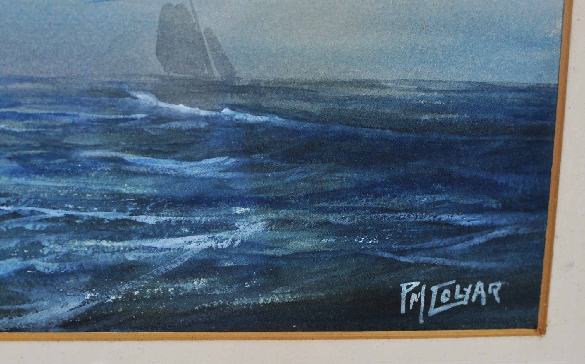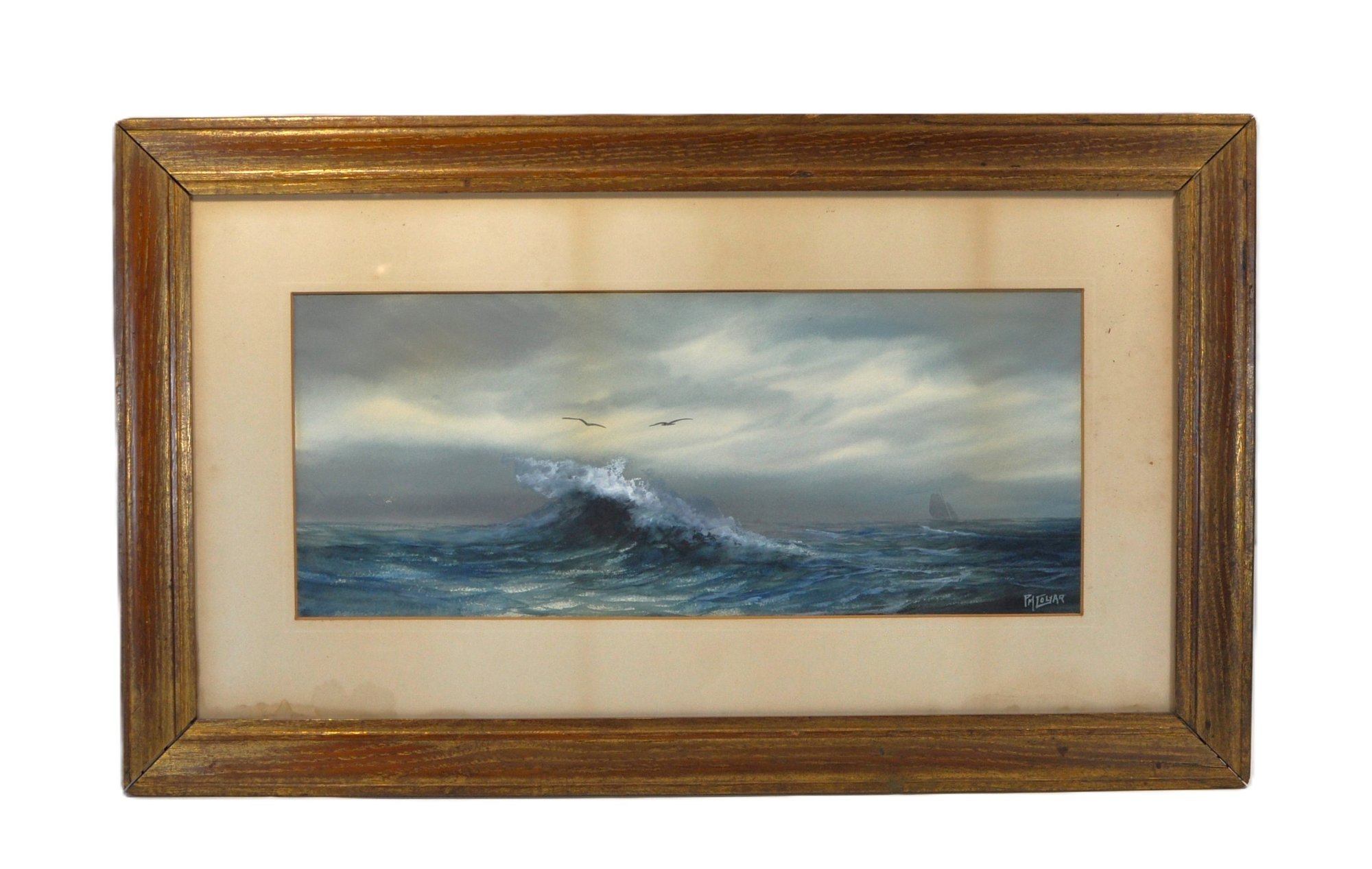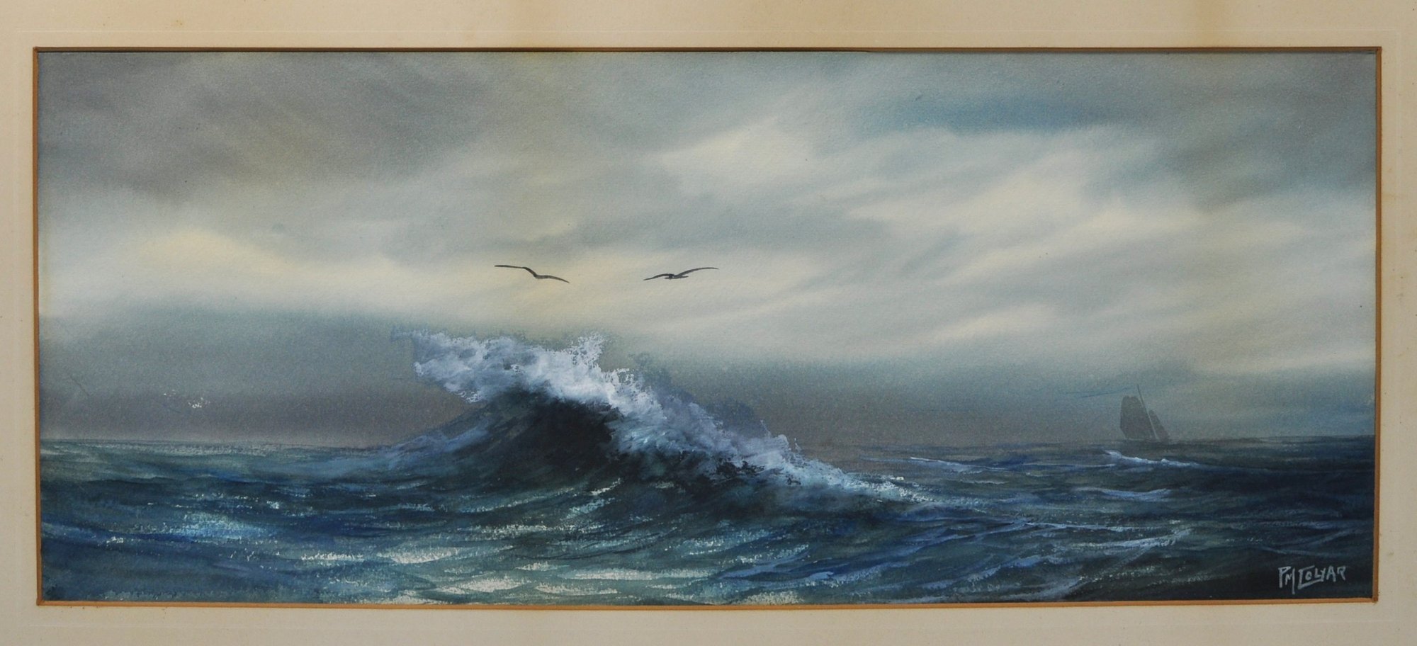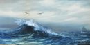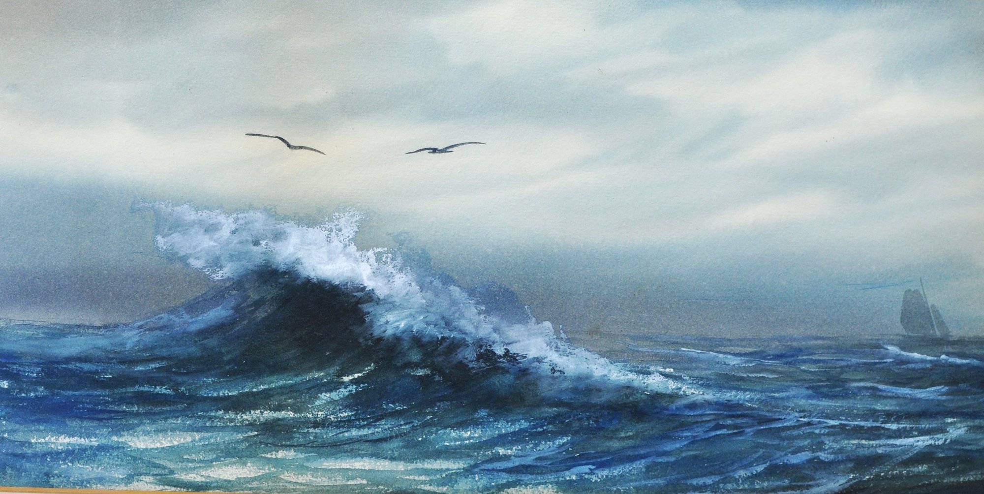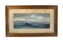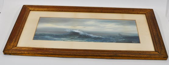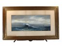 Atmospheric original maritime watercolor by Pauline Colyar (1873–1928), a New Bedford, Massachusetts artist celebrated for her coastal and nautical subjects. This dramatic seascape captures the restless energy of the Atlantic: a towering wave crests in the foreground, its spray rendered with striking realism, while a lone sailboat emerges on the misty horizon.
