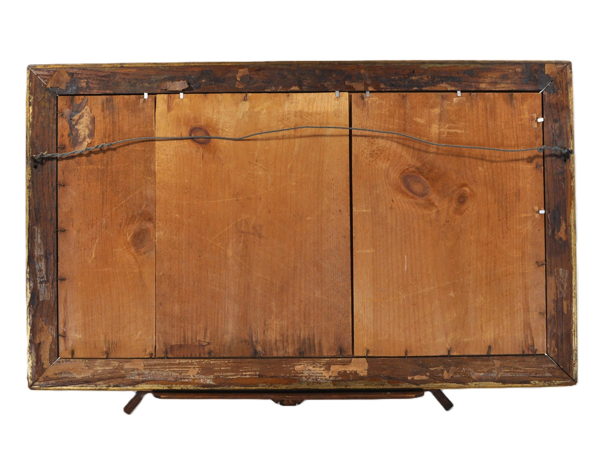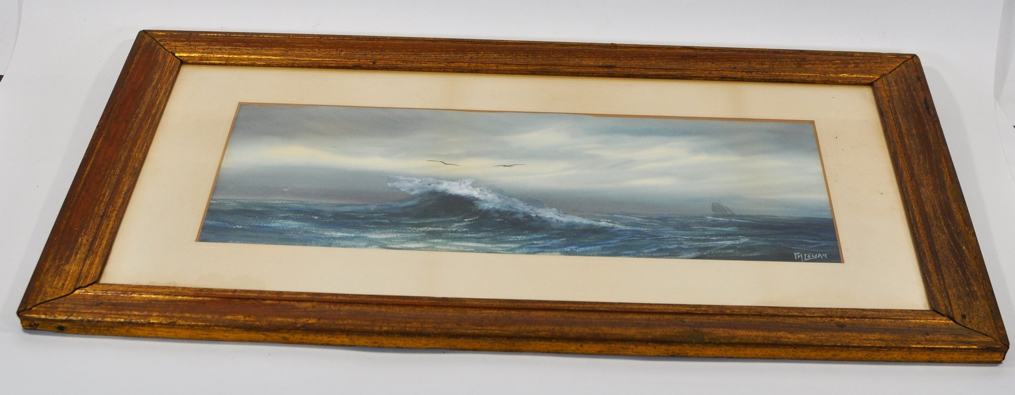 Presented in its original vintage gilt wooden frame with wide mat. The mat shows noticeable foxing, toning, and staining; the frame exhibits some wear consistent with age.