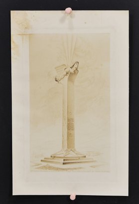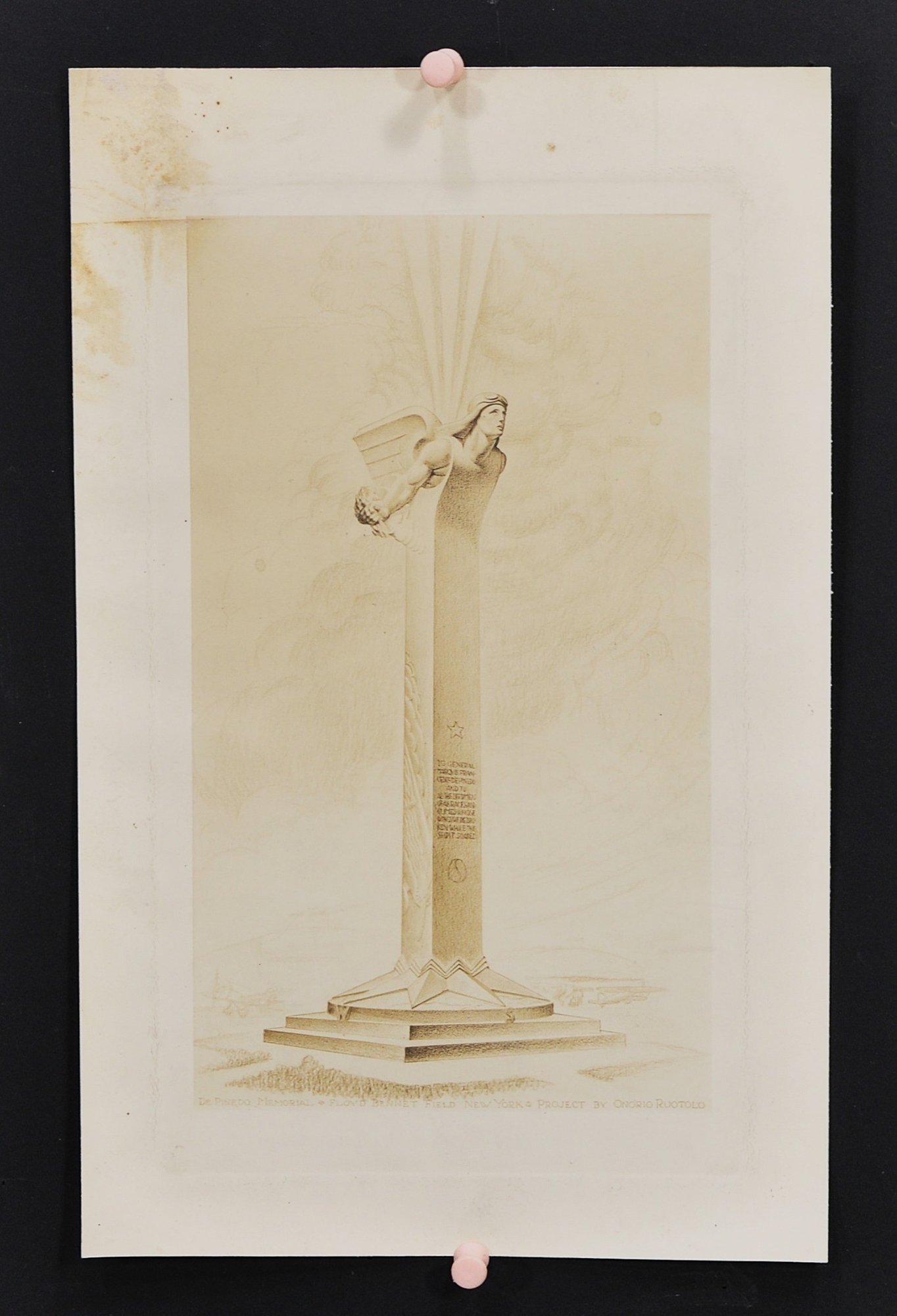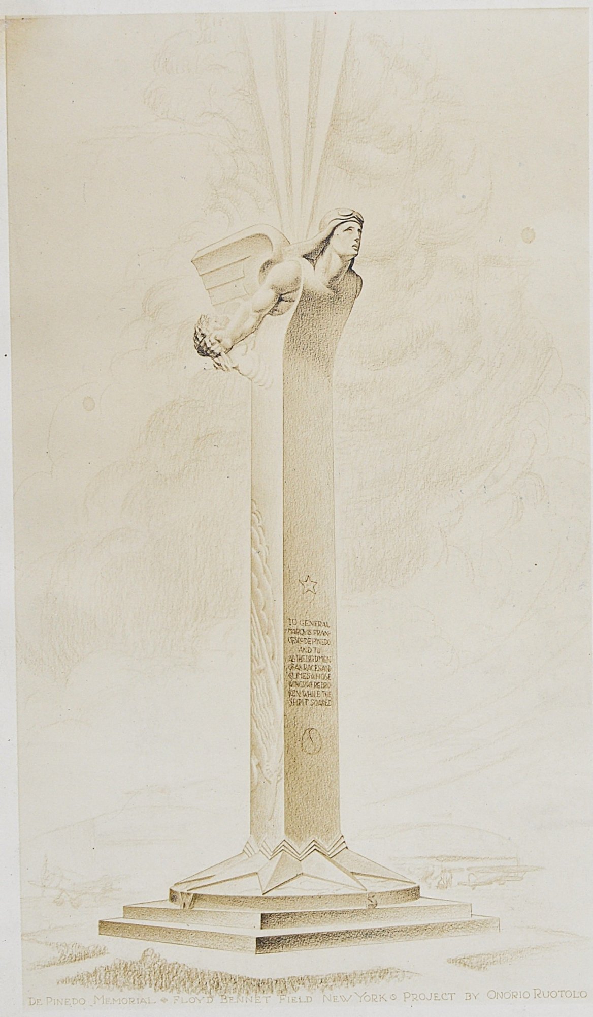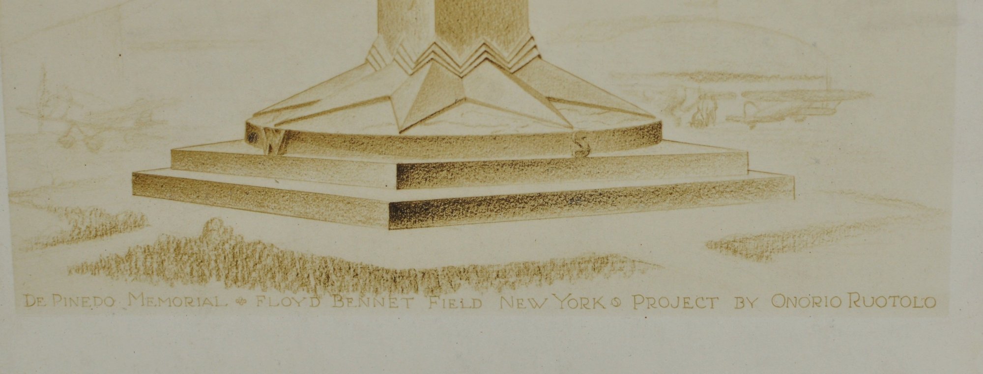 Architectural presentation print depicting a memorial column surmounted by a winged figure, identified lower margin as: “De Pinedo Memorial – Floyd Bennett Field, New York – Project by Onorio Ruotolo.”