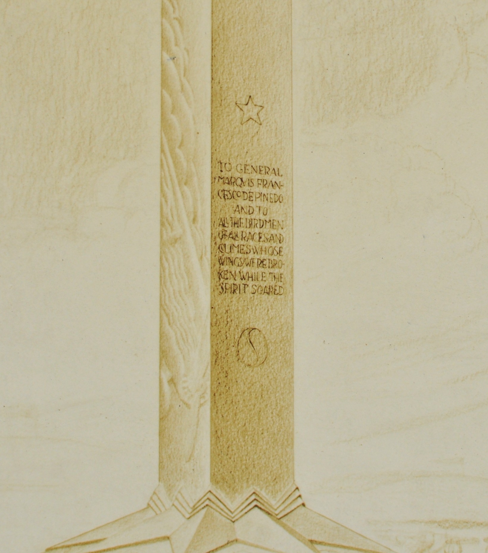 The design honors Italian aviator Francesco de Pinedo, with an inscription referencing “all the birdmen of all races and climes whose wings were broken while the spirit soared.” The composition reflects early 20th-century monument design, combining Art Deco and classical elements in a streamlined vertical form.