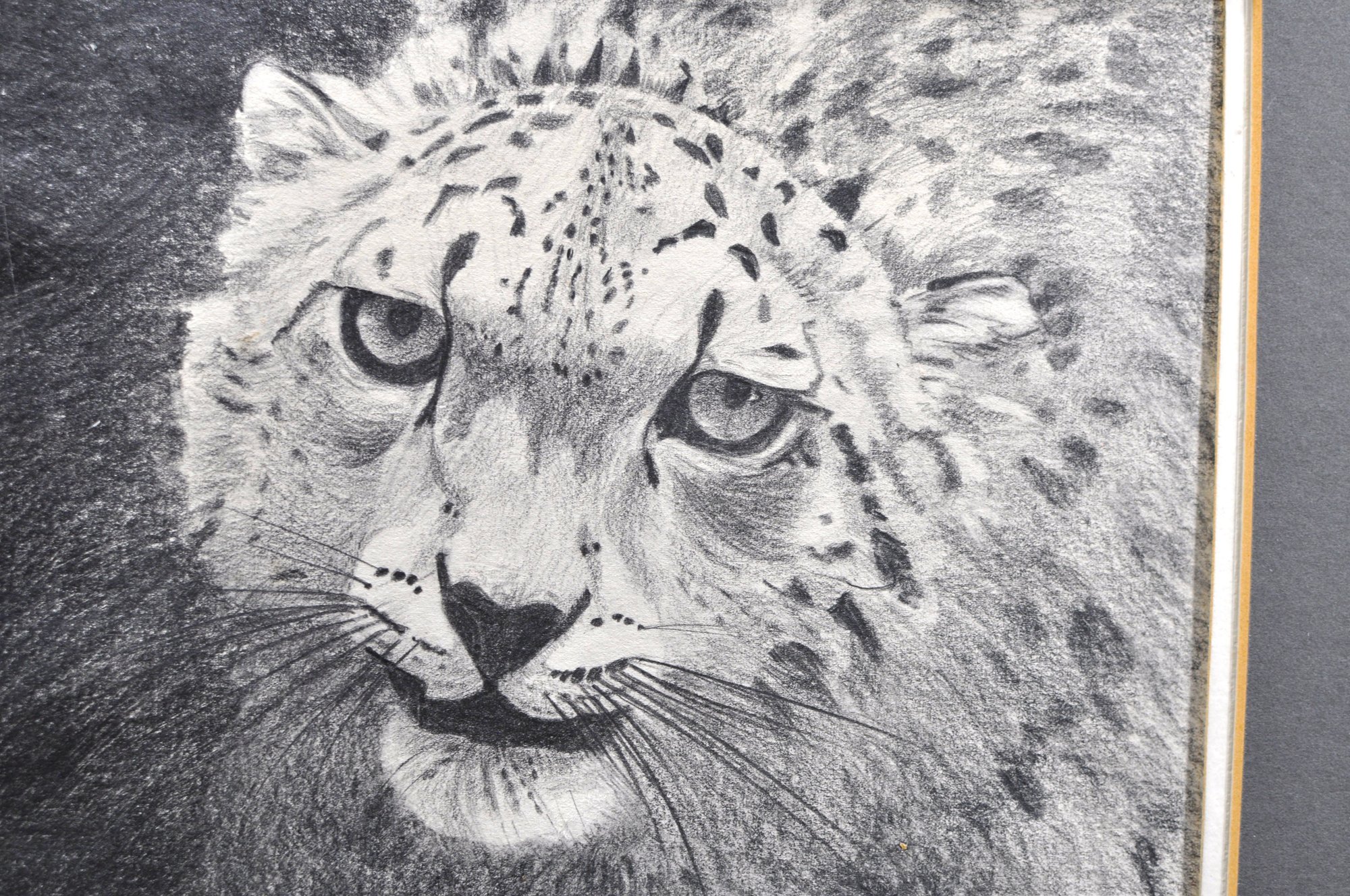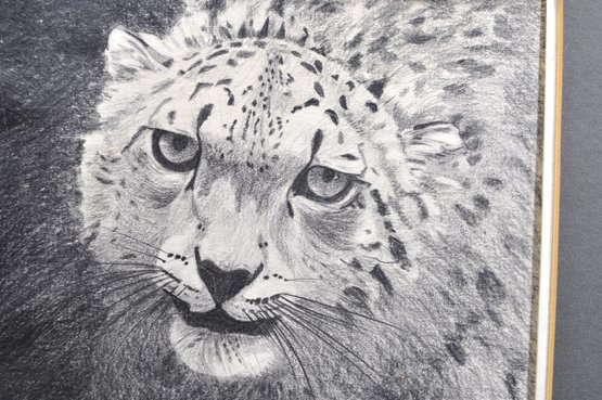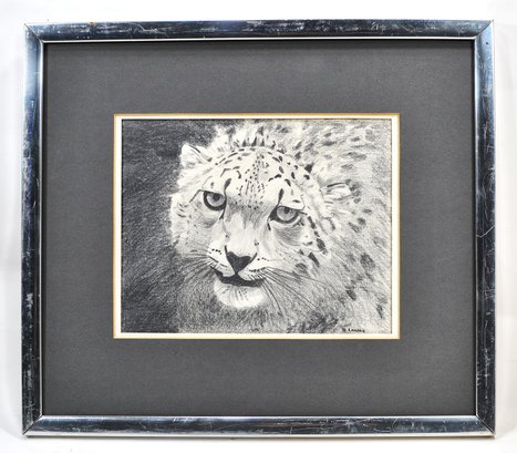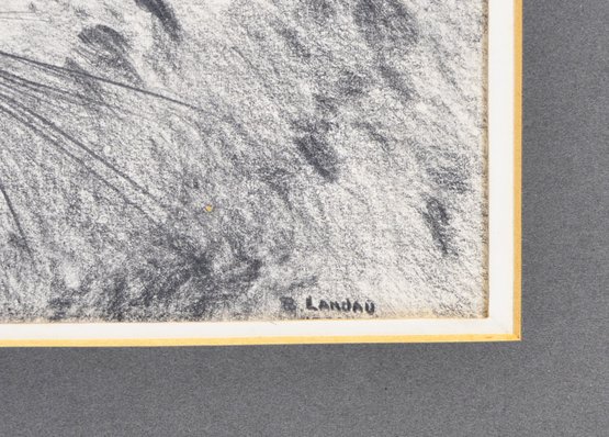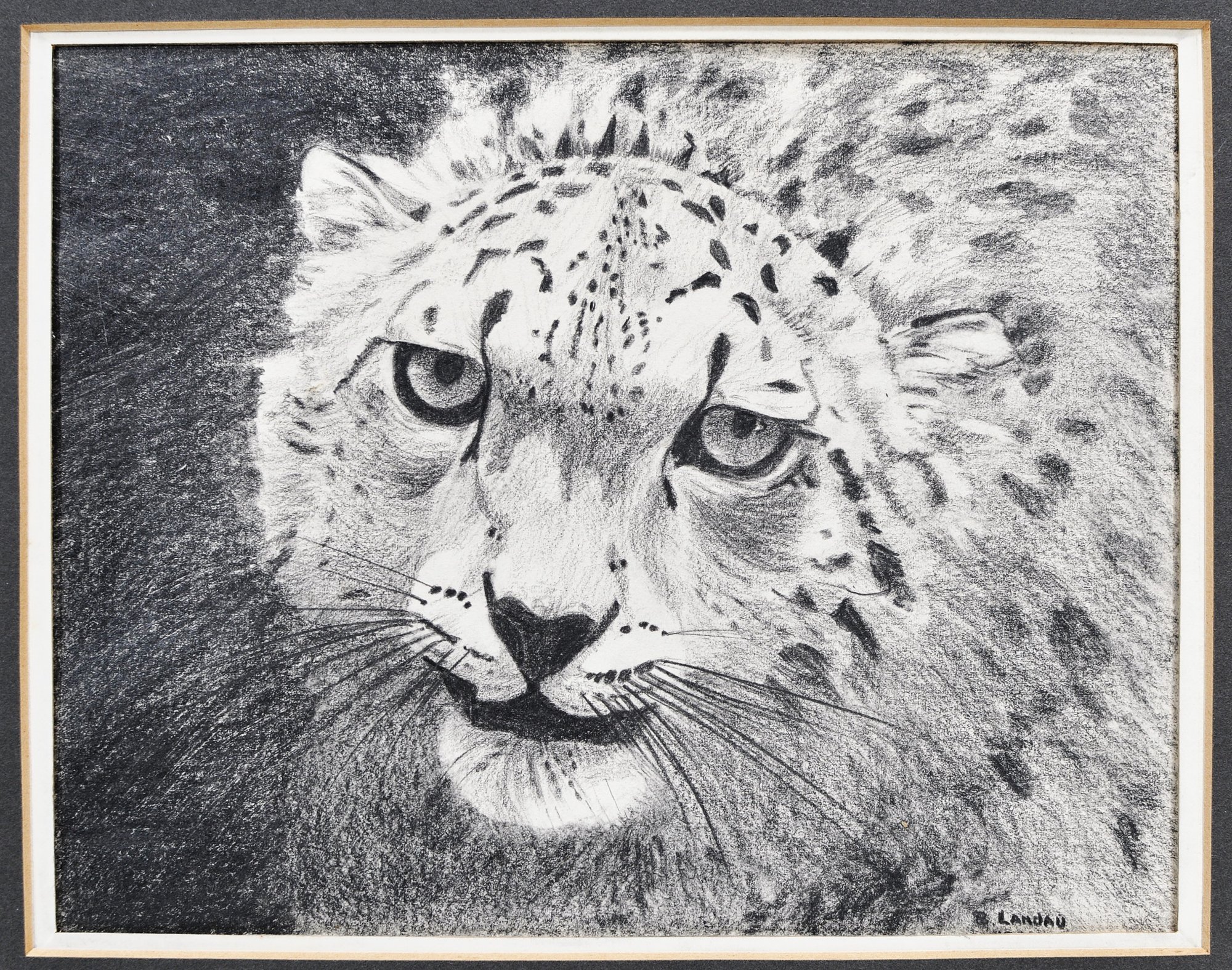 Striking charcoal drawing of a cheetah or leopard head, signed B. Landau lower right. The composition captures the animal’s intense gaze and spotted coat with expressive shading and fine line work, characteristic of wildlife portrait studies. Rendered in monochrome with strong contrast, emphasizing texture and depth.