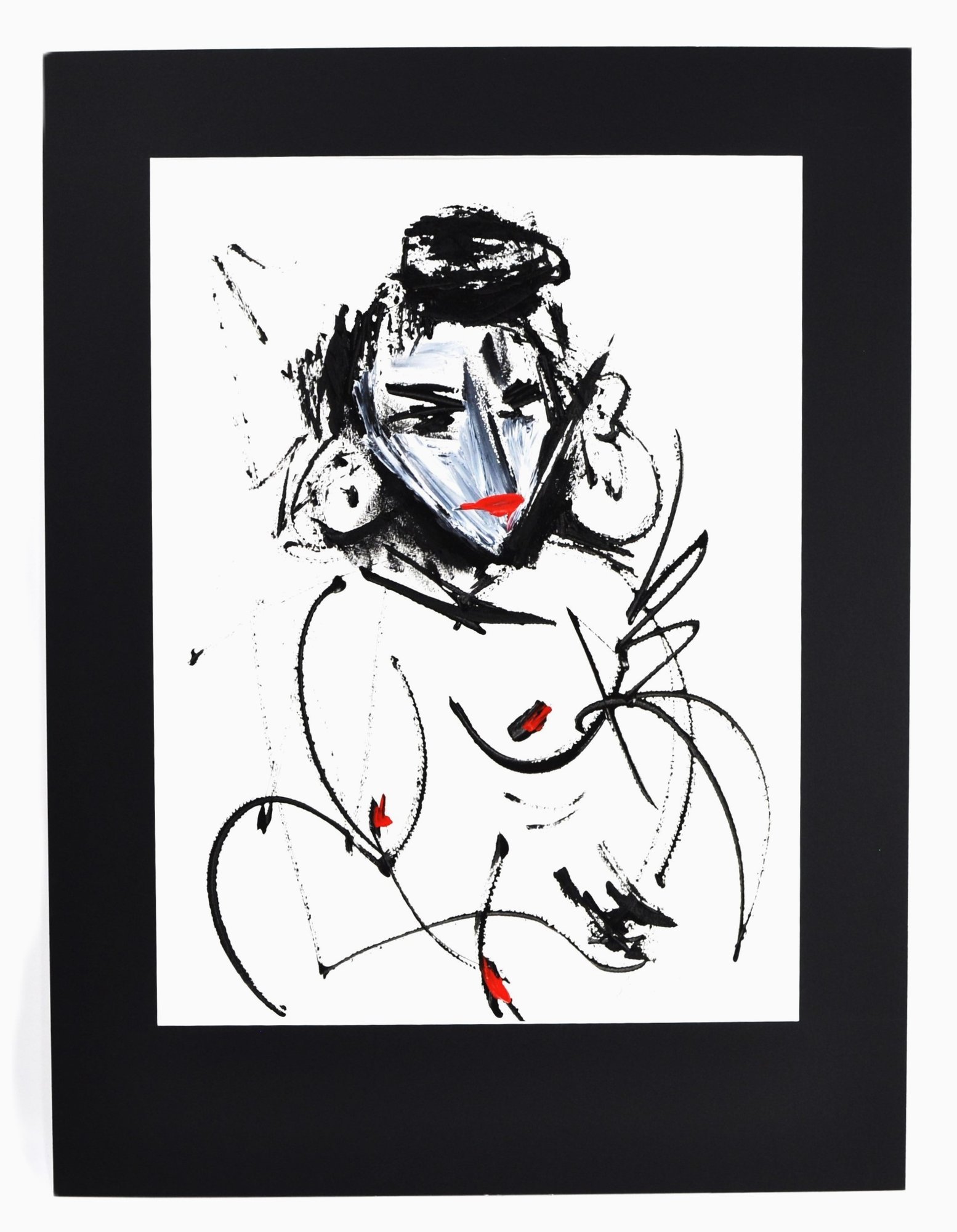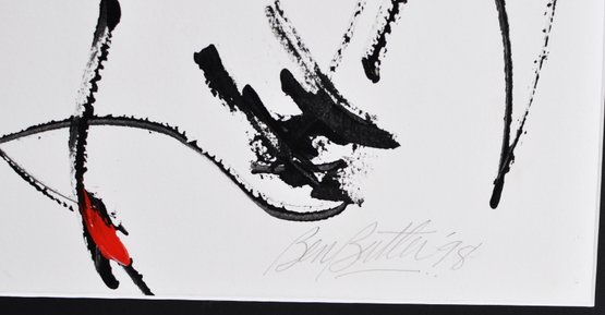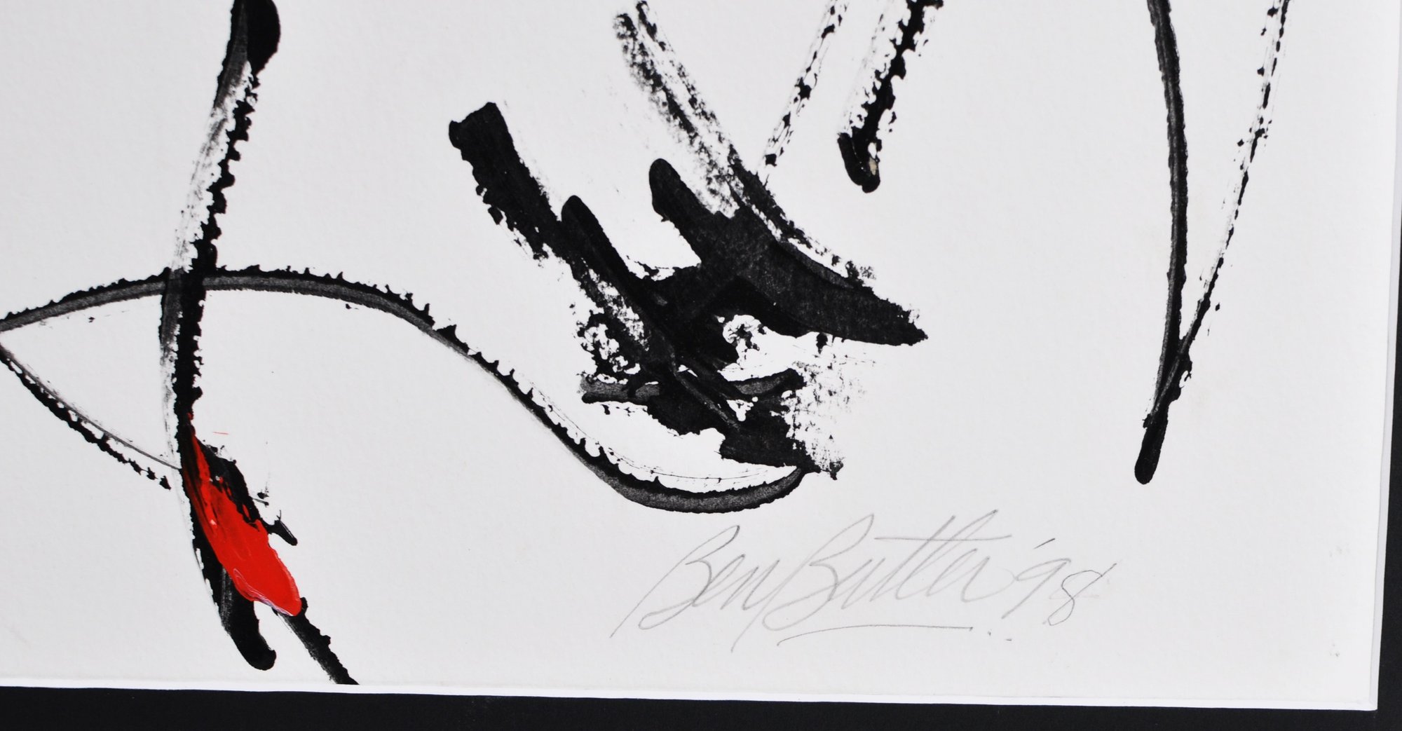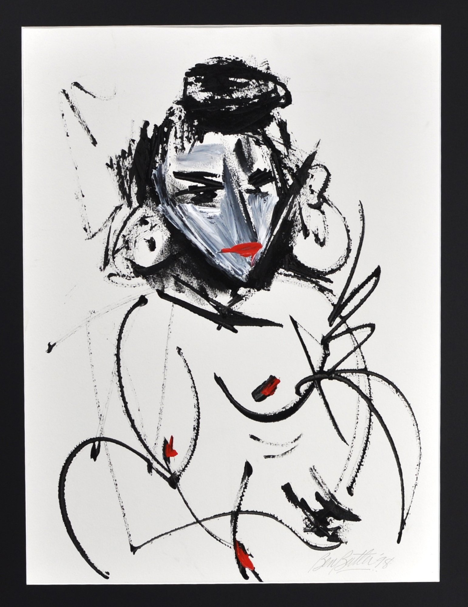 Striking abstract expressionist portrait, signed and dated “Ben Butler '98” in graphite lower right. Executed in bold black ink and accented with red and blue paint, the composition features dynamic, gestural lines forming a stylized female figure. Mounted to black mat board (unframed).Measures 20" x 15", matted 26" x 19.5".