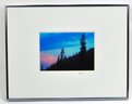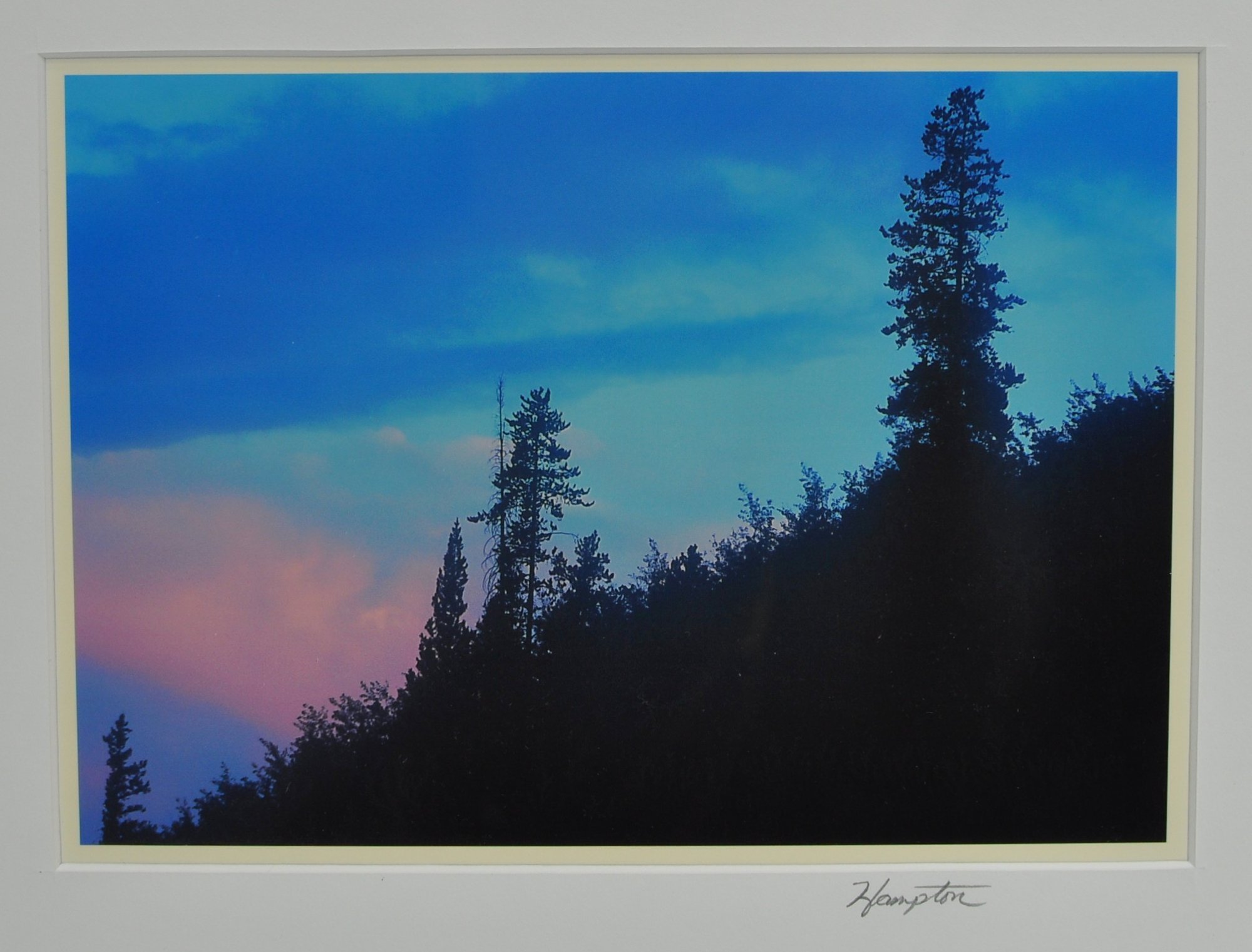 Color landscape photograph by listed American photographer Ben Hampton (1893–1983), depicting silhouetted pine trees against a vivid twilight sky in rich blue, teal, and soft pink tones. The composition captures Hampton’s signature atmospheric style and sensitivity to natural light.