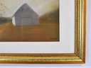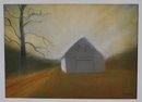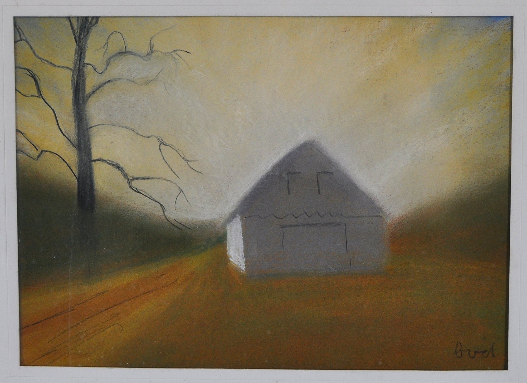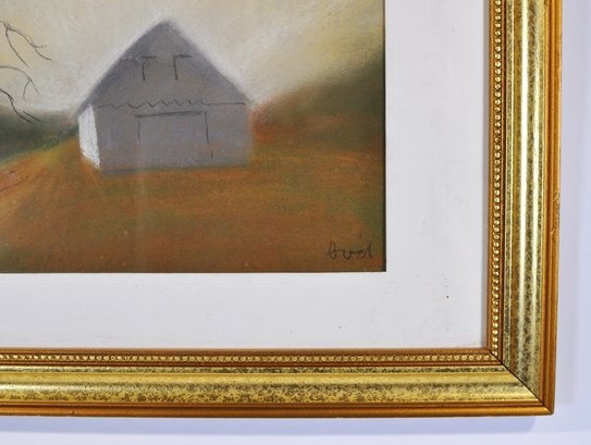 Soft pastel landscape titled “Dusk” by American artist Beth Varnum Dumont. The composition depicts a quiet rural scene with a solitary barn and bare tree at twilight, rendered in warm earth tones and soft atmospheric shading that creates a hazy evening glow.