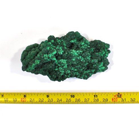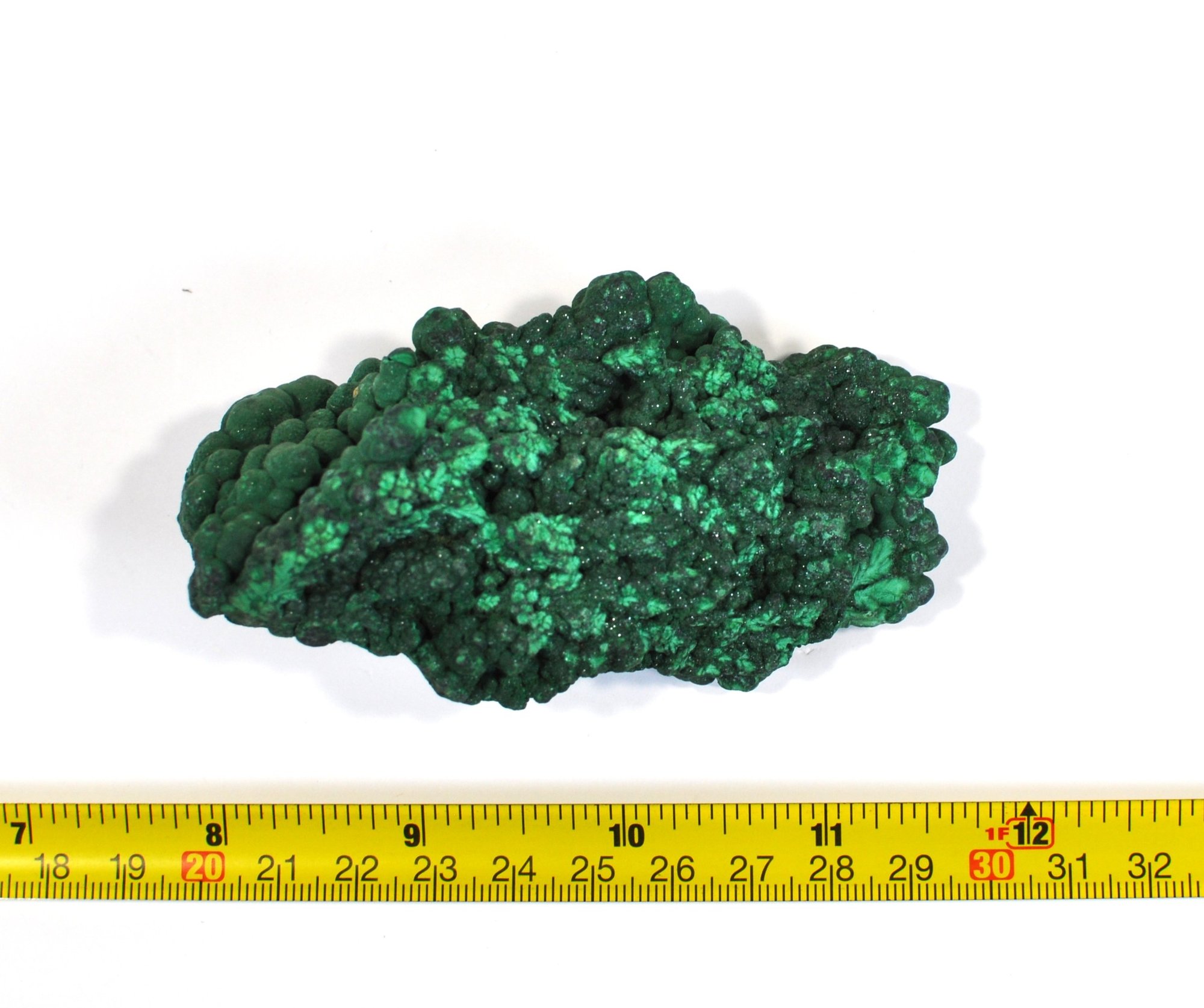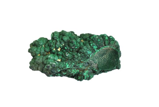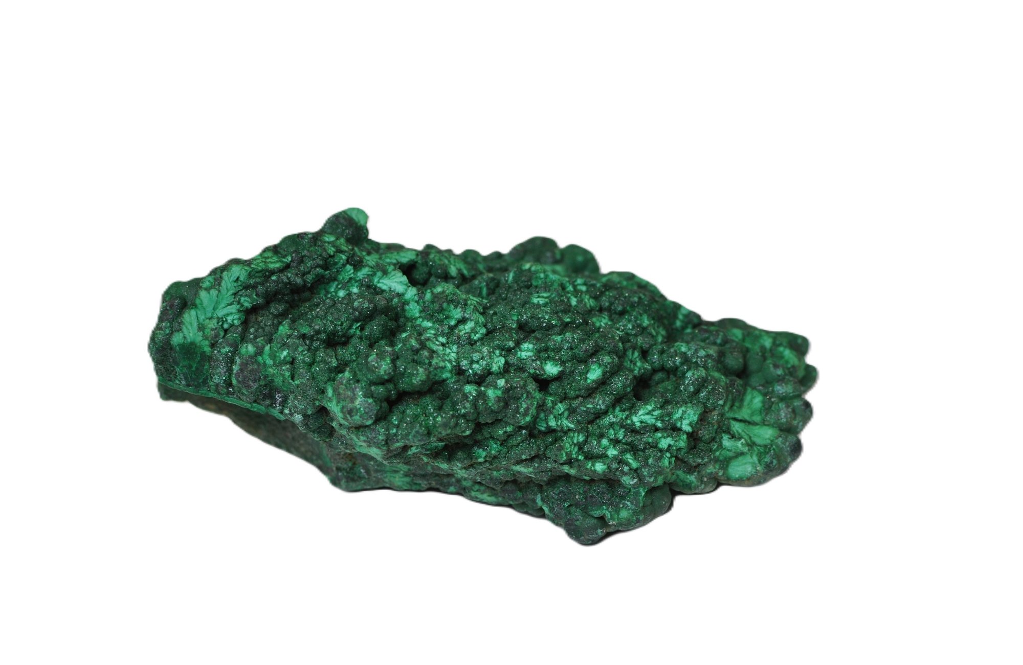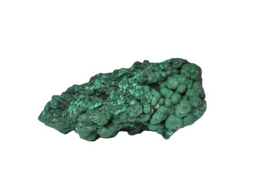 Natural malachite specimen displaying rich emerald-green color and classic botryoidal (grape-like) surface texture. Likely copper-based mineral formation.