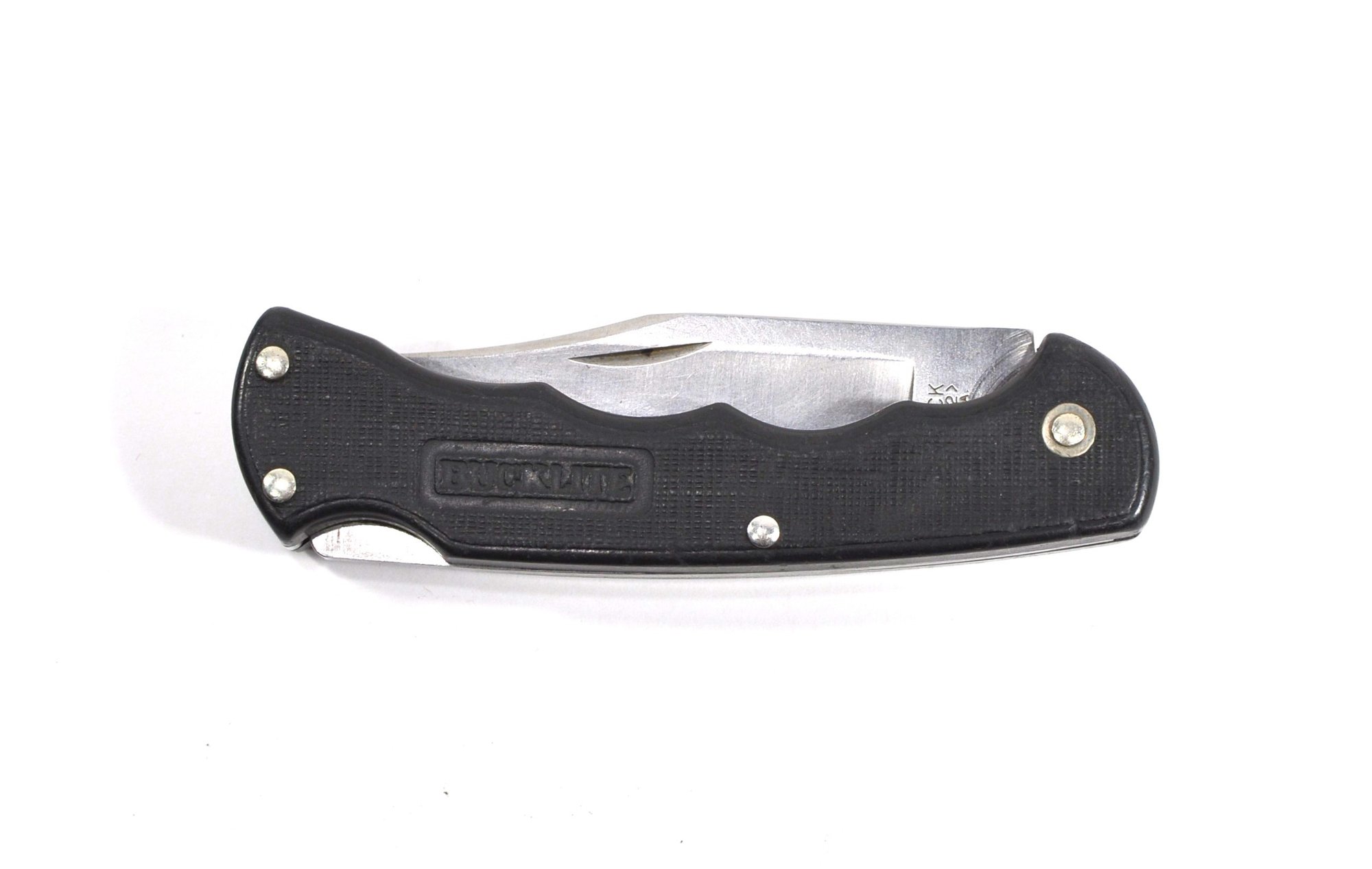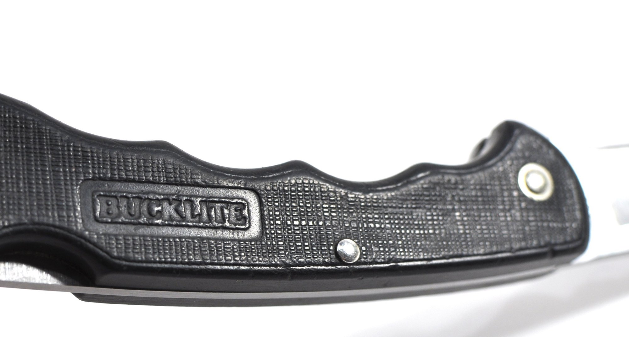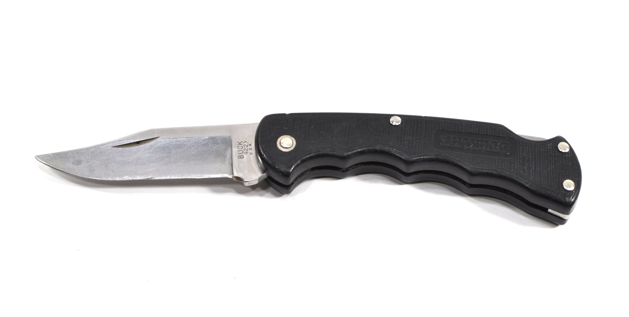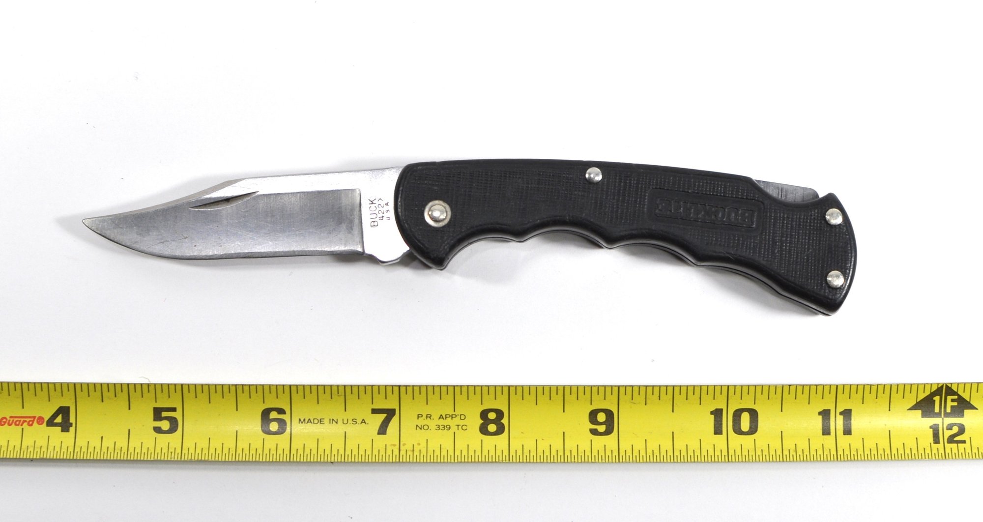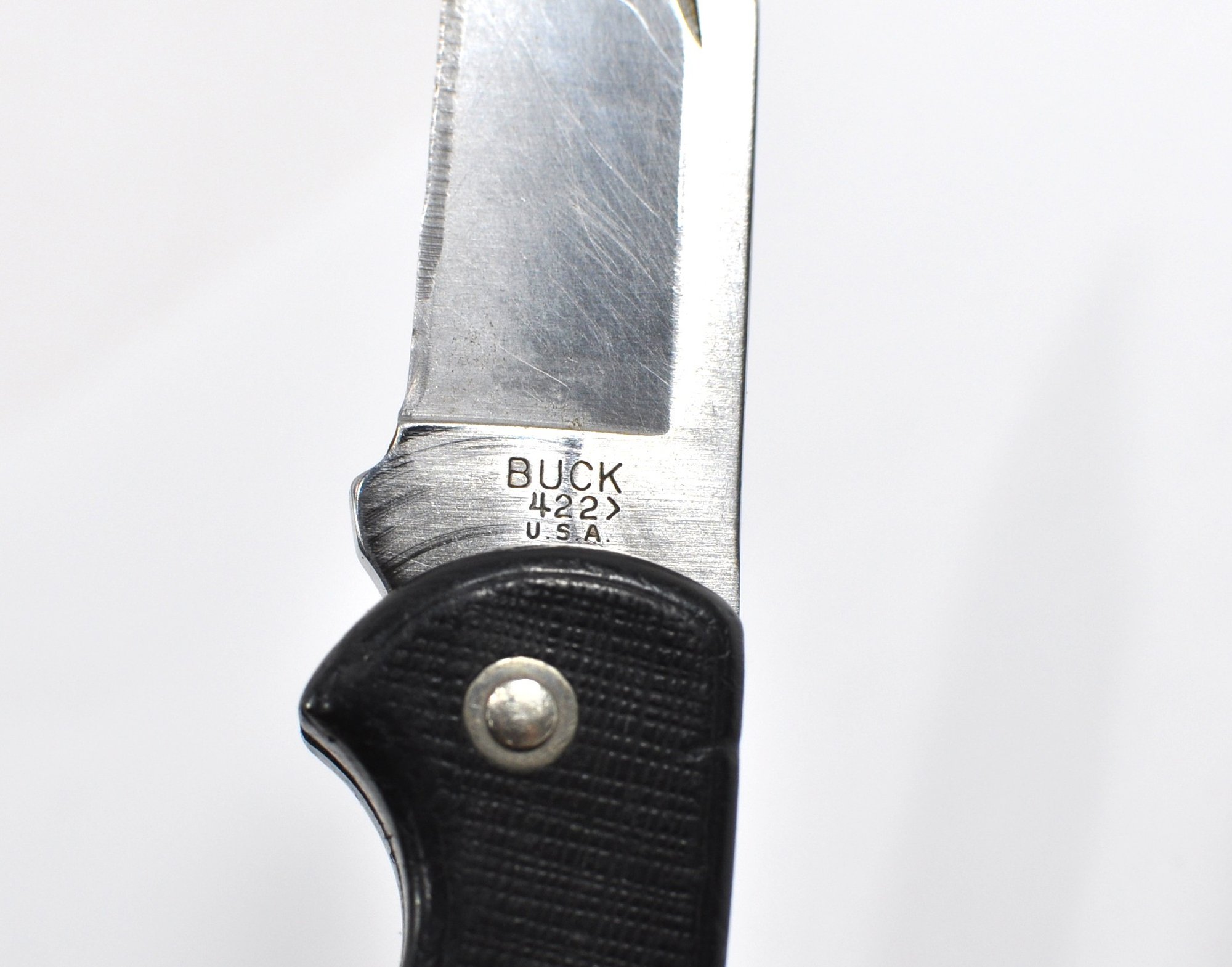 BuckLite model 422 folding lockback knife, made in the USA. Features a stainless steel clip-point blade marked “BUCK 422 USA” and a black textured BuckLite synthetic handle with finger grooves for secure grip. Lockback mechanism functions properly.