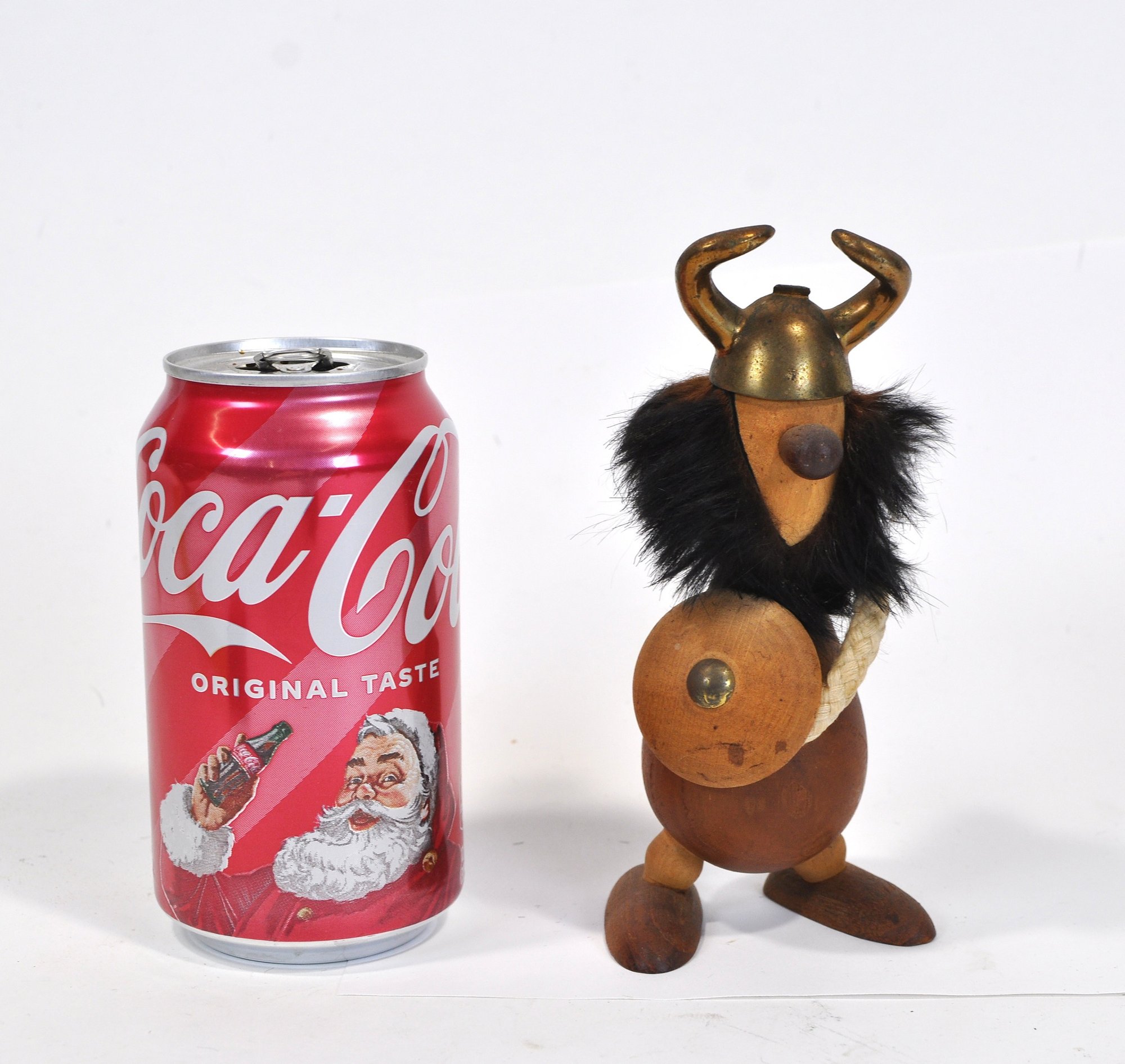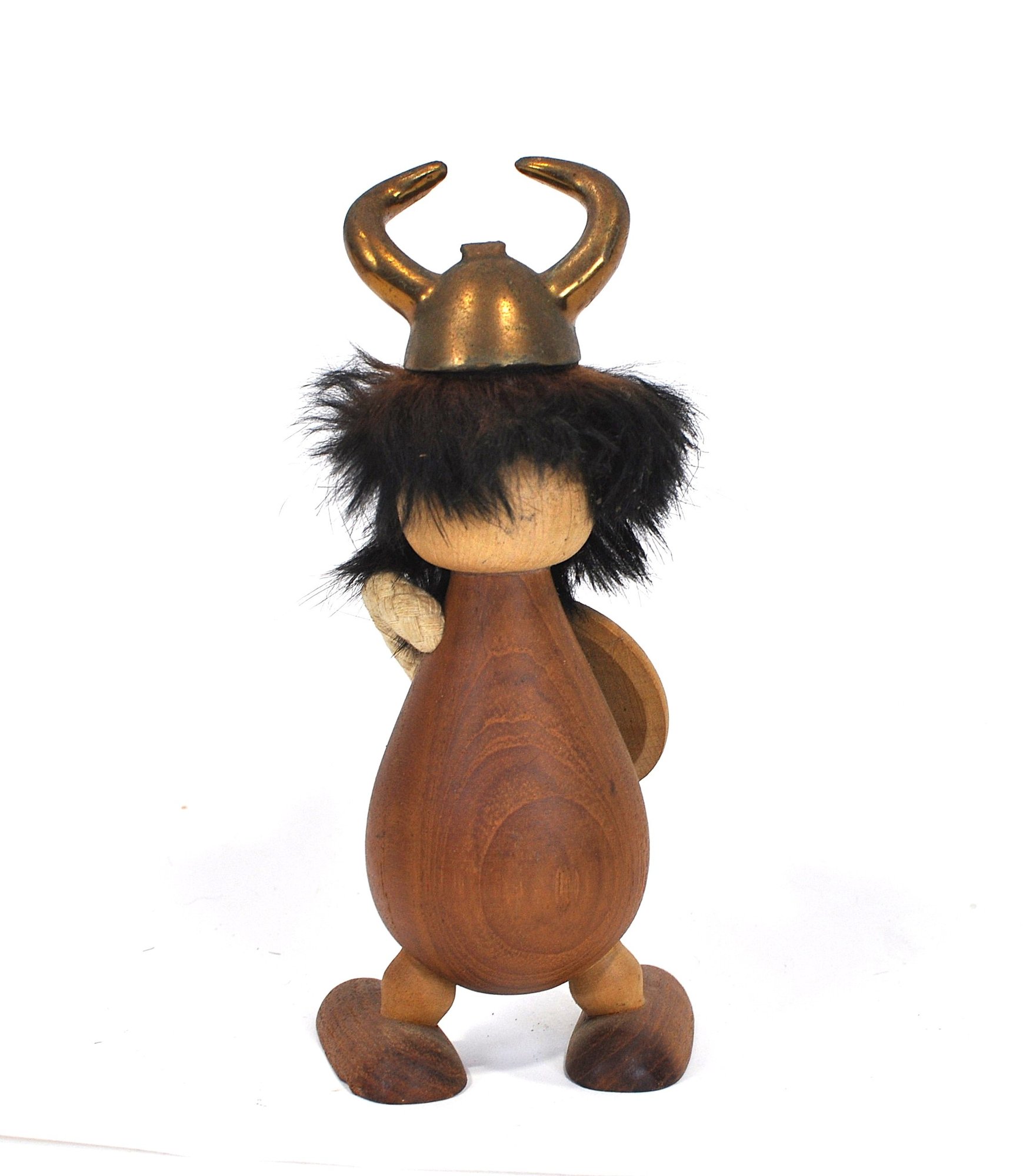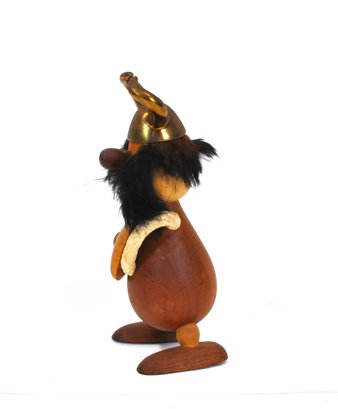 Mid-Century Modern Viking bottle opener designed by Carl Bent, made in Denmark. The piece is crafted from turned teak wood and fitted with a brass Viking helmet opener, forming a stylized figural Viking character.