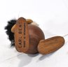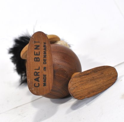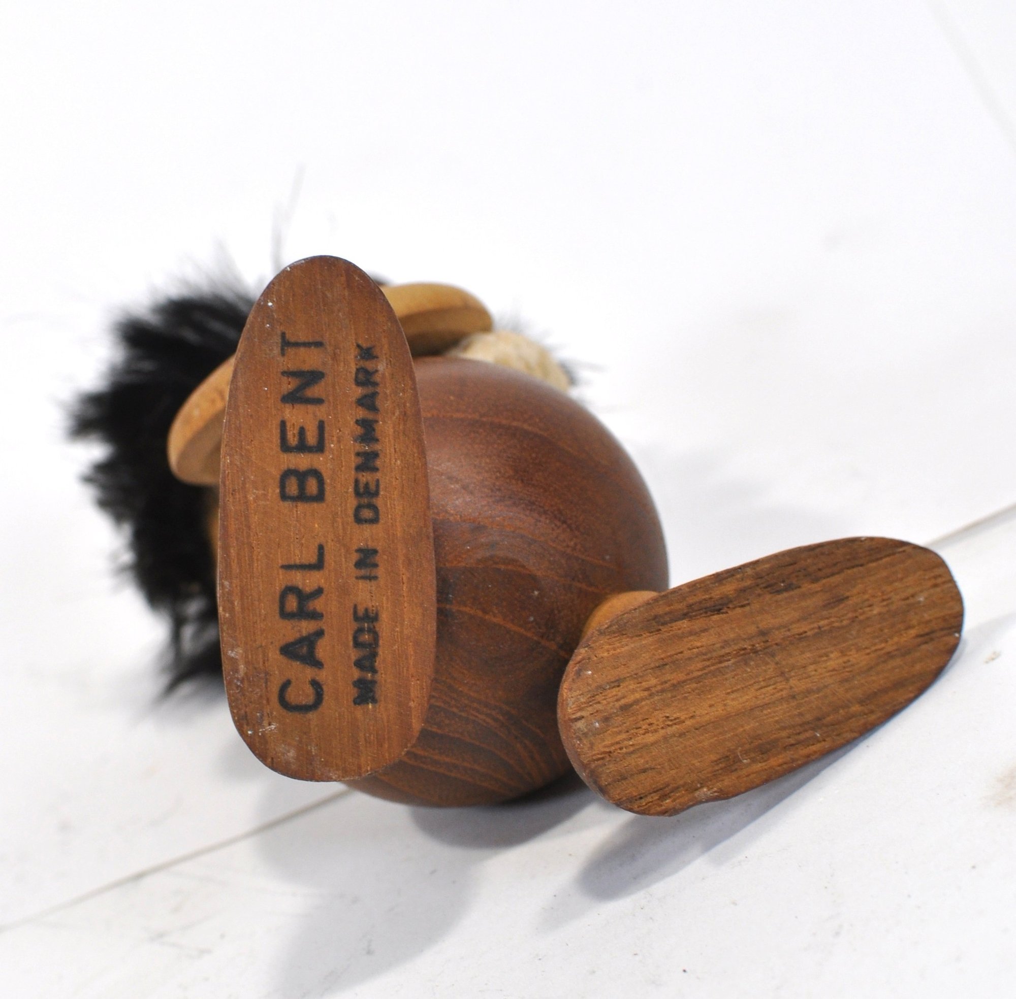 The figure features a warm teak body with articulated feet, a rope detail at the shoulder, and a brass helmet with curved horns that functions as the bottle opener. The underside is marked “CARL BENT / MADE IN DENMARK”.