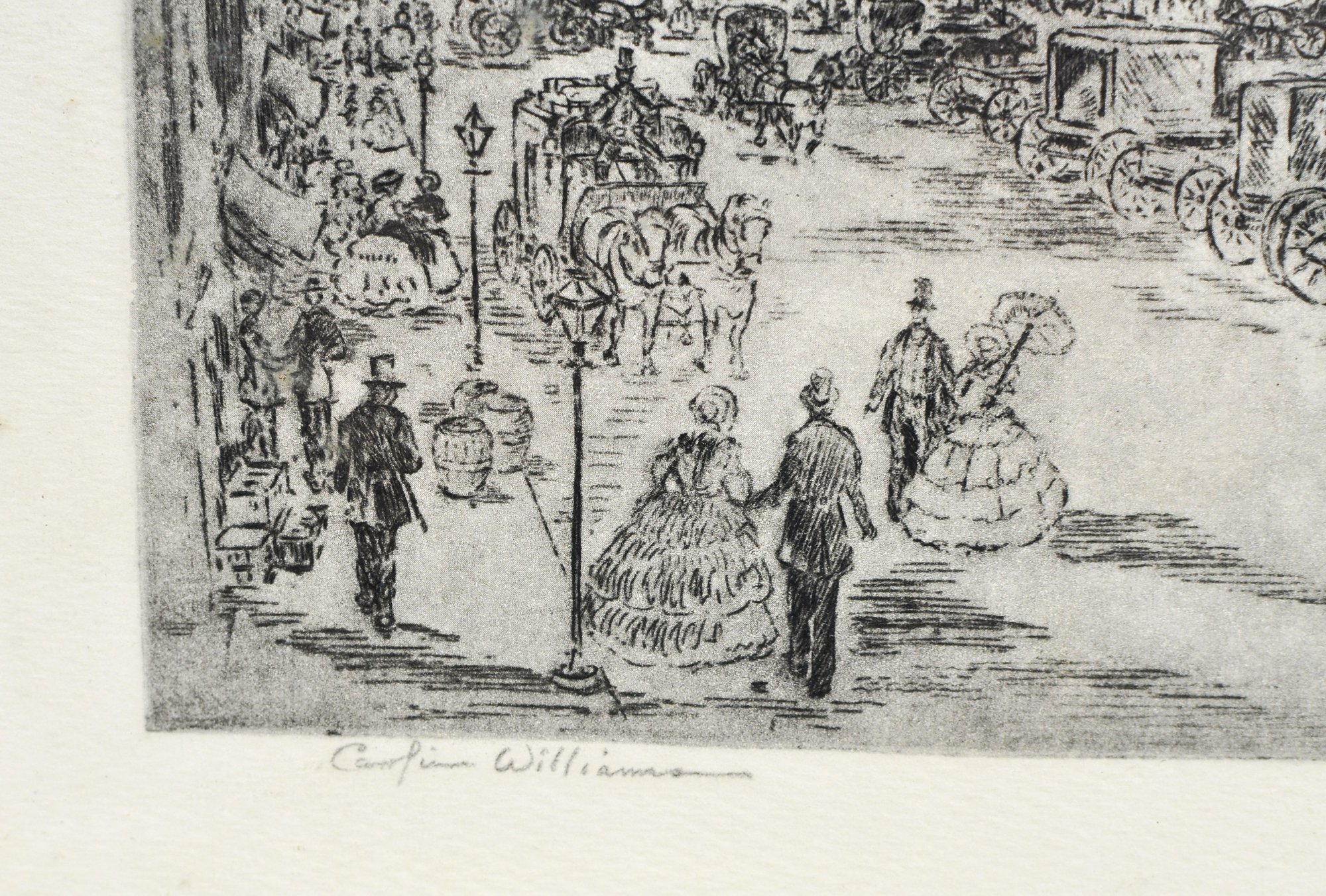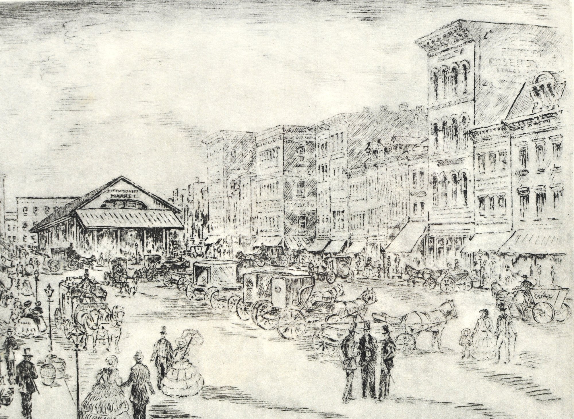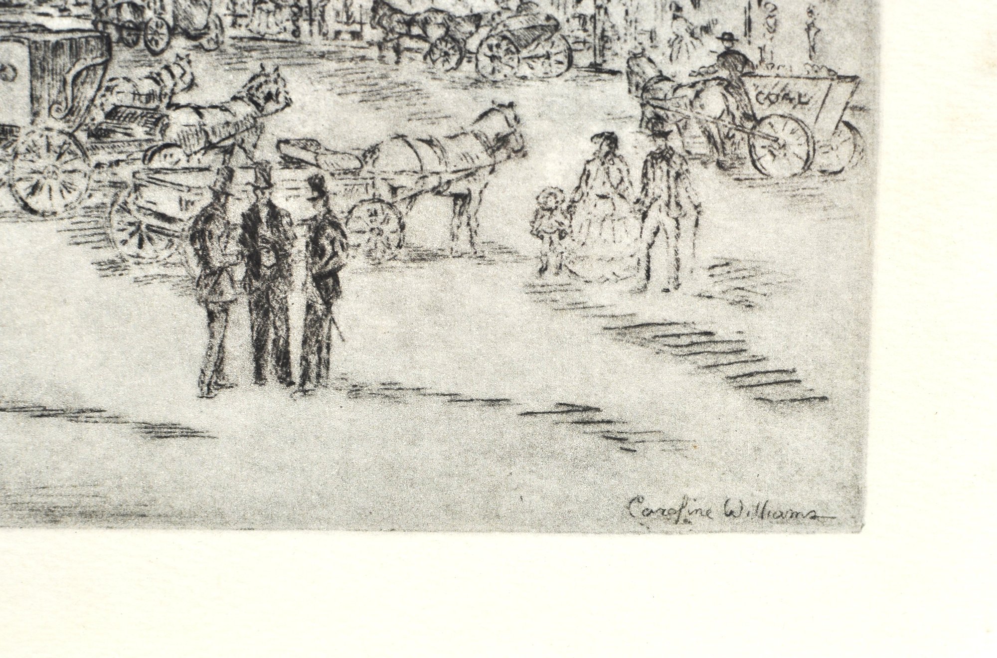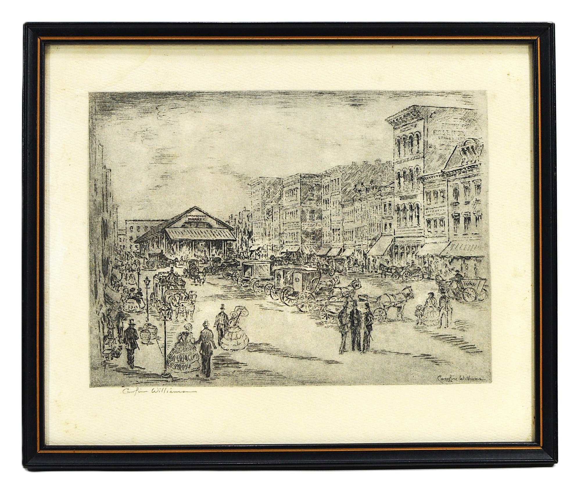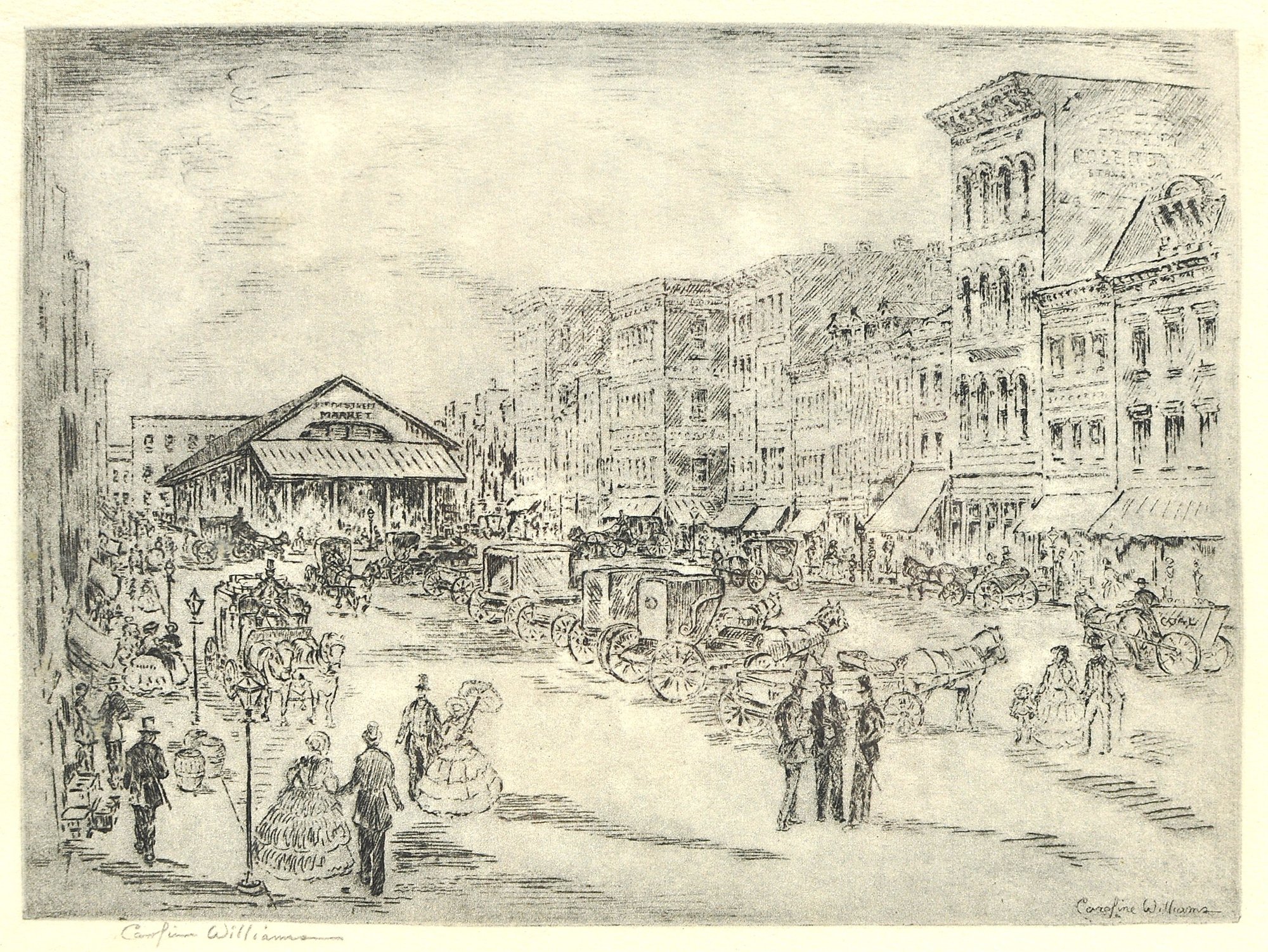 Vintage black-and-white etching by artist Caroline Williams , depicting a historic streetscape withhorse market in the foreground and city skyline beyond. Finely detailed composition.