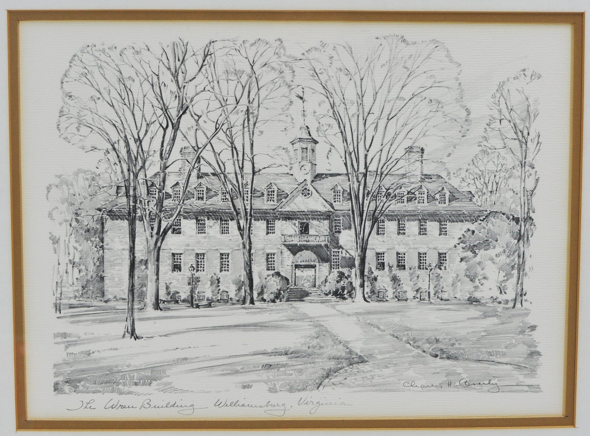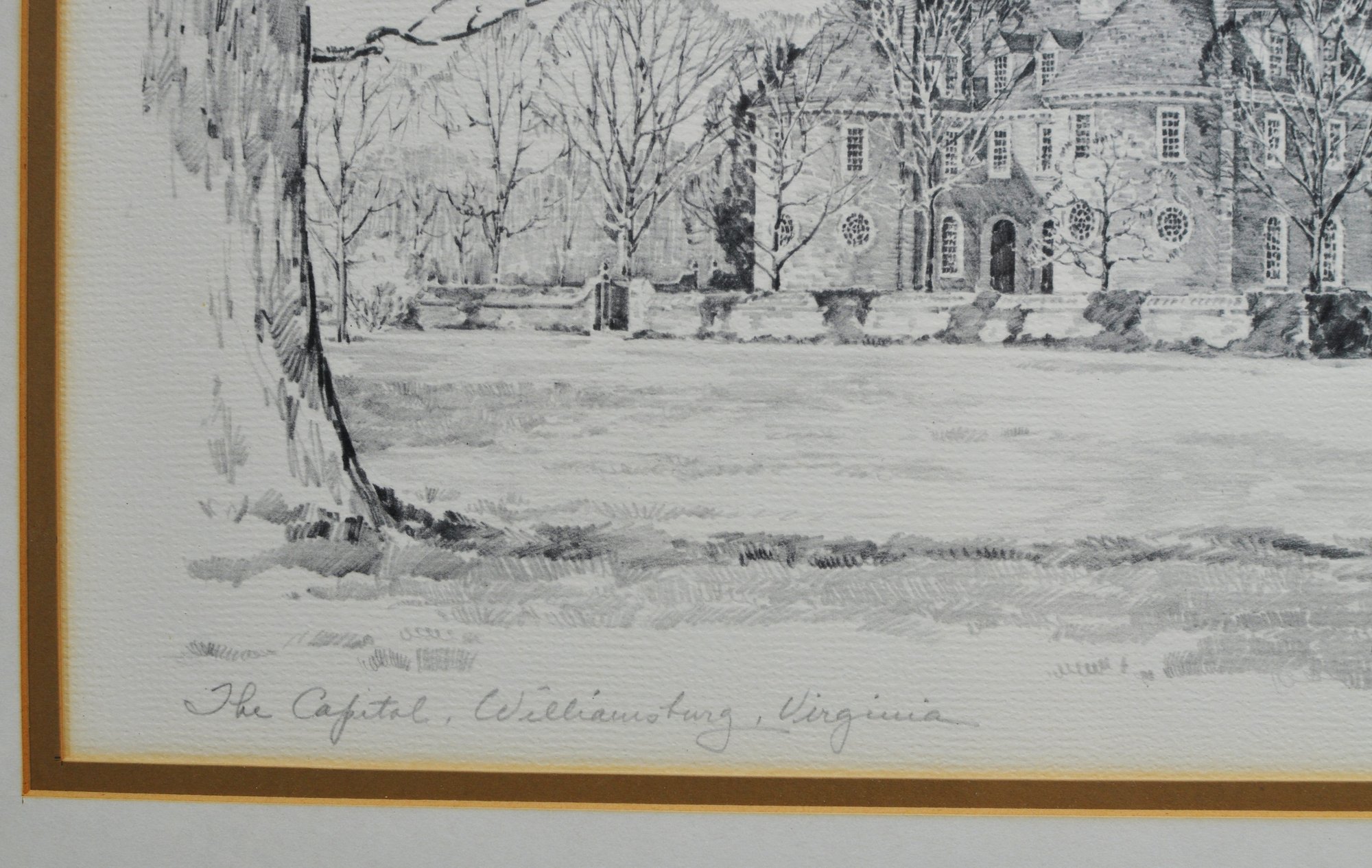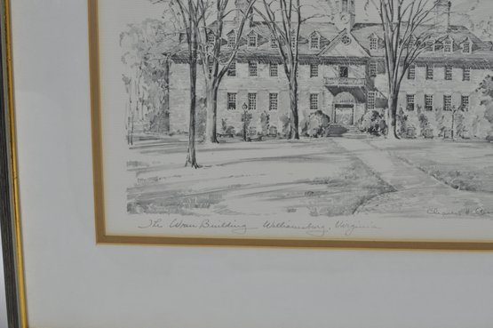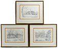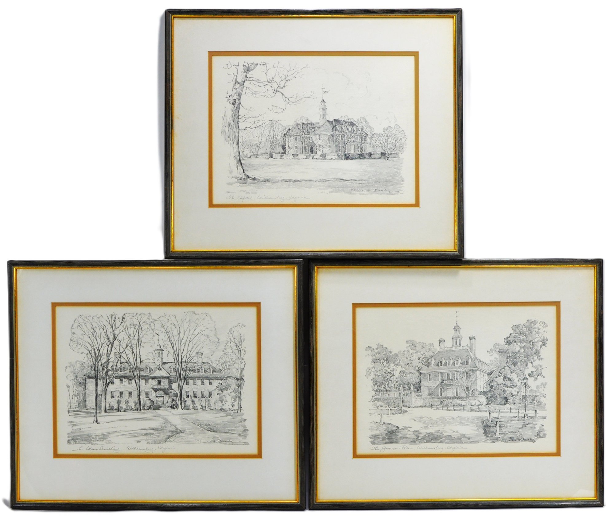 Set of three lithographic prints depicting historic Williamsburg, Virginia landmarks, including The Capitol, The Wren Building, and The Governor’s Palace. Executed in a refined monochrome style with detailed architectural linework and soft shading, characteristic of mid-20th century lithographs.