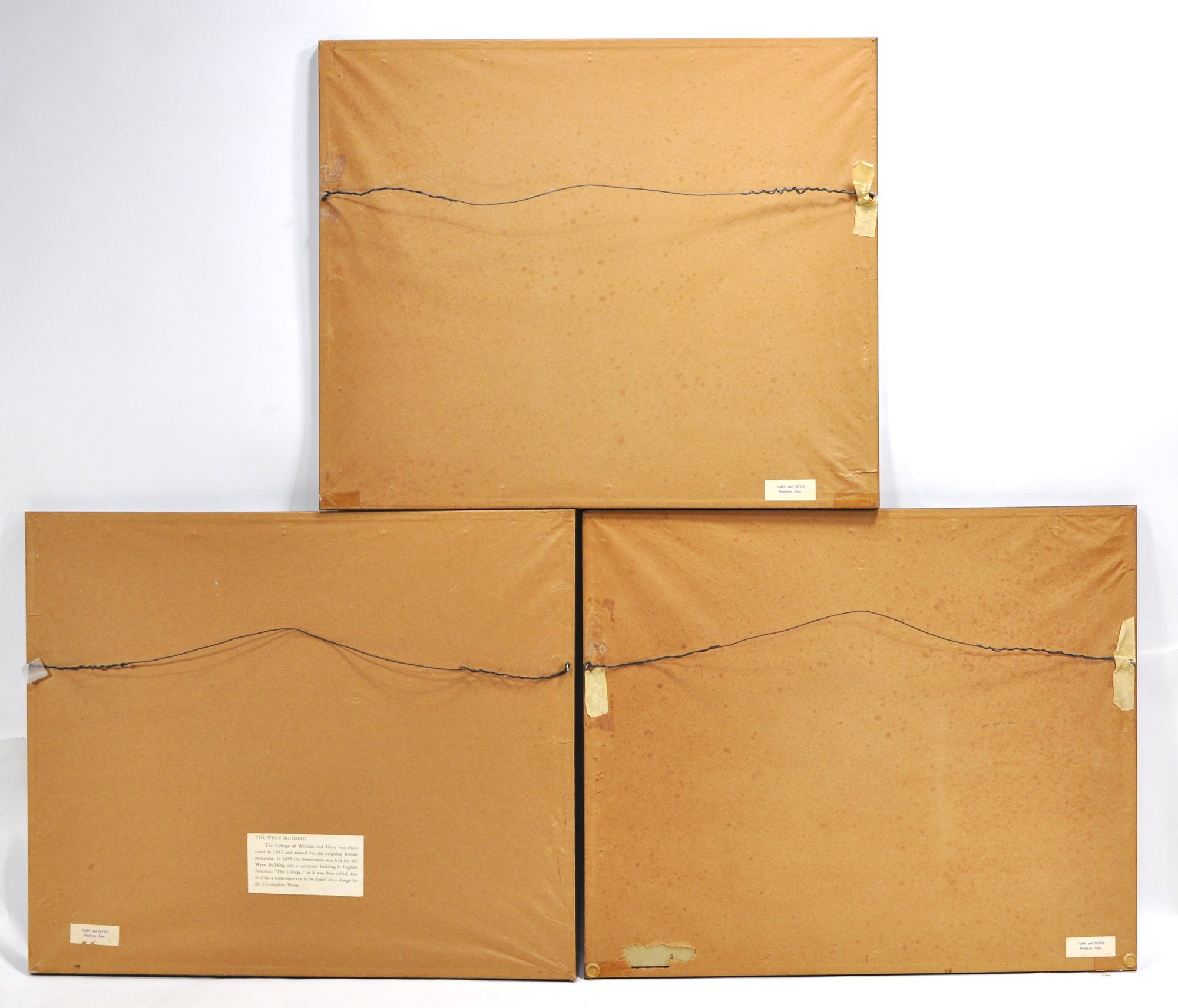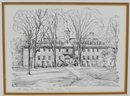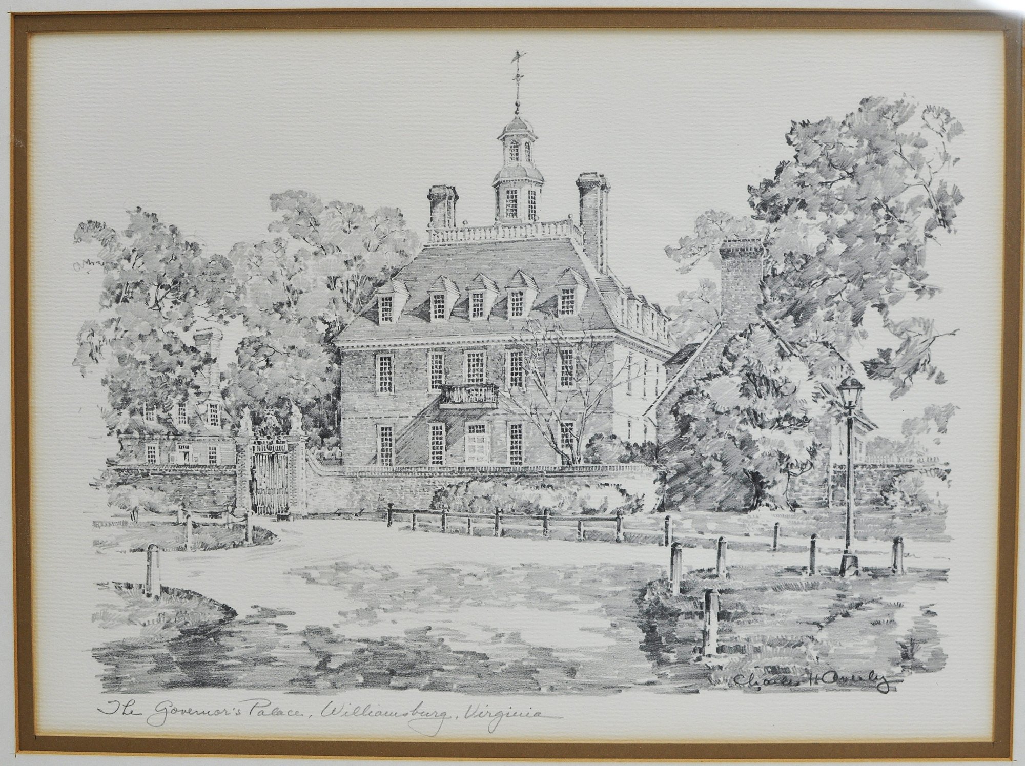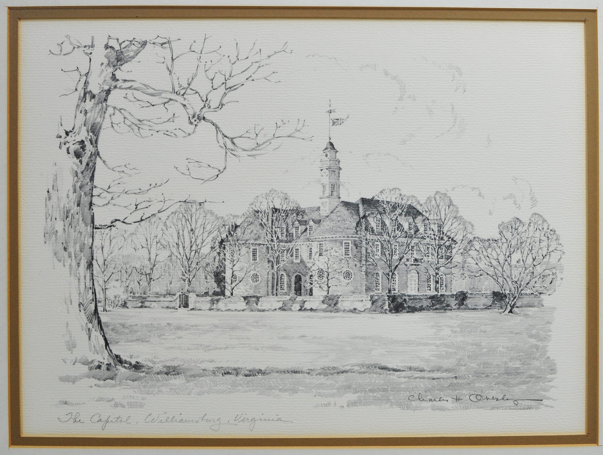 Set of three lithographic prints depicting historic Williamsburg, Virginia landmarks, including The Capitol, The Wren Building, and The Governor’s Palace. Executed in a refined monochrome style with detailed architectural linework and soft shading, characteristic of mid-20th century lithographs.