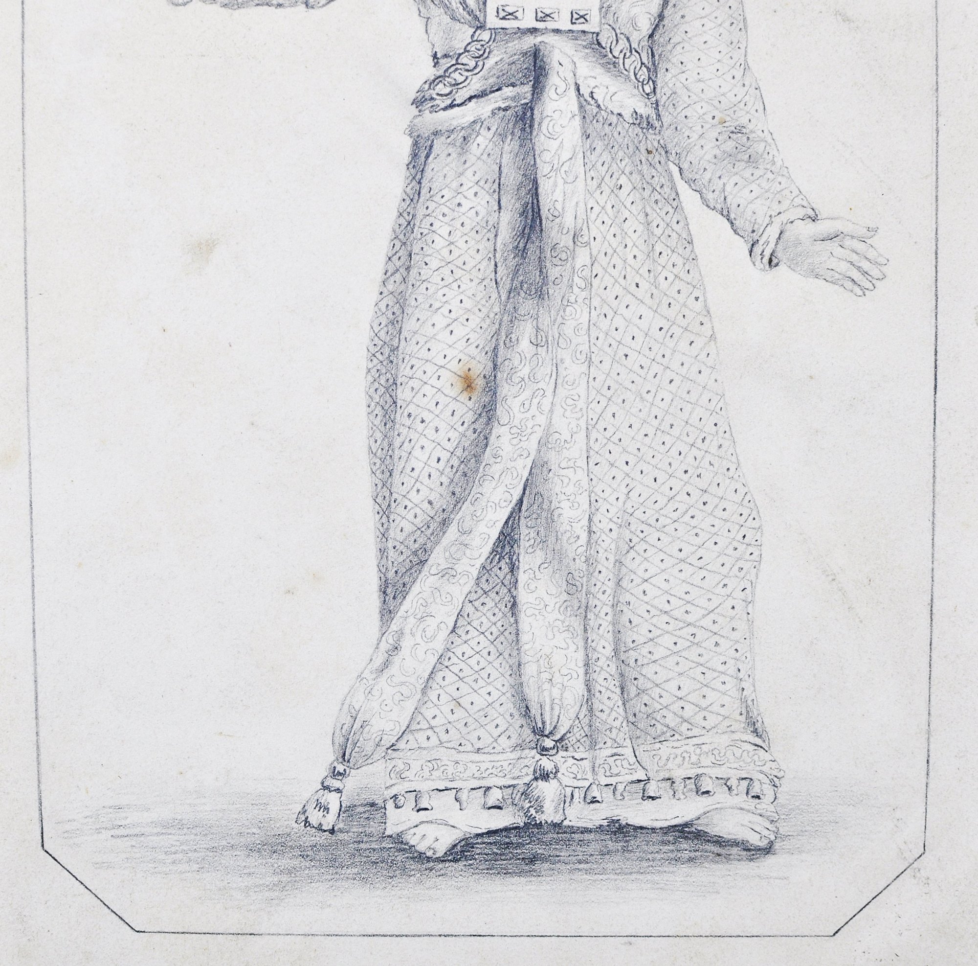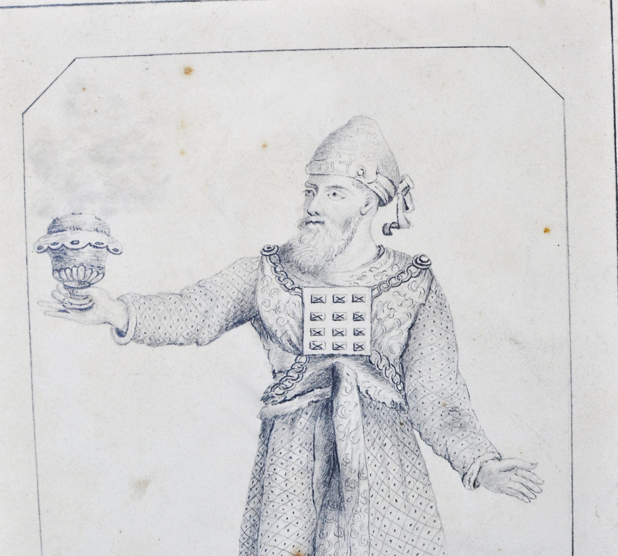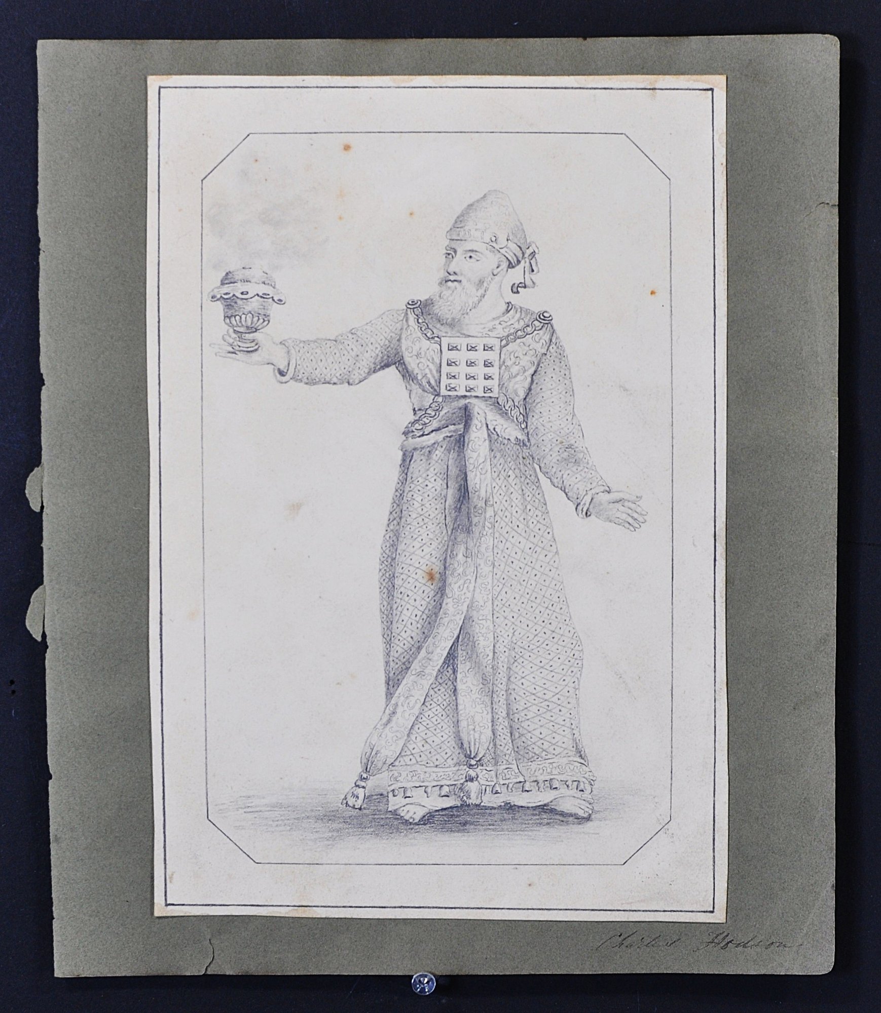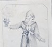Offered is an original antique pencil drawing on paper depicting a richly robed High Priest or biblical-style figure holding a ceremonial vessel. The finely detailed graphite work shows careful rendering of costume patterns and facial features.