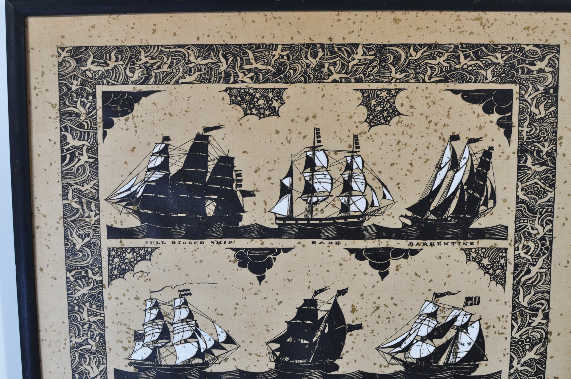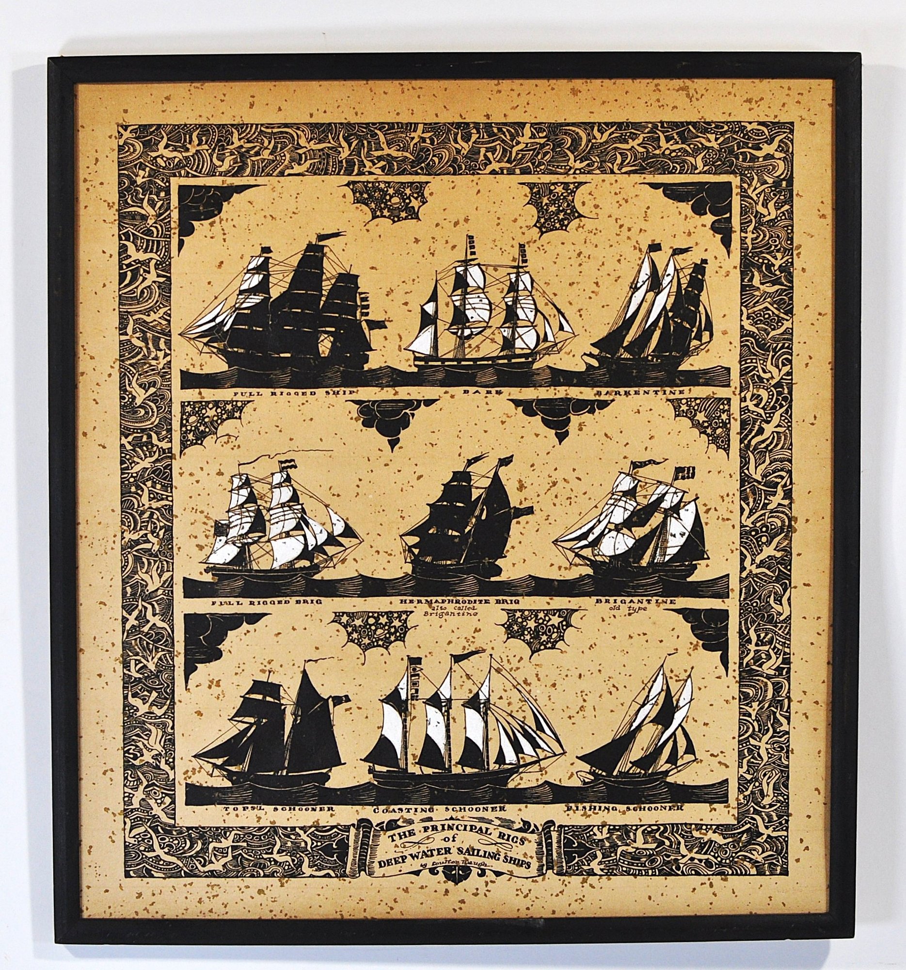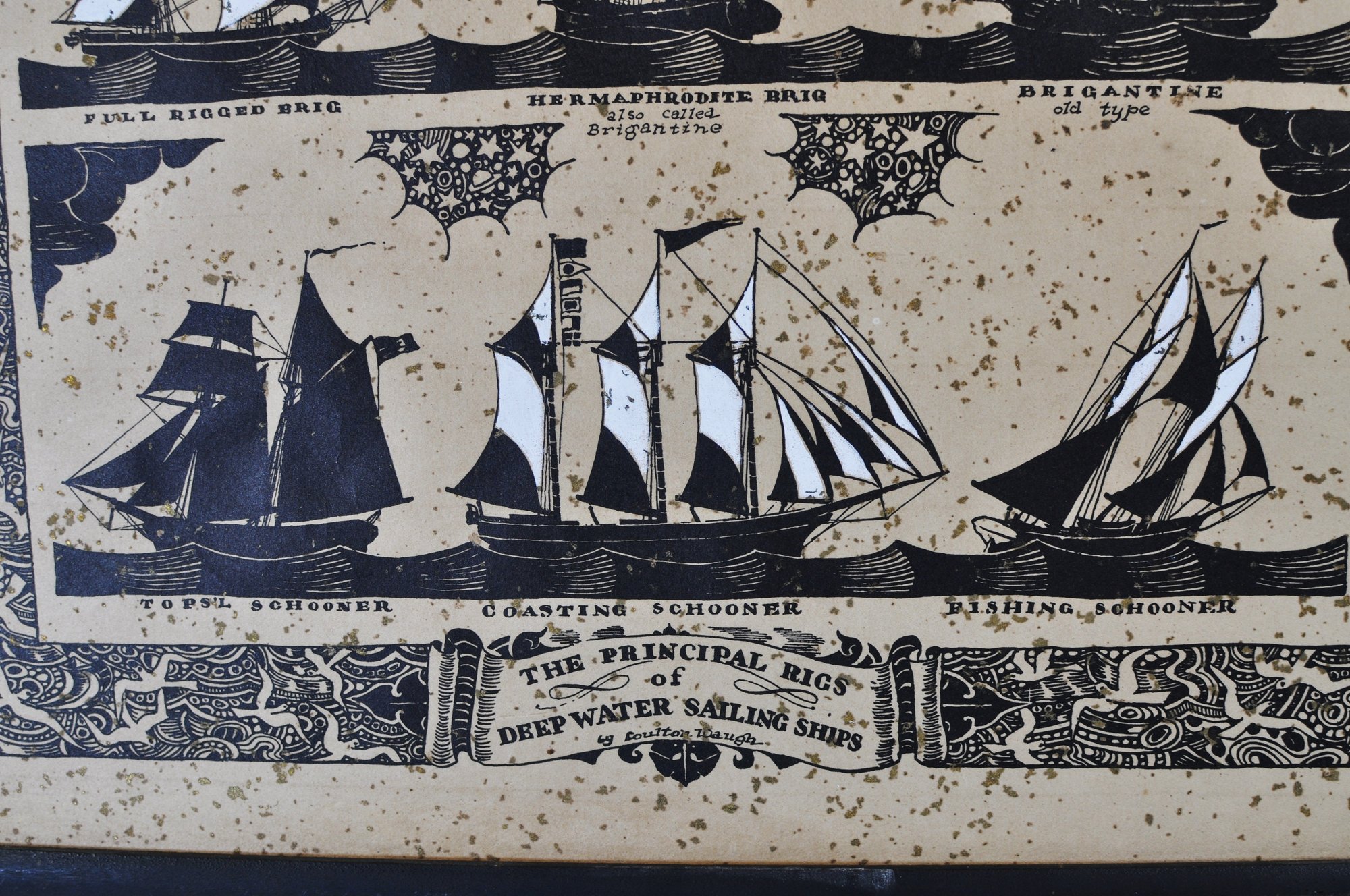 The composition is surrounded by an intricate decorative border filled with stylized nautical motifs, characteristic of Waugh’s illustrative maritime style. The background features intentional gold-tone speckled accents that create a decorative sparkling effect across the paper.
