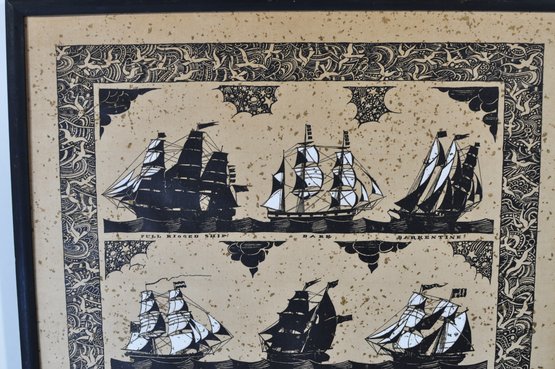 Framed lithograph by Coulton Waugh (1896–1973) titled “The Principal Rigs of Deep Water Sailing Ships.” The print illustrates a variety of classic sailing vessel types including Full Rigged Ship, Bark, Barkentine, Brig, Brigantine, Topsail Schooner, Coasting Schooner, and Fishing Schooner, rendered in bold black graphic silhouettes.