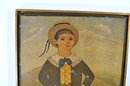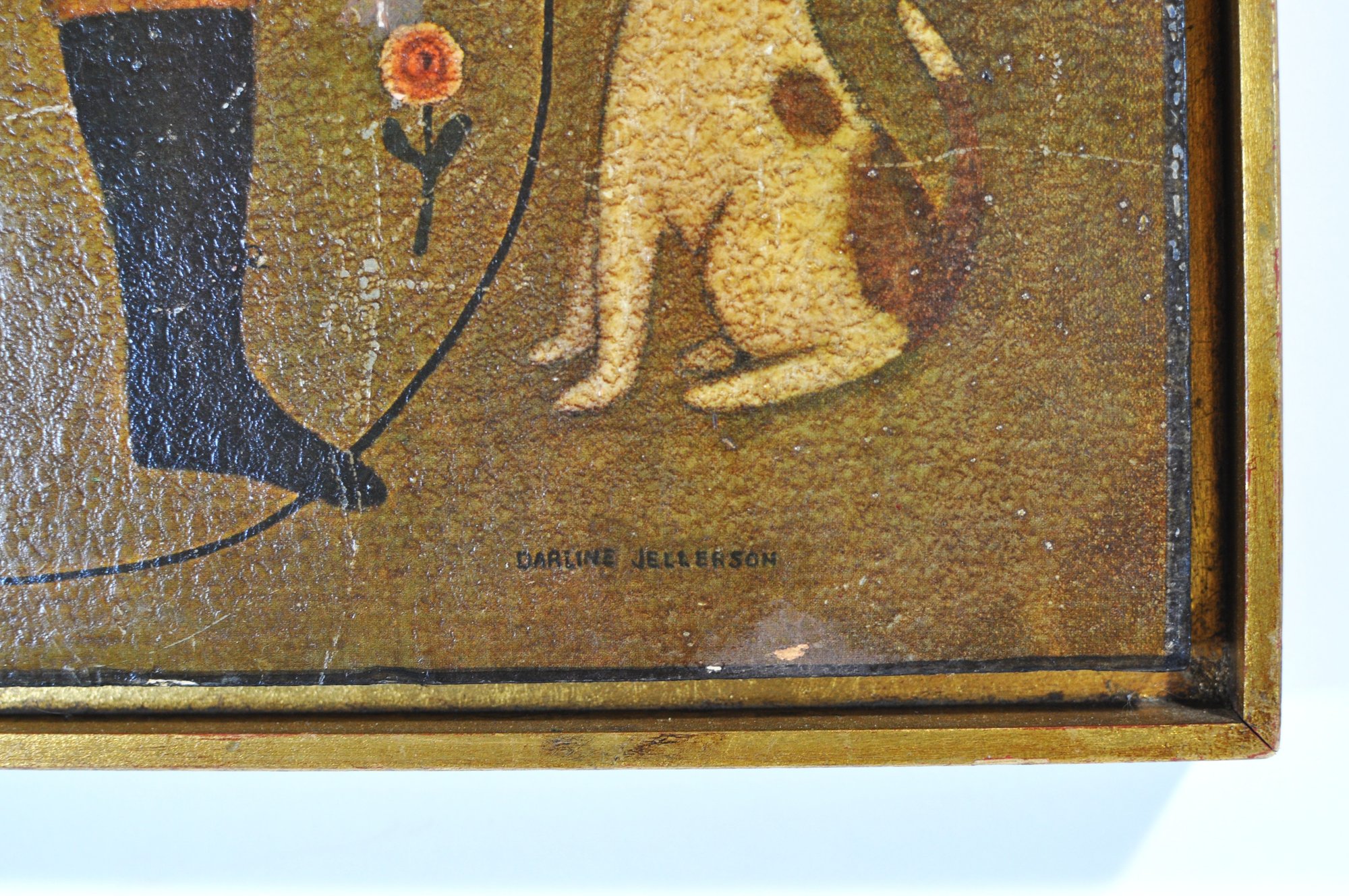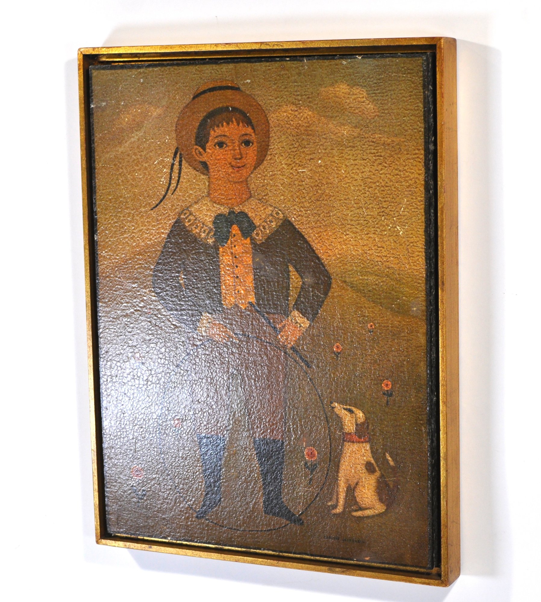 Charming folk art style print by Darlene Jellerson depicting a young boy with a hoop toy and stick, accompanied by a small dog in a simple countryside setting. The composition features stylized flowers and rolling hills rendered in warm earthy tones with a textured surface.
