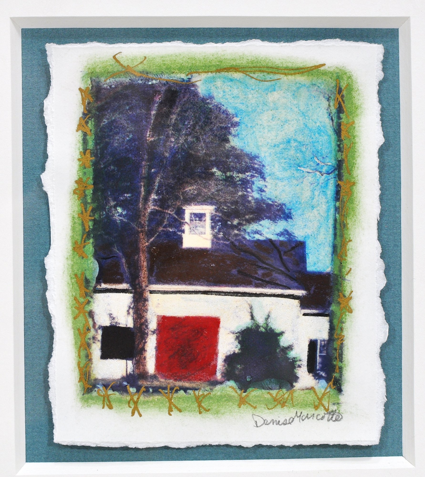Charming mixed media artwork by Boston-based artist Denise Marcotte, depicting a stylized house with a bold red door framed by a tree and soft atmospheric tones. The image is presented on deckled-edge paper with hand-applied embellishments and color accents, giving it a painterly, almost dreamlike quality.