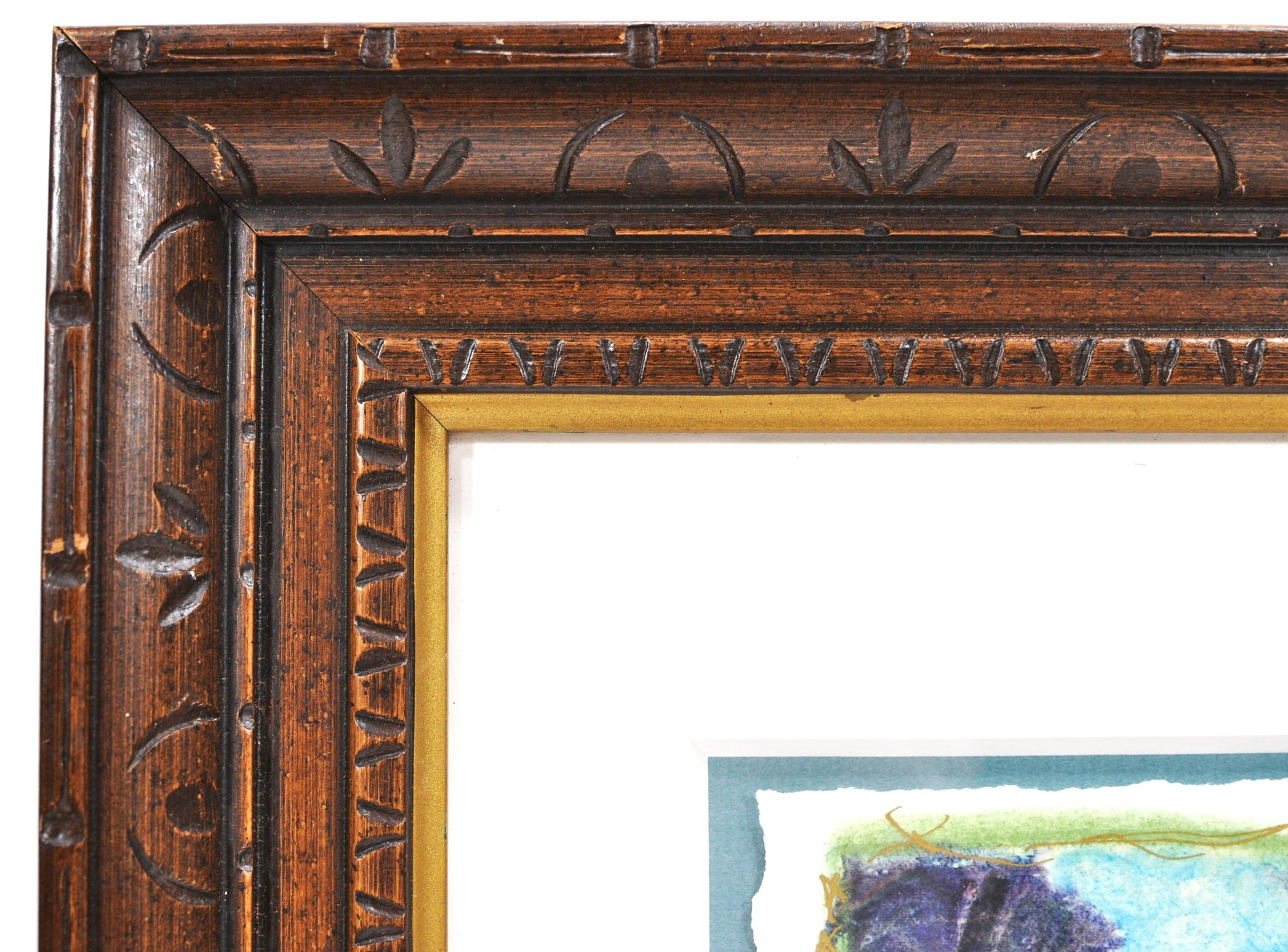 Signed lower right in pencil and attractively matted within a decorative carved wood frame with gilt liner, enhancing its presentation.