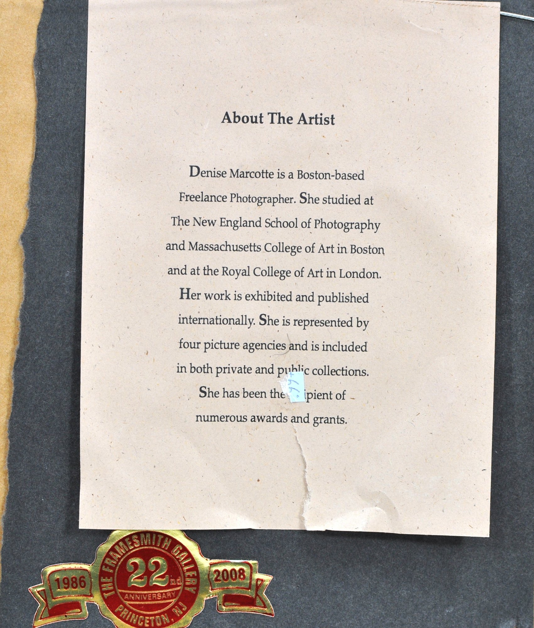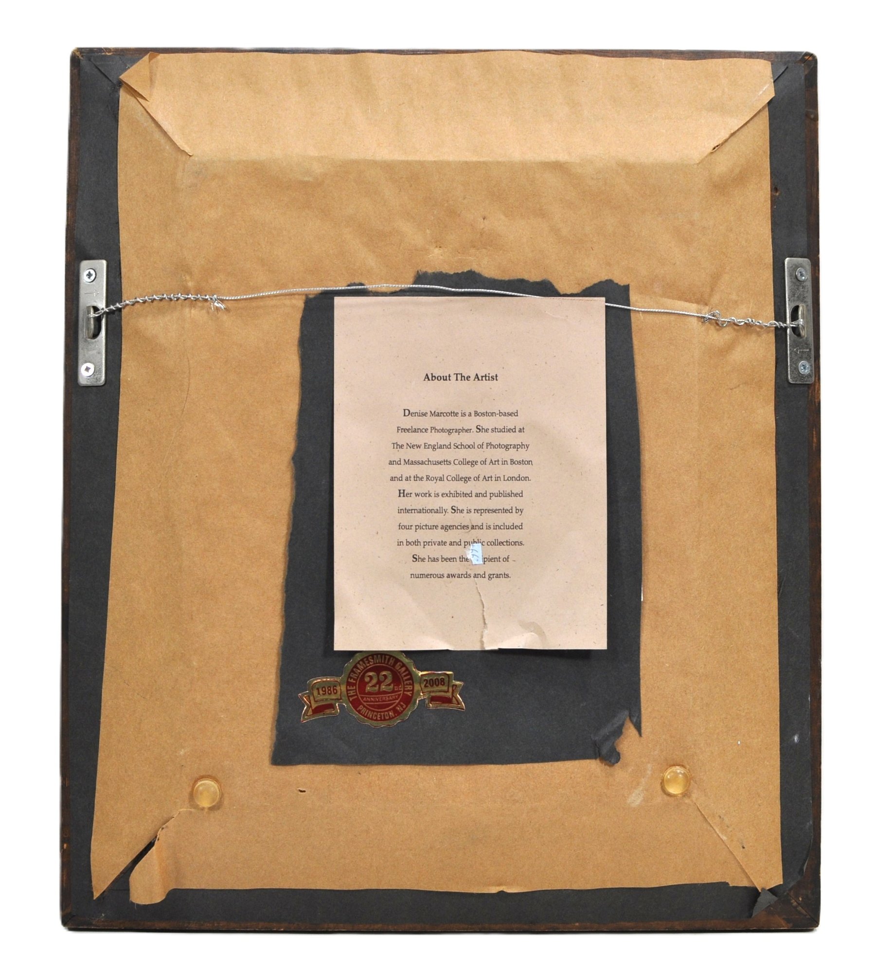 Verso retains artist information sheet noting Marcotte’s background, including studies at the New England School of Photography, Massachusetts College of Art, and the Royal College of Art in London. Gallery label from The Framesmith Gallery, Princeton, NJ (22nd Anniversary, 2008).