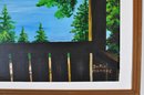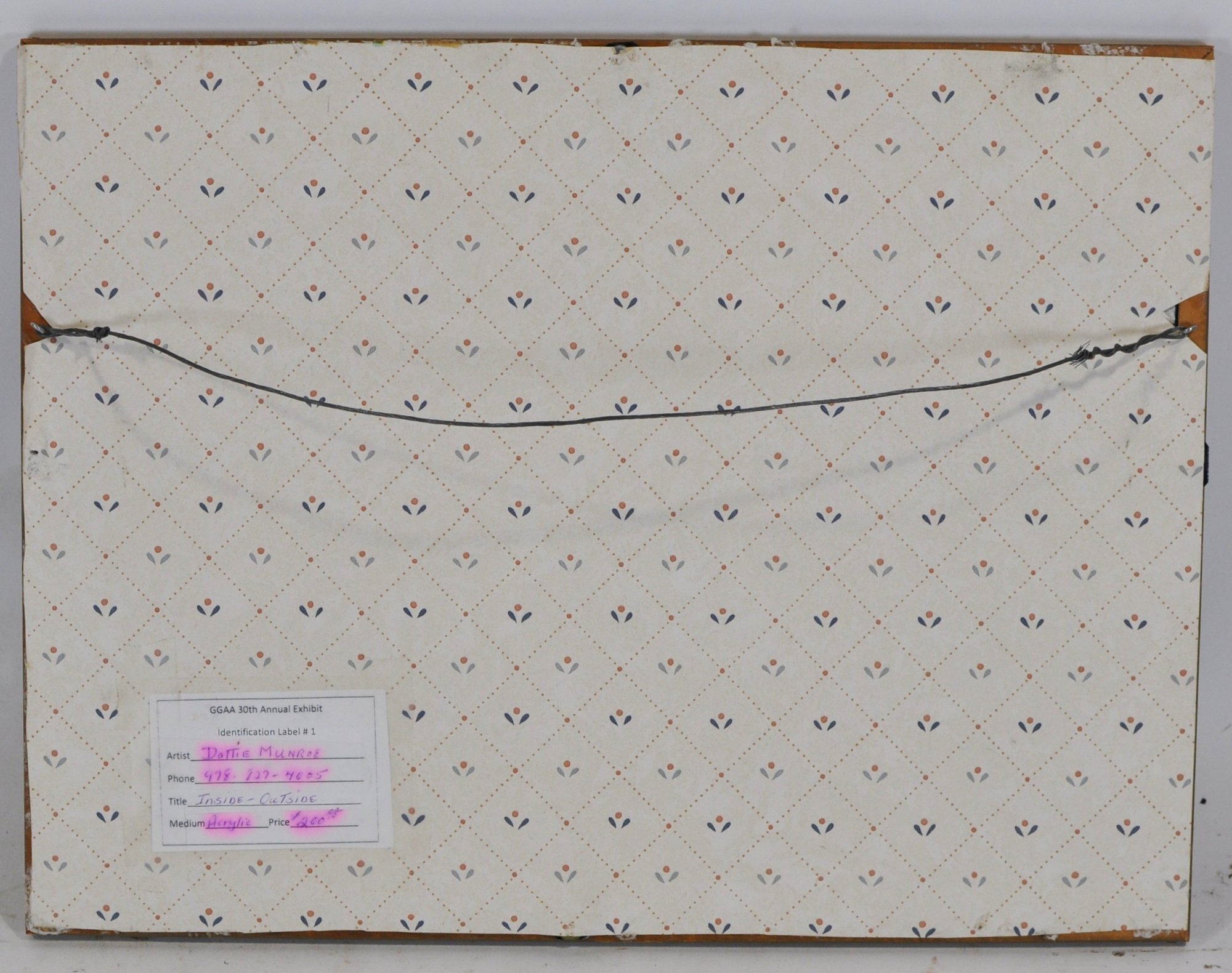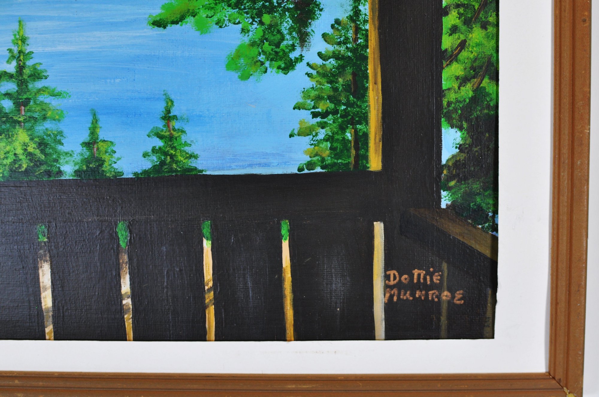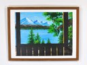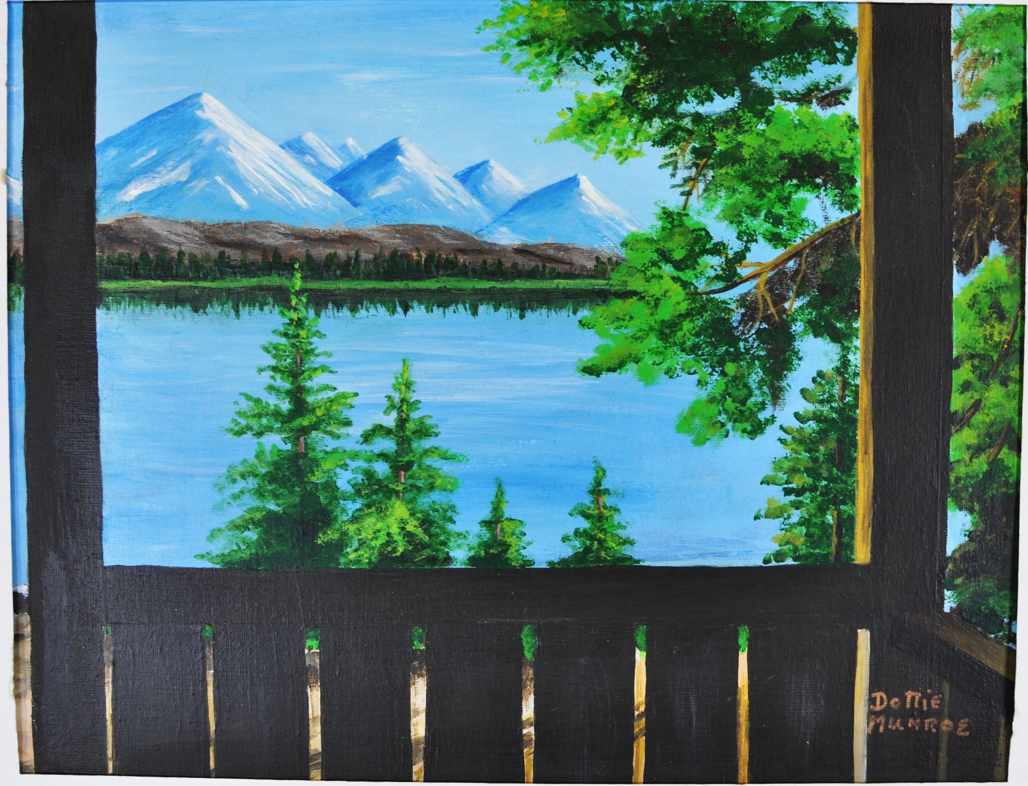 Framed acrylic landscape painting titled “Inside–Outside” by Dottie Munroe, depicting a scenic mountain lake view framed by a porch railing and trees. Brightly colored composition with snow-capped peaks and evergreen forest reflected in calm water. Signed lower right “Dottie Munroe.”