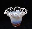 Elegant vintage vase with open lace rim and flowing opaline hues fading from white to soft blue and amber. Hand-blown with ruffled edge and polished base.