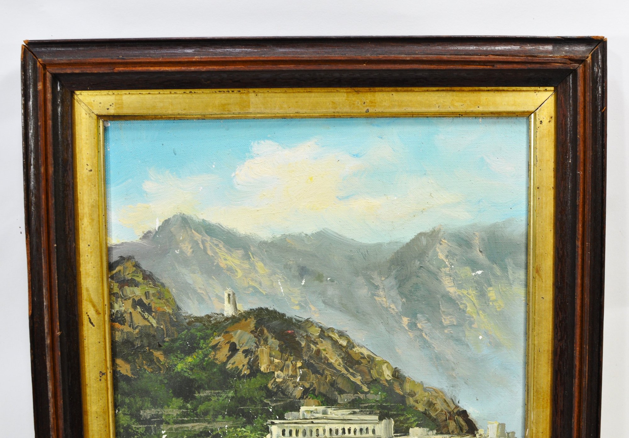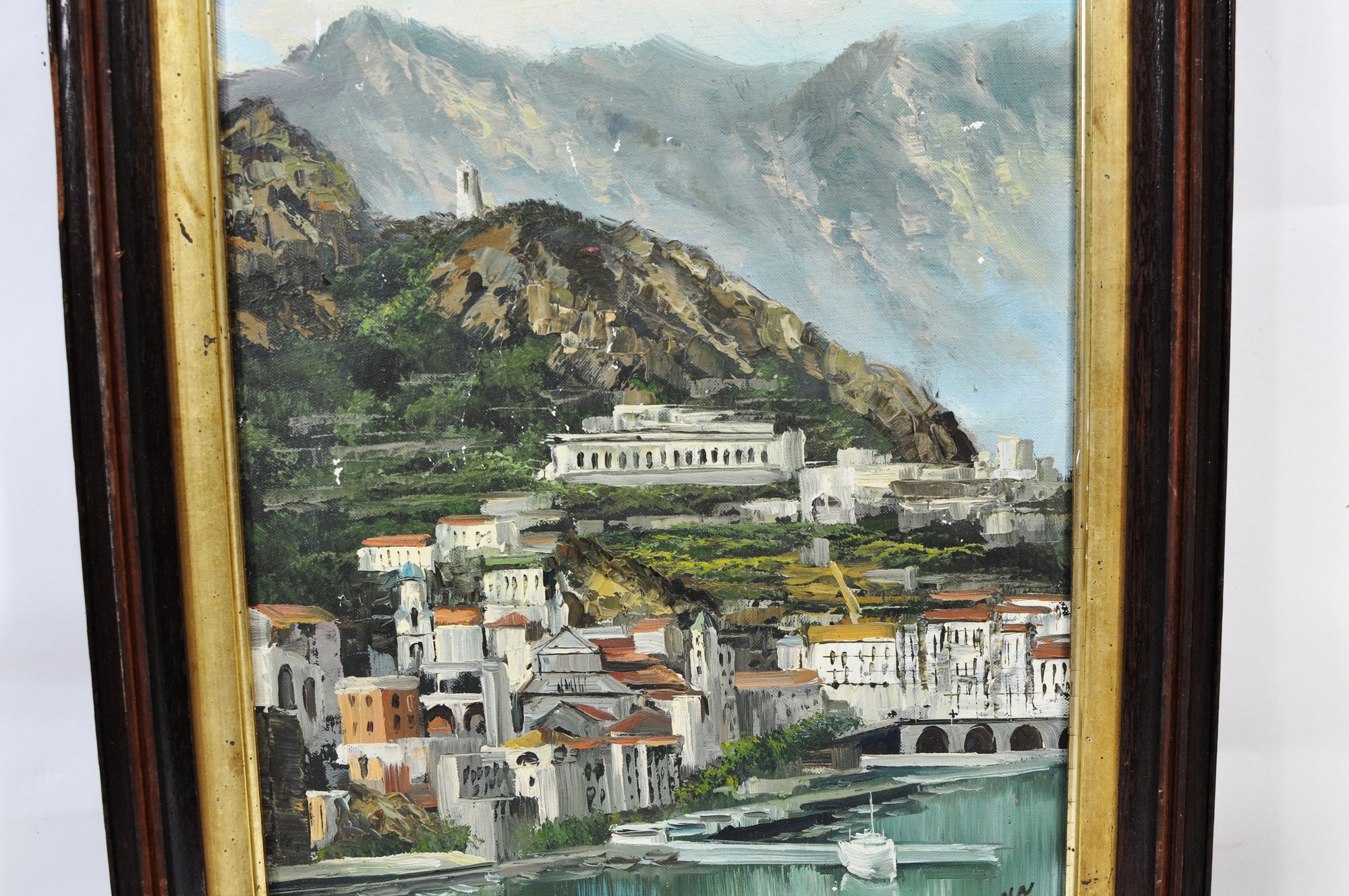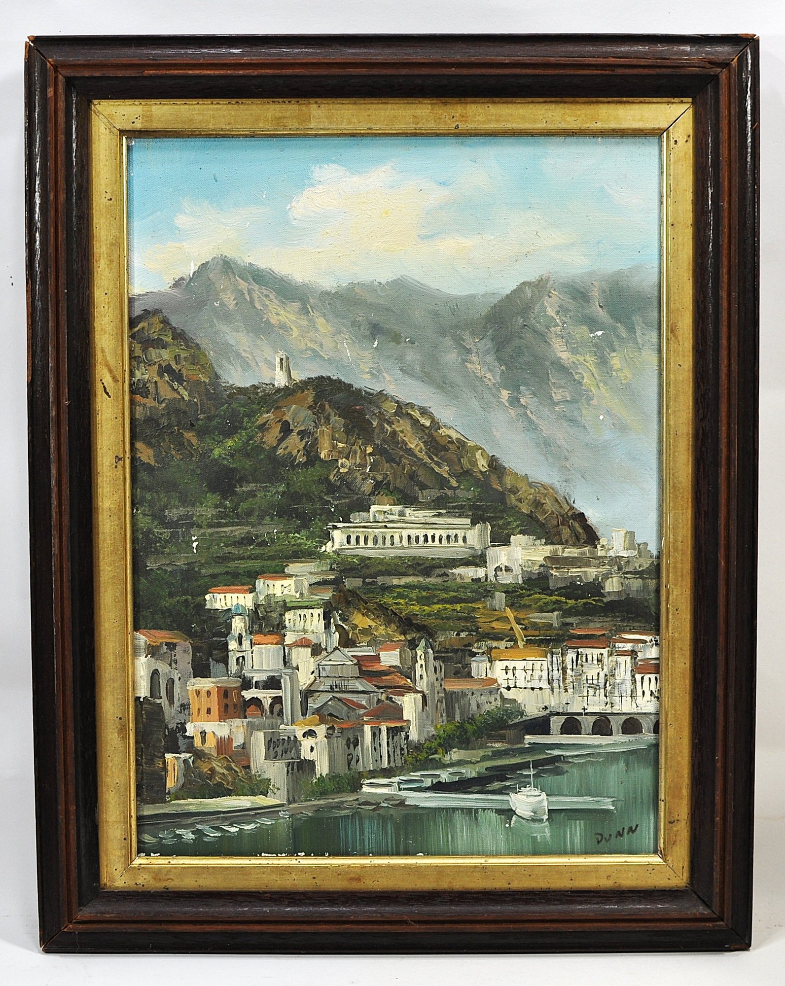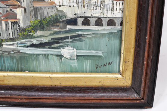 Charming vintage oil on canvas depicting a Mediterranean-style coastal town with clustered white buildings, arched bridge, and harbor scene set against dramatic mountain peaks. The composition features a small boat in calm waters and terraced architecture reminiscent of Italian or Adriatic coastal landscapes. Signed “Dunn” lower right.