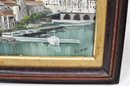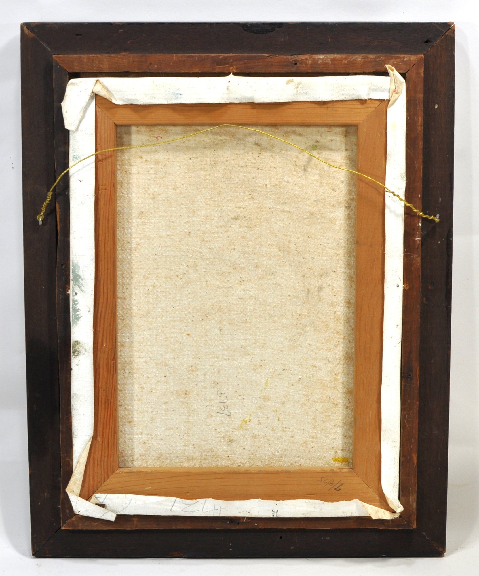 Condition: Good overall vintage condition. Scattered paint loss and surface wear visible, particularly in sky and mid-ground areas. Frame with age-related wear and minor scuffs.