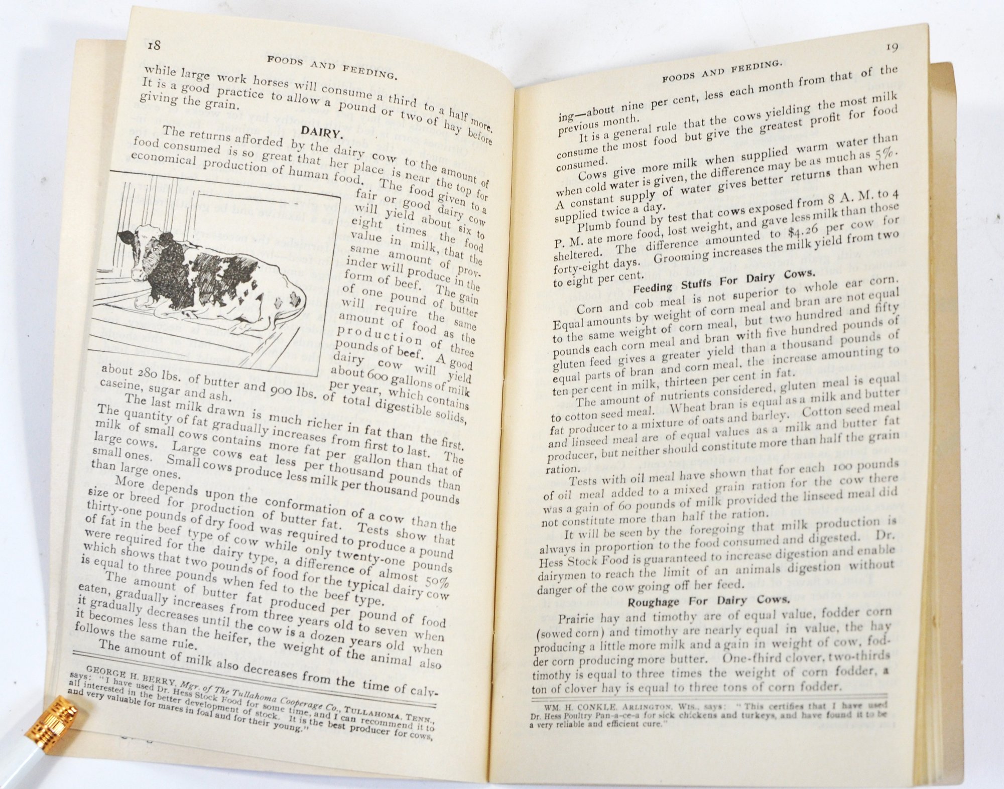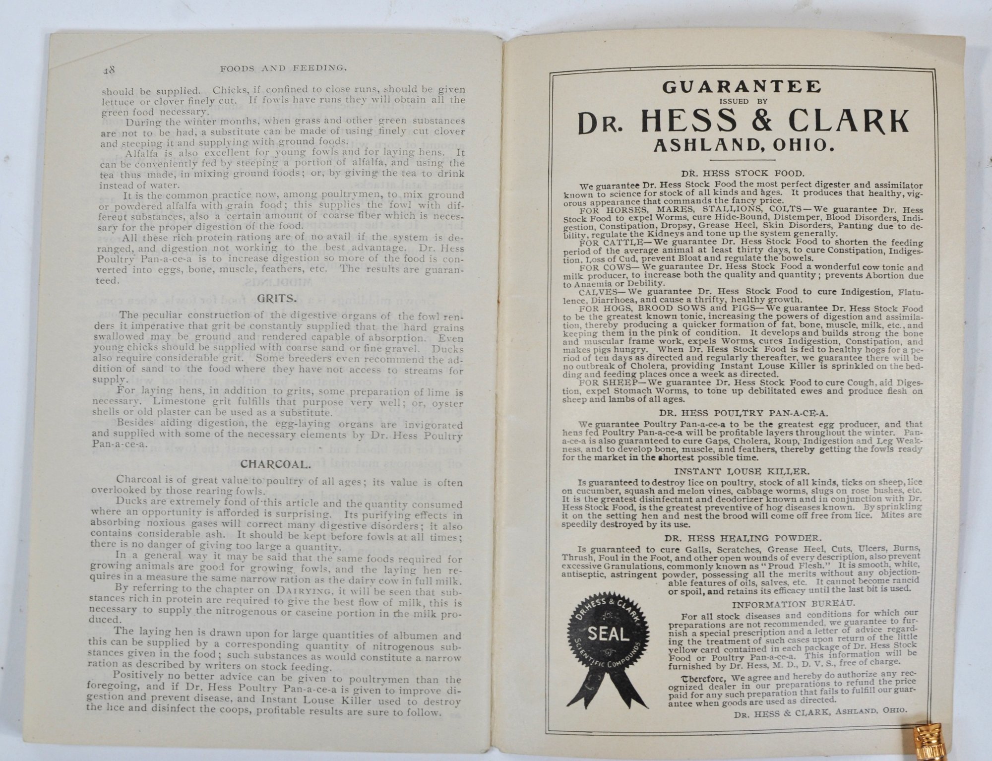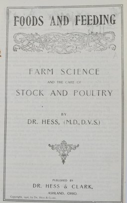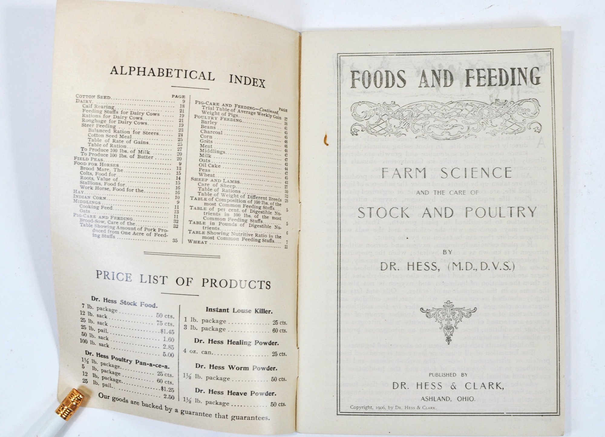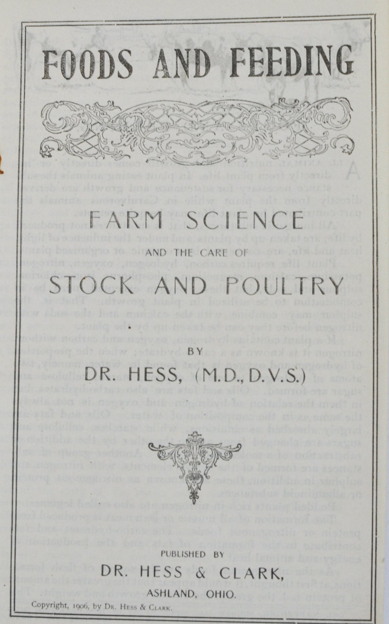 An illustrated booklet “Foods and Feeding: Farm Science and the Care of Stock and Poultry” by Dr. Hess (M.D., D.V.S.), published by Dr. Hess & Clark, 1906.