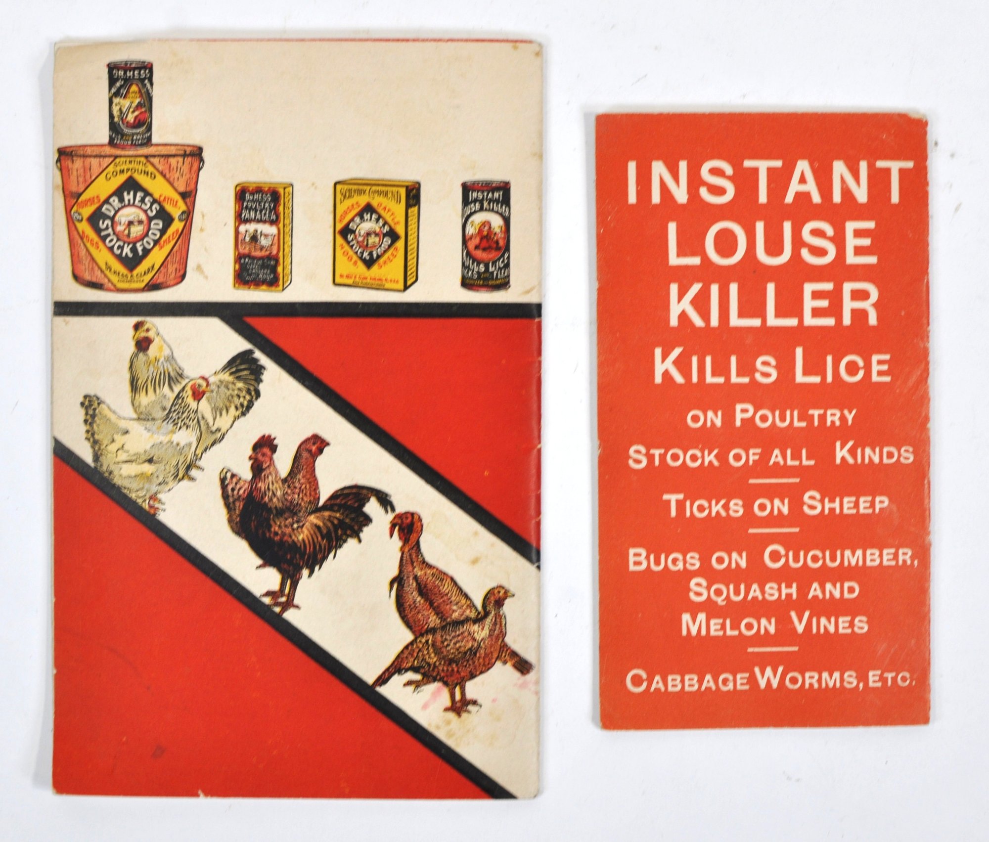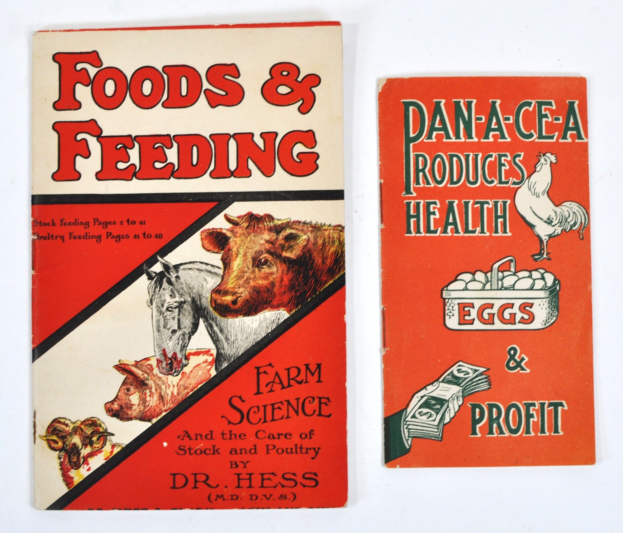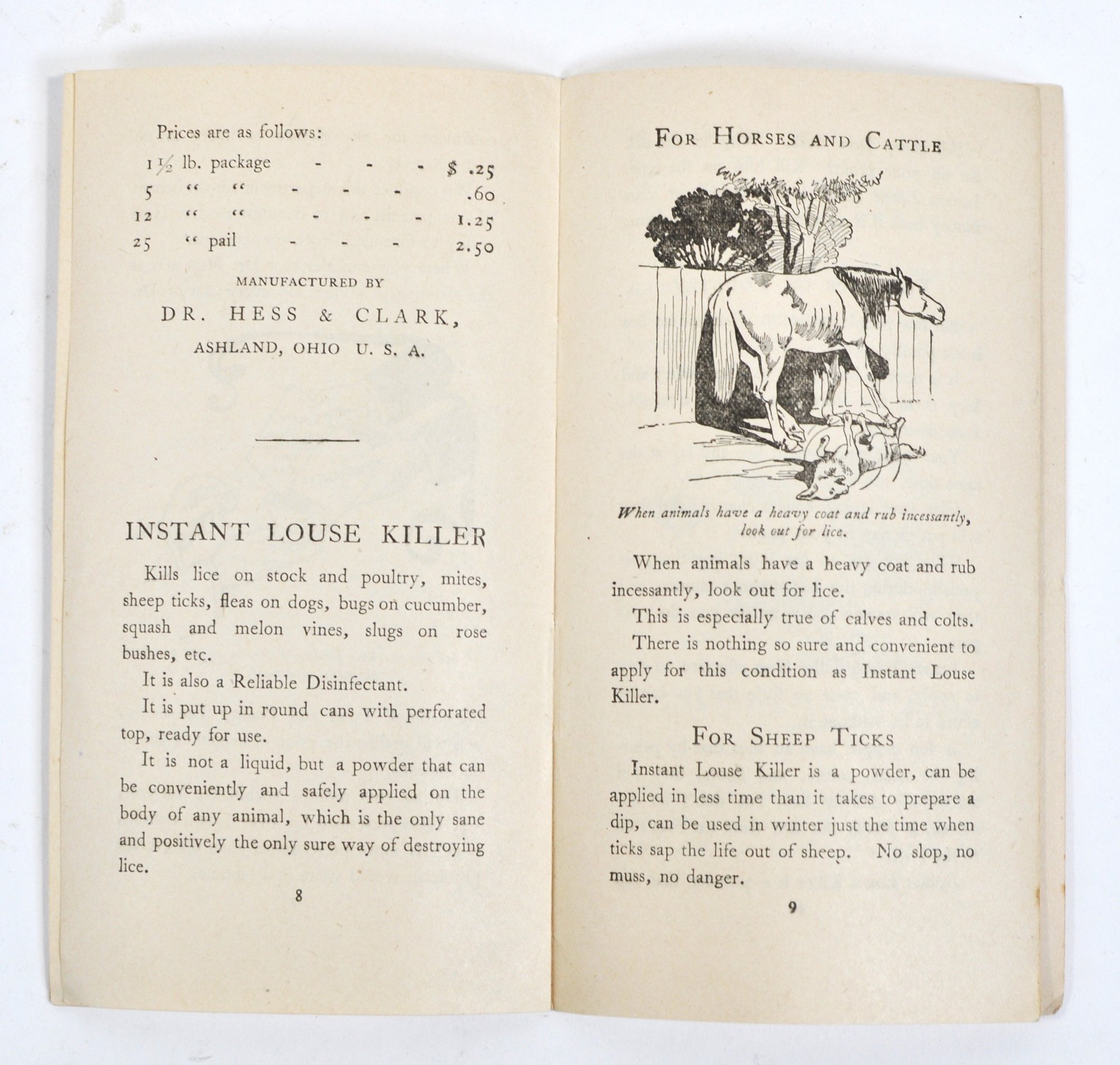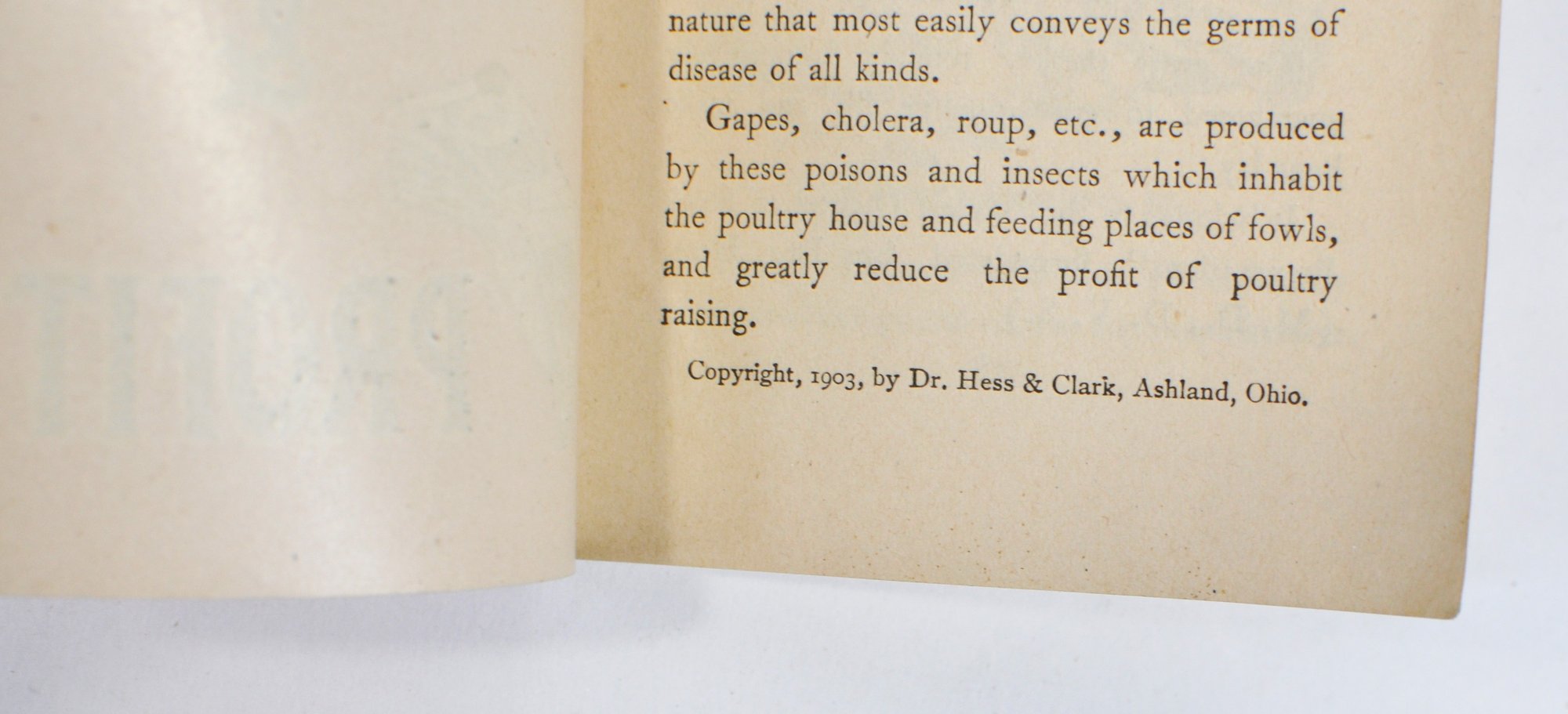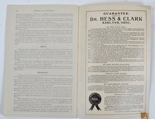 An illustrated booklet “Foods and Feeding: Farm Science and the Care of Stock and Poultry” by Dr. Hess (M.D., D.V.S.), published by Dr. Hess & Clark, 1906.