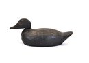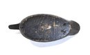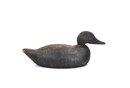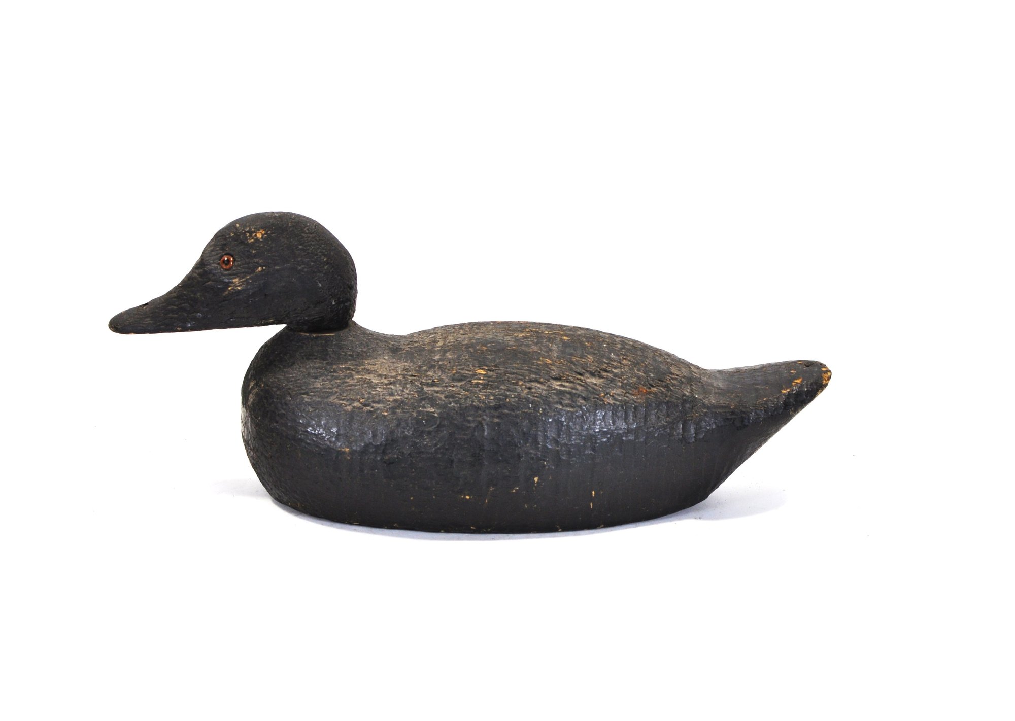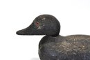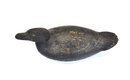 Solid hand-carved wooden duck decoy with a classic low-profile form and slightly elongated bill. Finished in a worn black paint with a textured, time-softened surface showing age and use. The underside shows old wear, age cracks, and working holes consistent with field use, suggesting an earlier utilitarian hunting decoy rather than decorative piece.