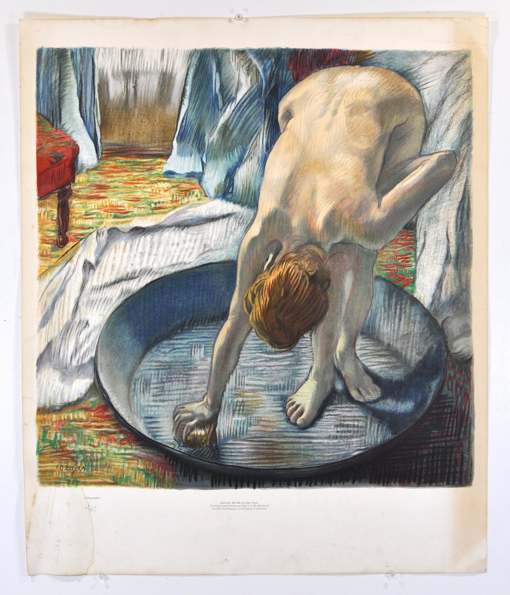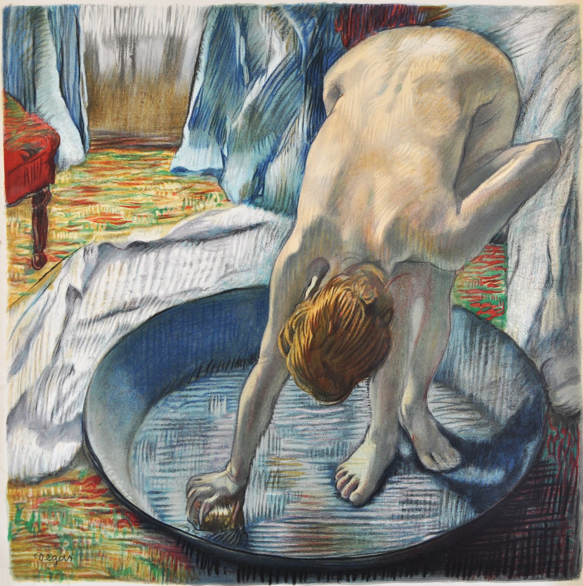 First edition color lithograph executed after Degas’s pastel The Tub, produced from hand drawings by lithographer Marc Kniebihler. Printed using twenty-seven individual colors on Arches paper and signed in pencil by the lithographer. Numbered from an edition of 450, with additional artist proofs.