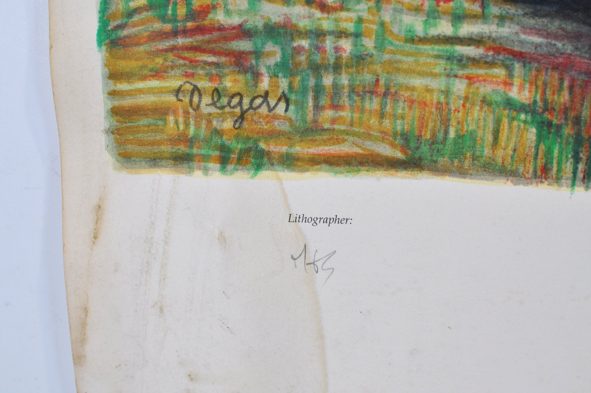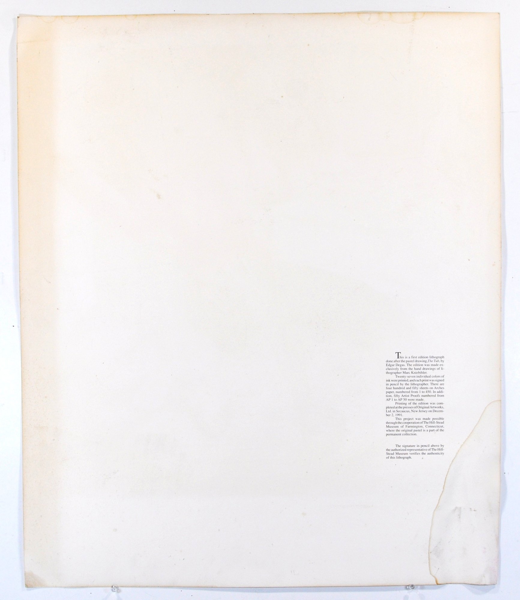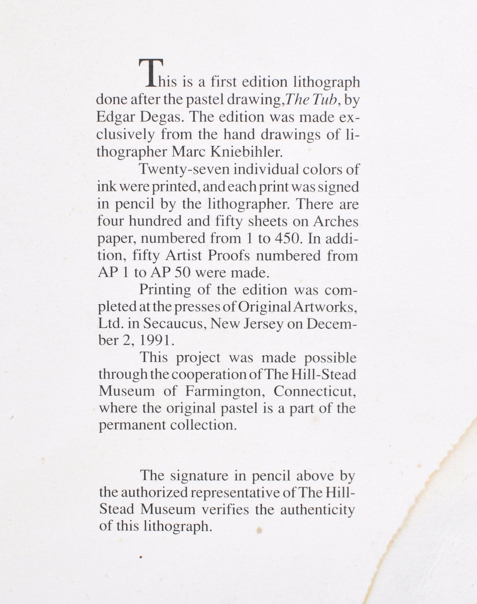 Printed at Original Artworks, Ltd., Secaucus, New Jersey, December 2, 1991, in cooperation with The Hill-Stead Museum, Farmington, Connecticut, where the original Degas pastel resides in the permanent collection. Includes printed certification text and pencil authentication signature from an authorized museum representative.