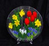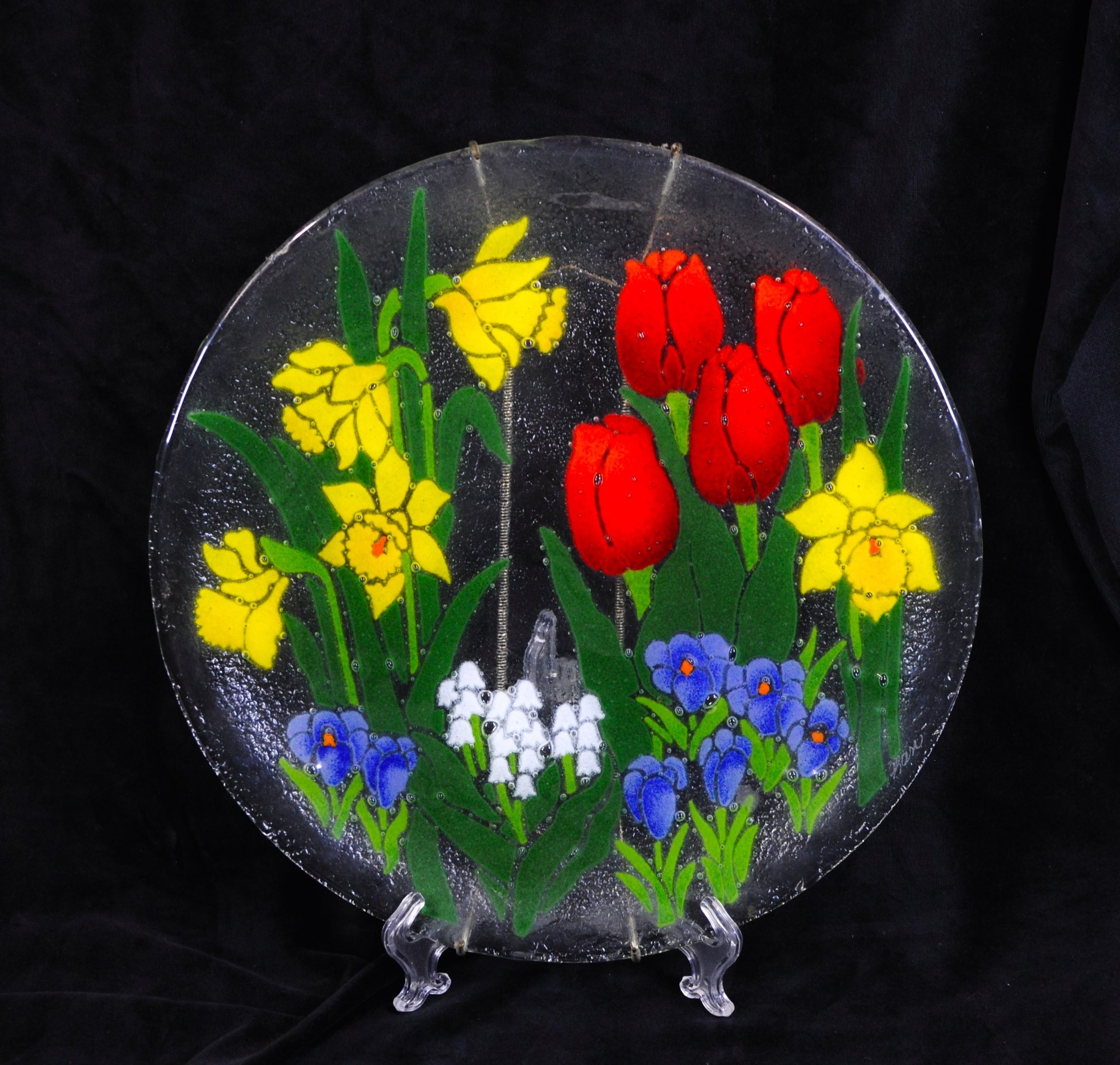 Vibrant fused glass art plate by Peggy Carr, featuring a colorful spring floral design with red tulips, yellow daffodils, blue crocus, and white lilies of the valley against a clear textured background.