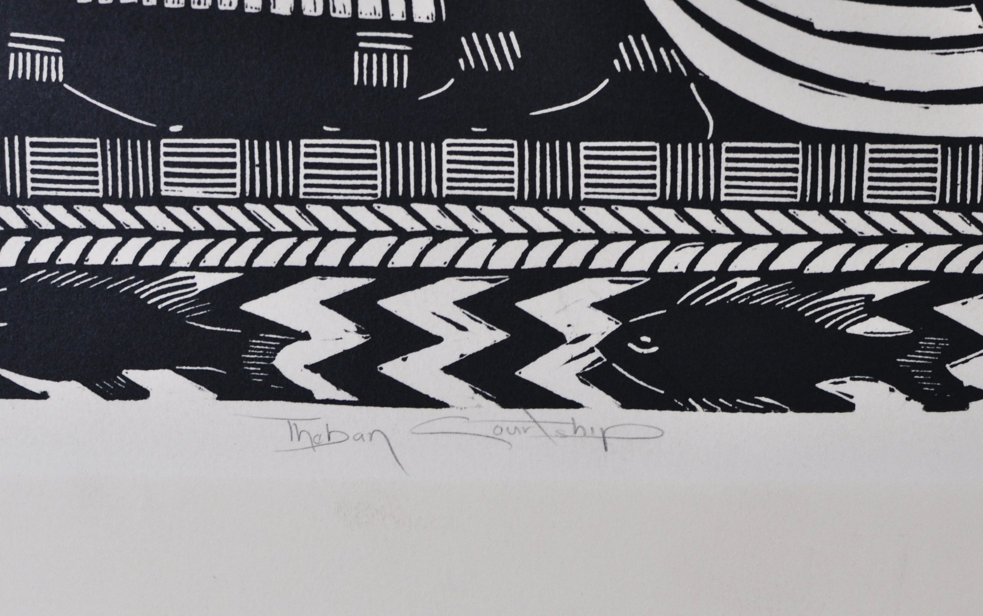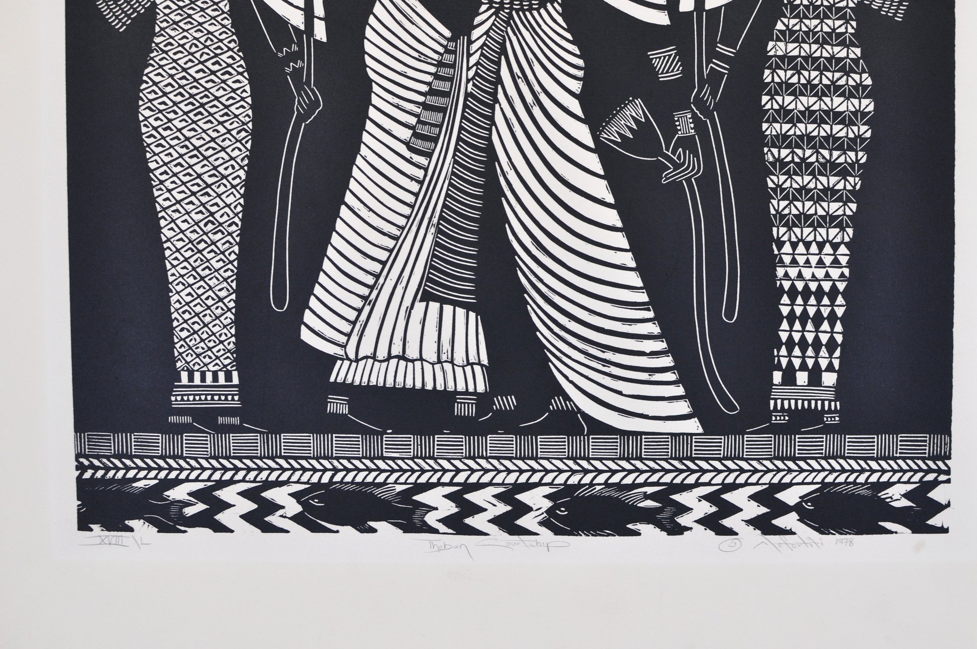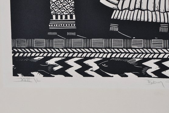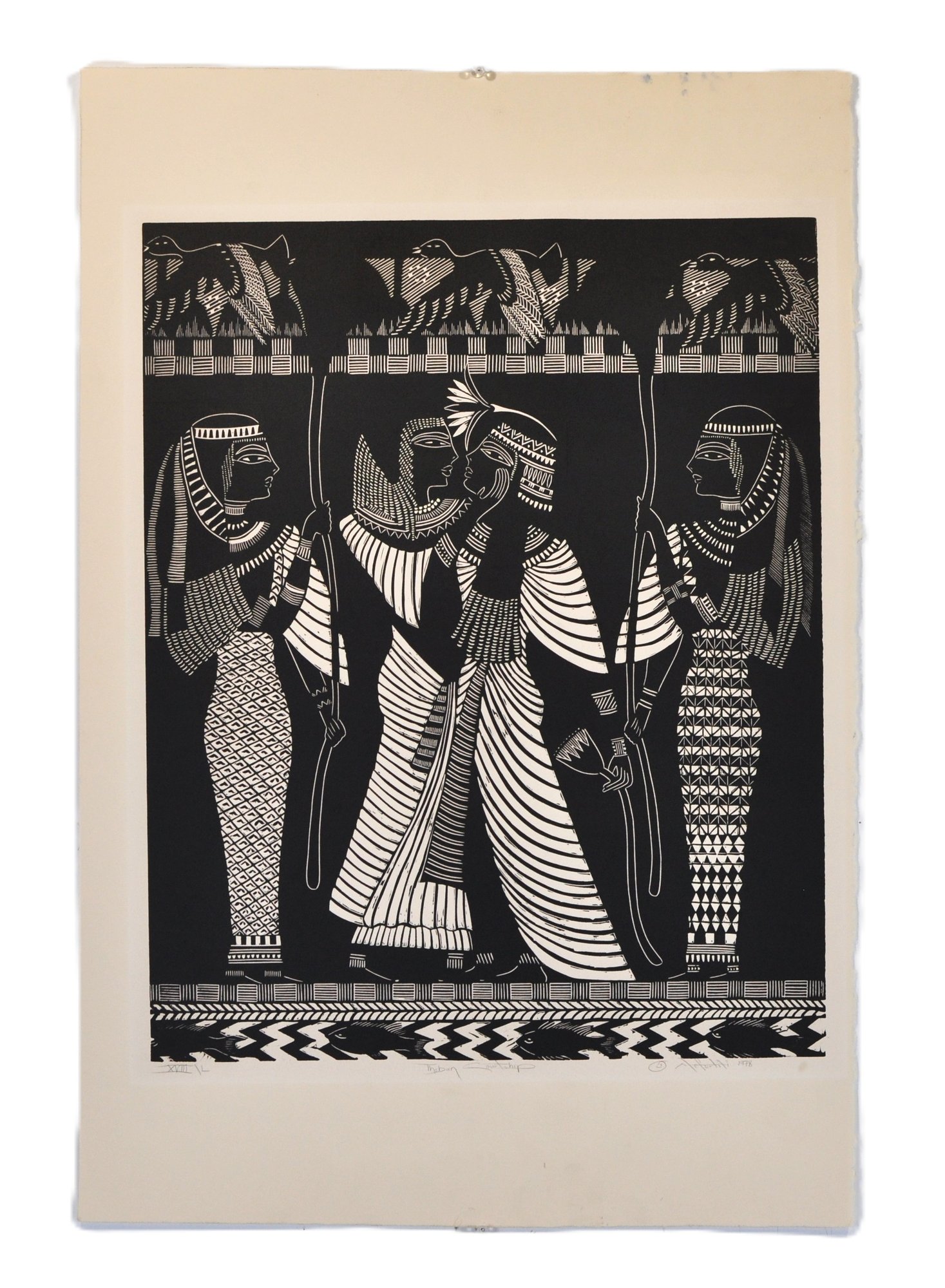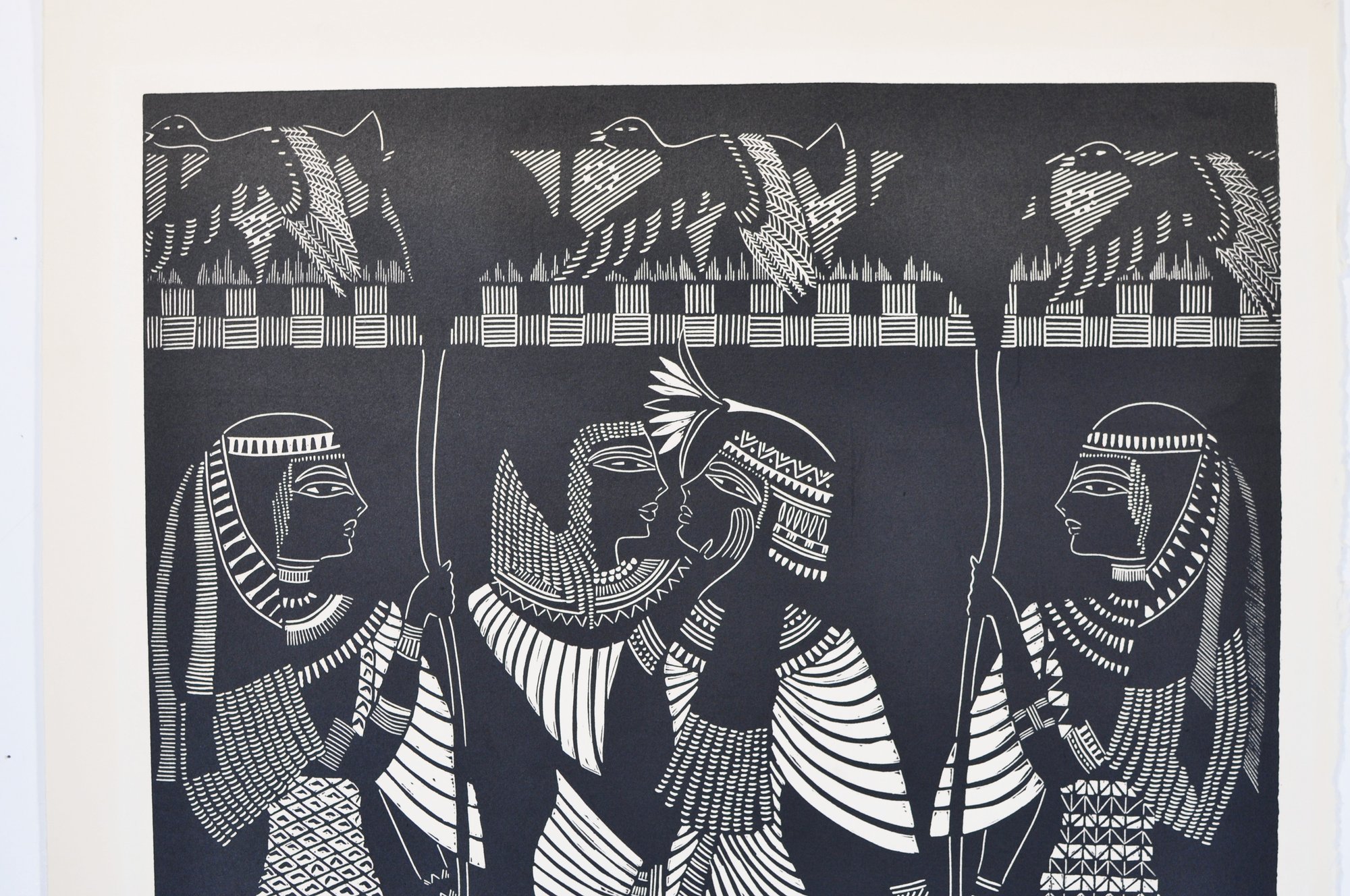 Striking black-and-white woodcut print depicting stylized Egyptian figures in profile.