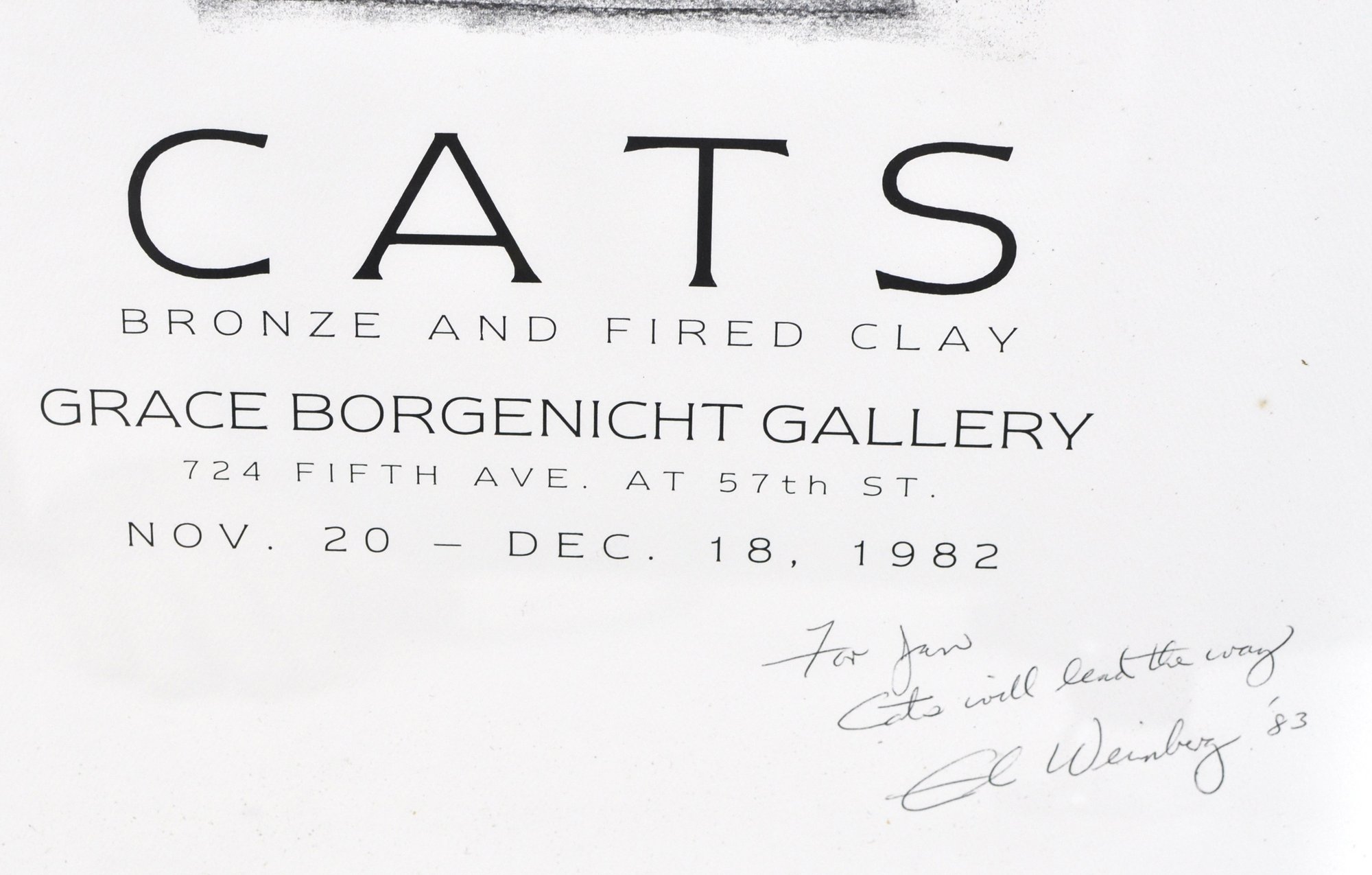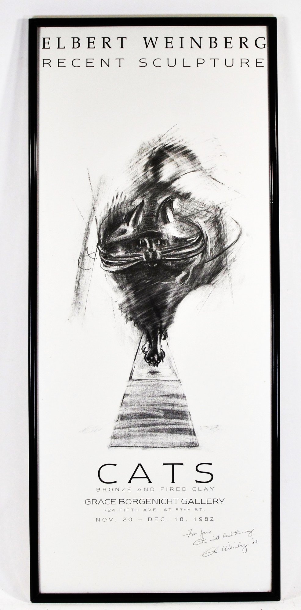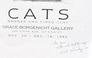 Original exhibition poster for Elbert Weinberg: Recent Sculpture, titled Cats, showcasing bronze and fired clay works. Issued for the Grace Borgenicht Gallery, New York, November 20 – December 18, 1982.