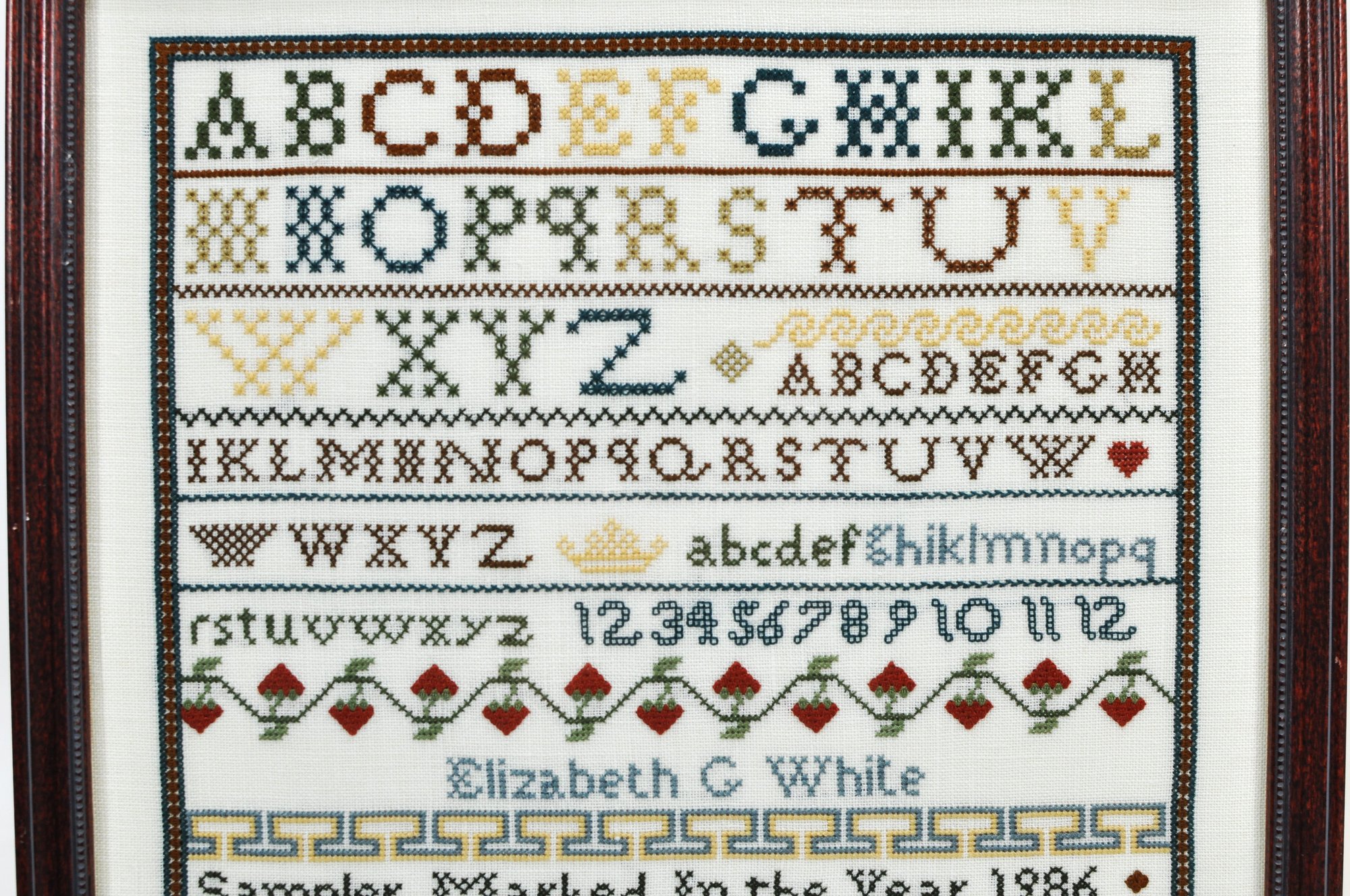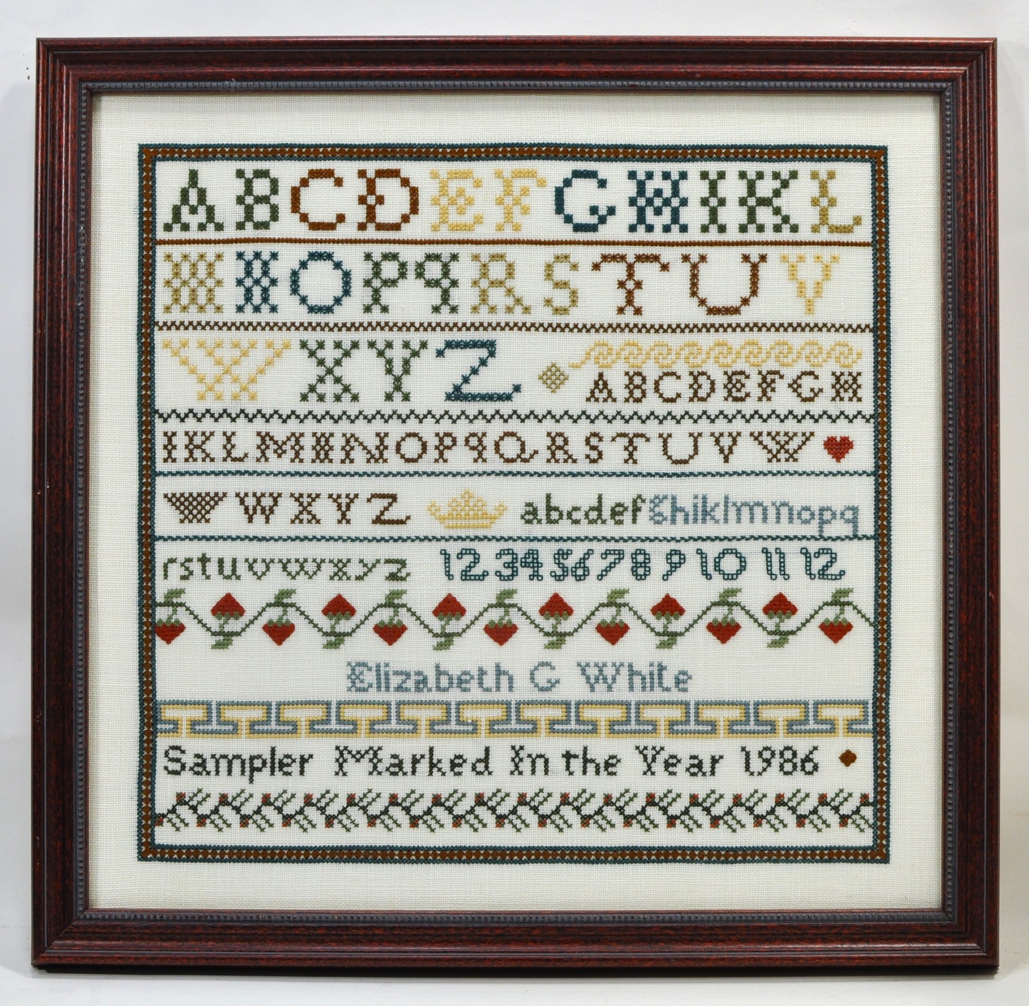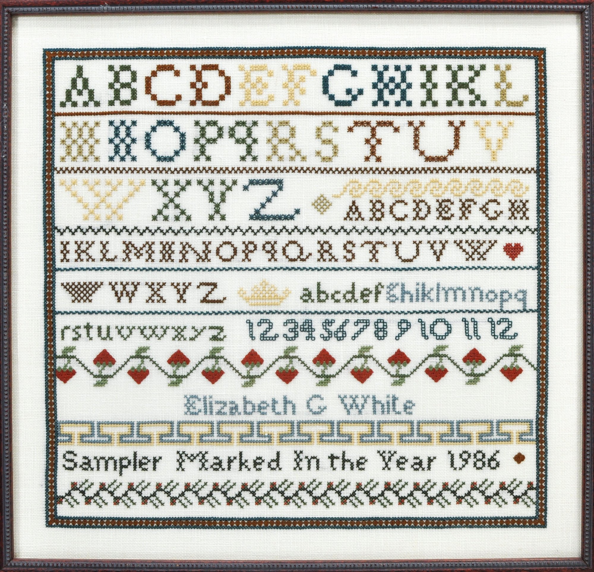 Hand-stitched cross-stitch sampler titled “Sampler Marked In the Year 1986,” signed Elizabeth C. White. Executed in traditional format with alphabet rows, numerals, and decorative borders including hearts and floral motifs. Worked in multicolor threads on fabric, demonstrating careful counted stitch technique in the style of classic American samplers.