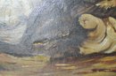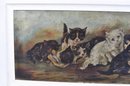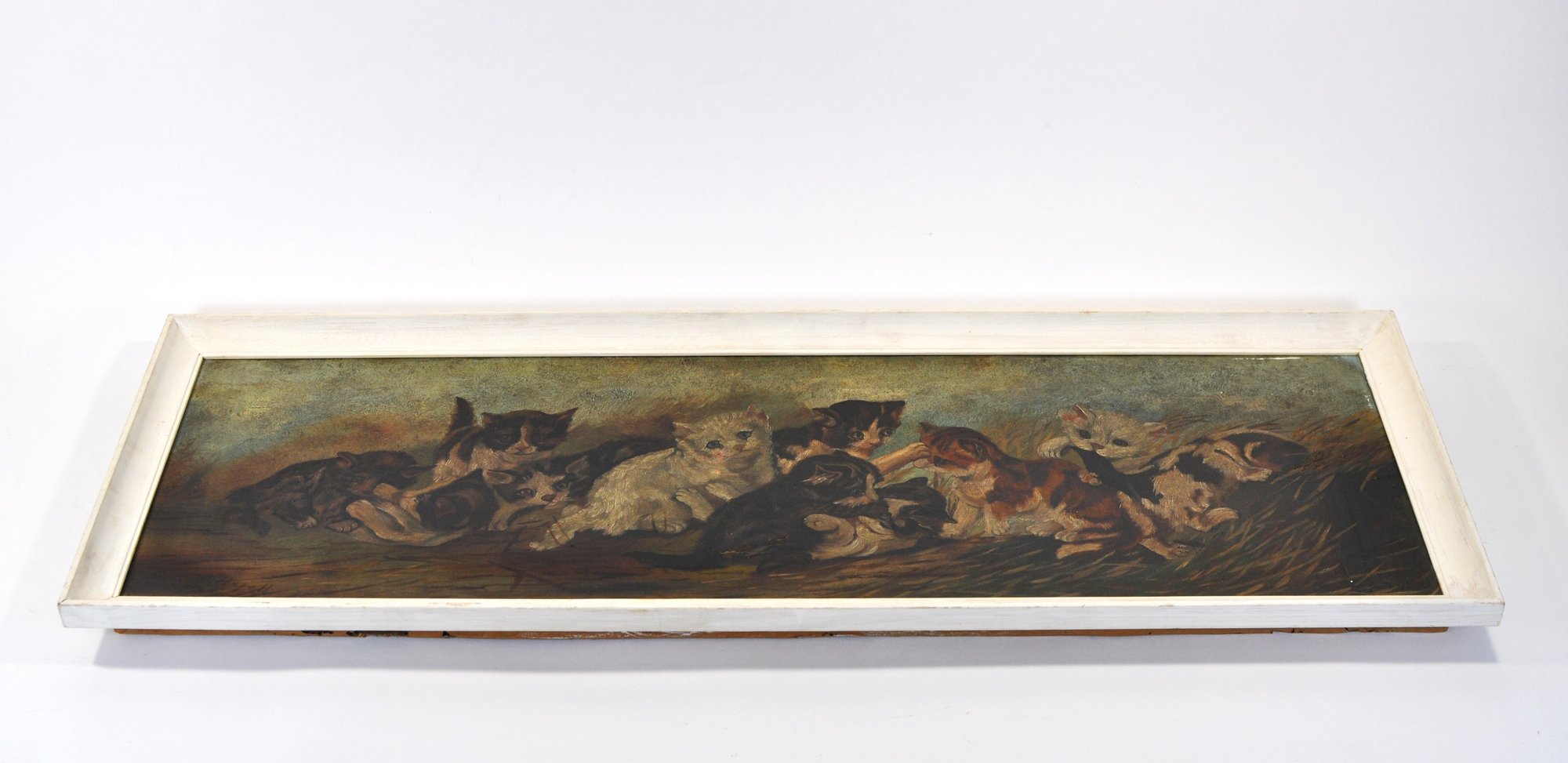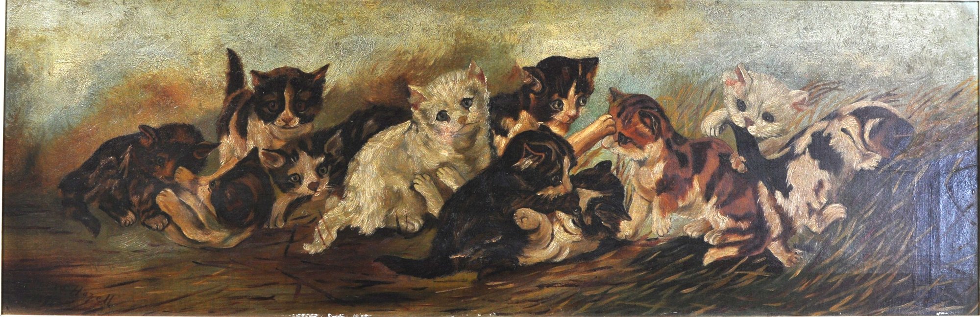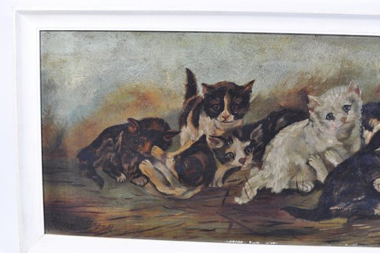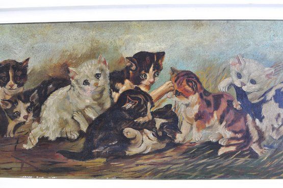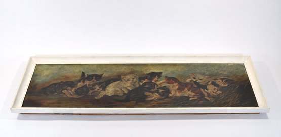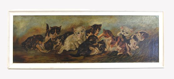 Delightful vintage oil painting on canvas featuring a lively group of playful kittens gathered in a natural outdoor setting. Warm tones, expressive faces, and charming details bring this long horizontal scene to life, making it a wonderful decorative focal point for any space.