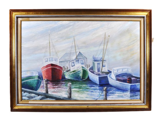 Large original oil painting by Rhode Island artist and art educator Esther Chester, depicting a colorful row of fishing boats docked at a quiet harbor. Bold brushwork and a cool coastal palette give the scene strong New England character and atmosphere.