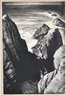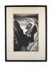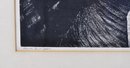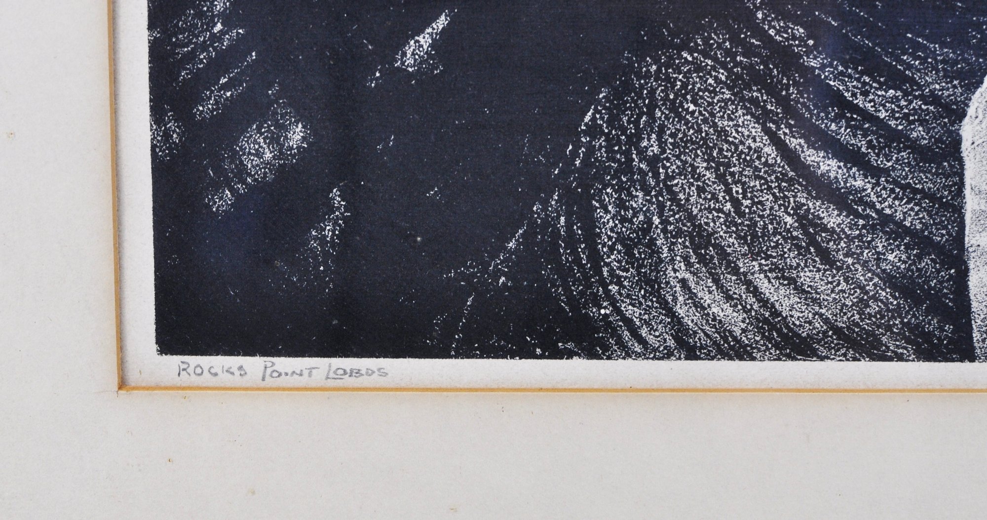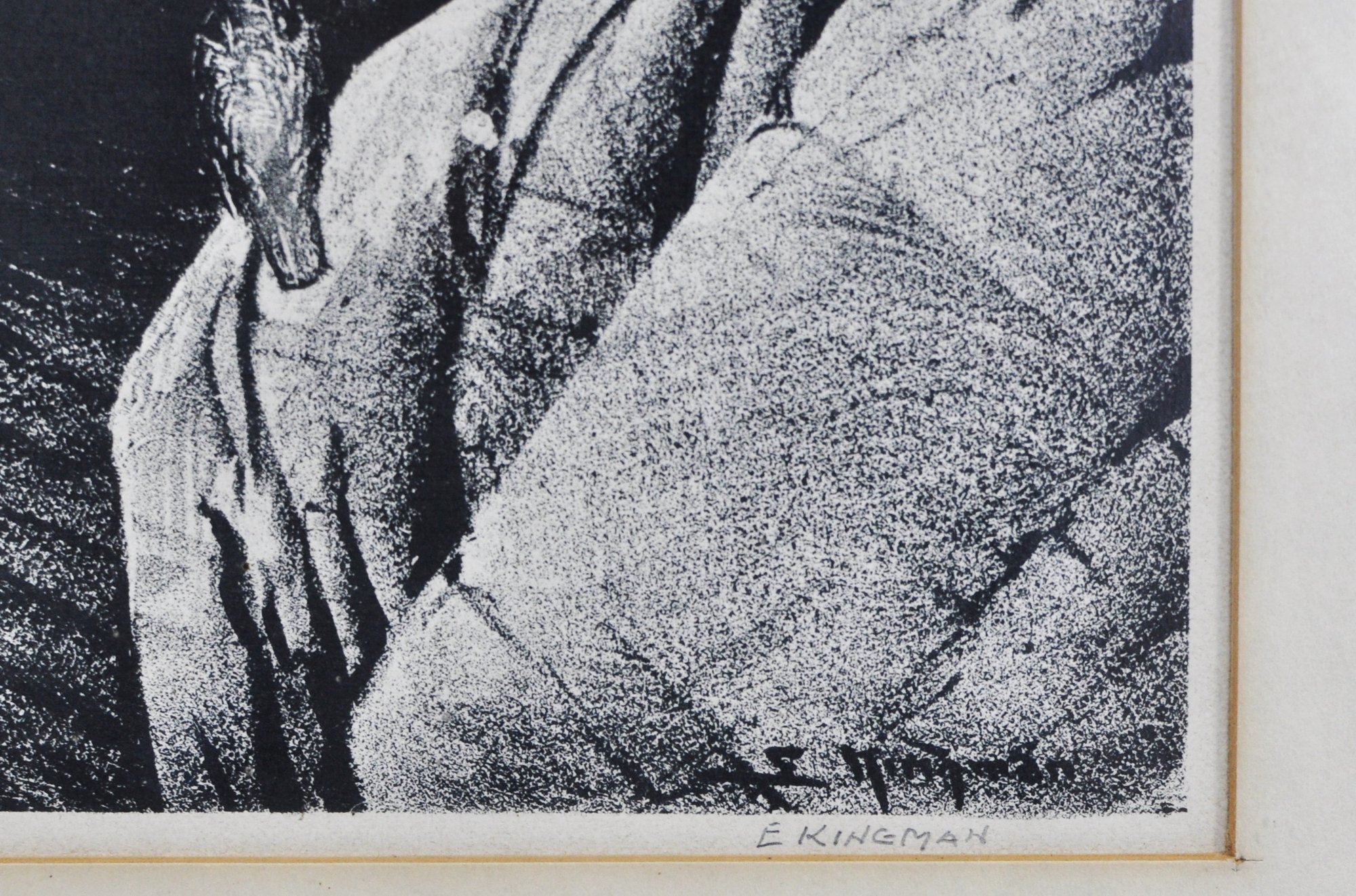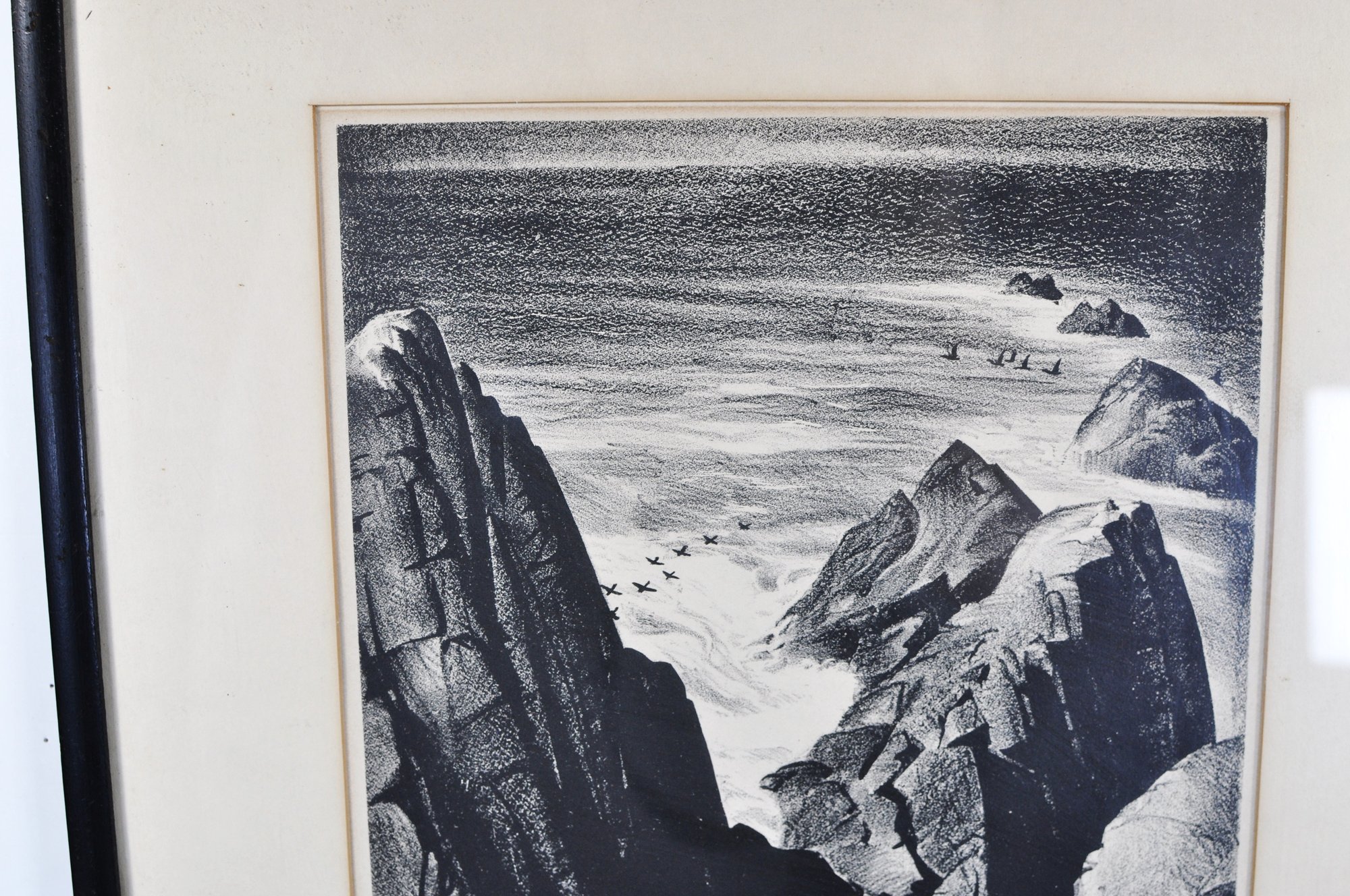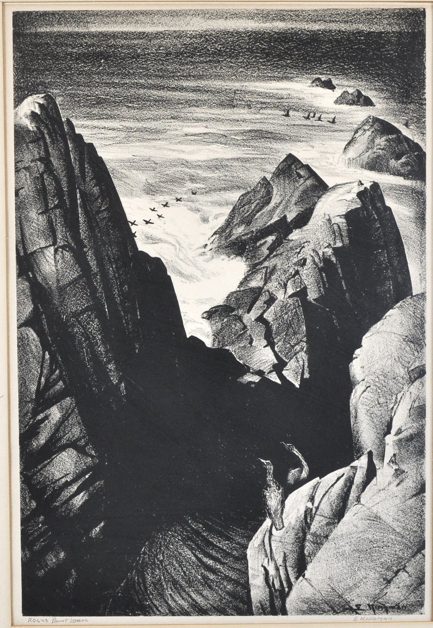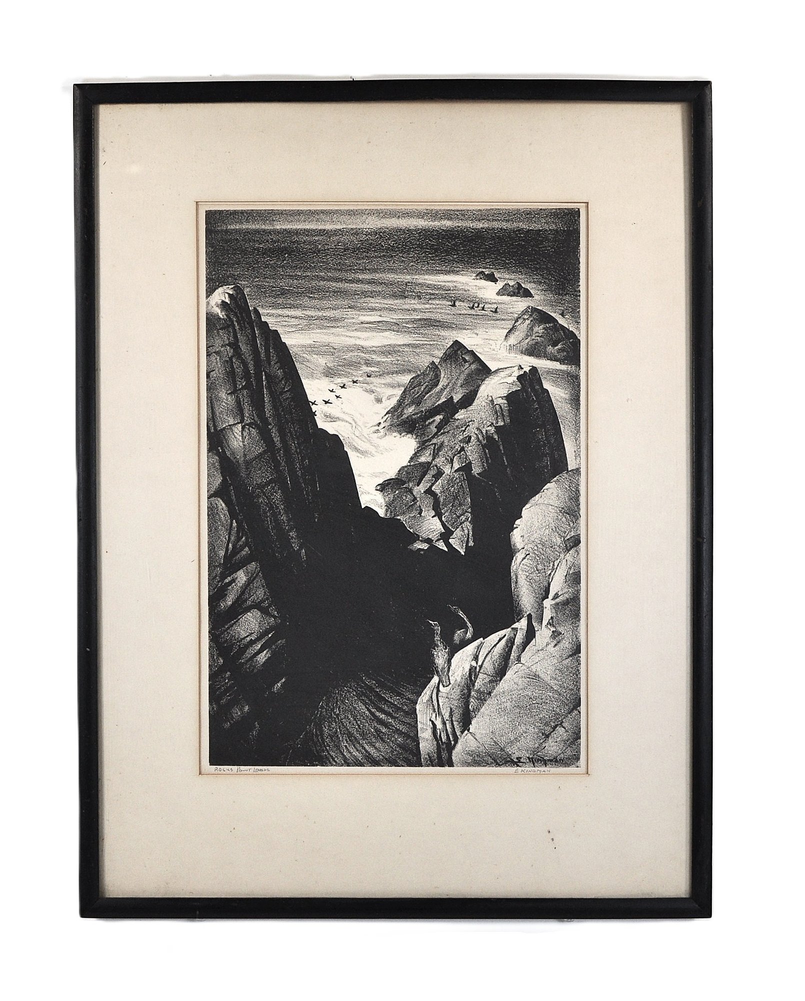 Dramatic black-and-white lithograph depicting rugged coastal rock formations at Point Lobos, with crashing surf and distant seabirds. Titled “Rocks at Point Lobos” and signed E. Kingman in pencil along the lower margin. Presented under mat and black frame.