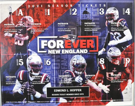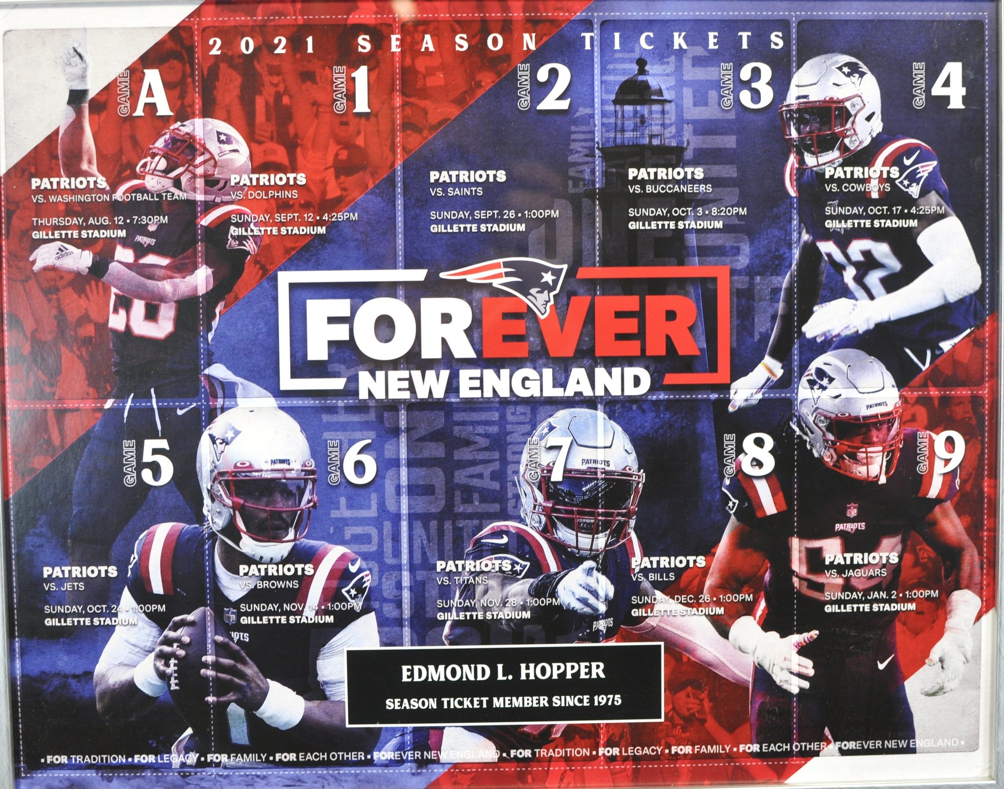 Framed 2021 New England Patriots season ticket holder display featuring the “Forever New England” design with game schedule panels and Patriots players. Personalized for Edmond L. Hopper – Season Ticket Member Since 1975.
