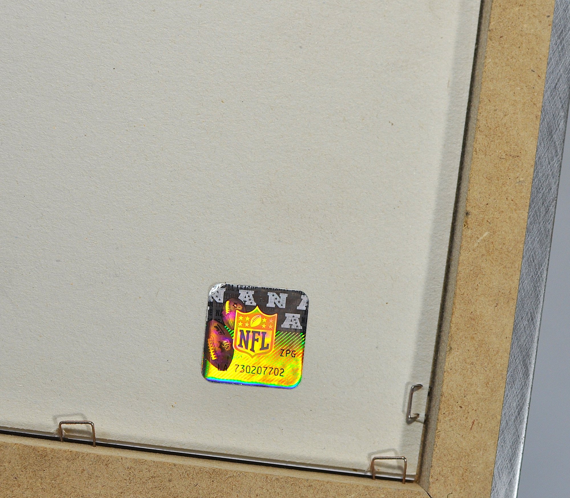 Presented in a modern metal frame with NFL hologram authentication sticker on the reverse.